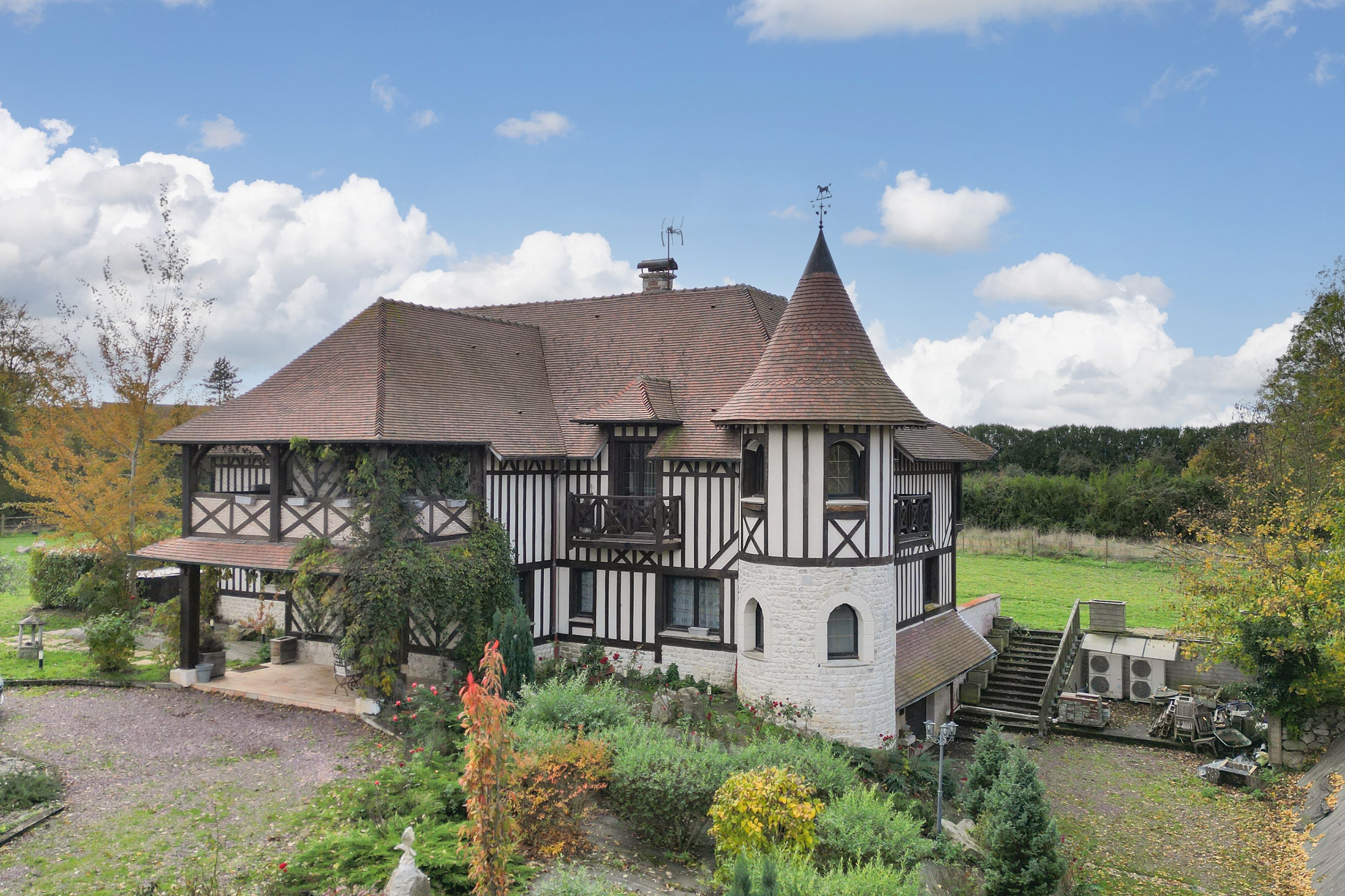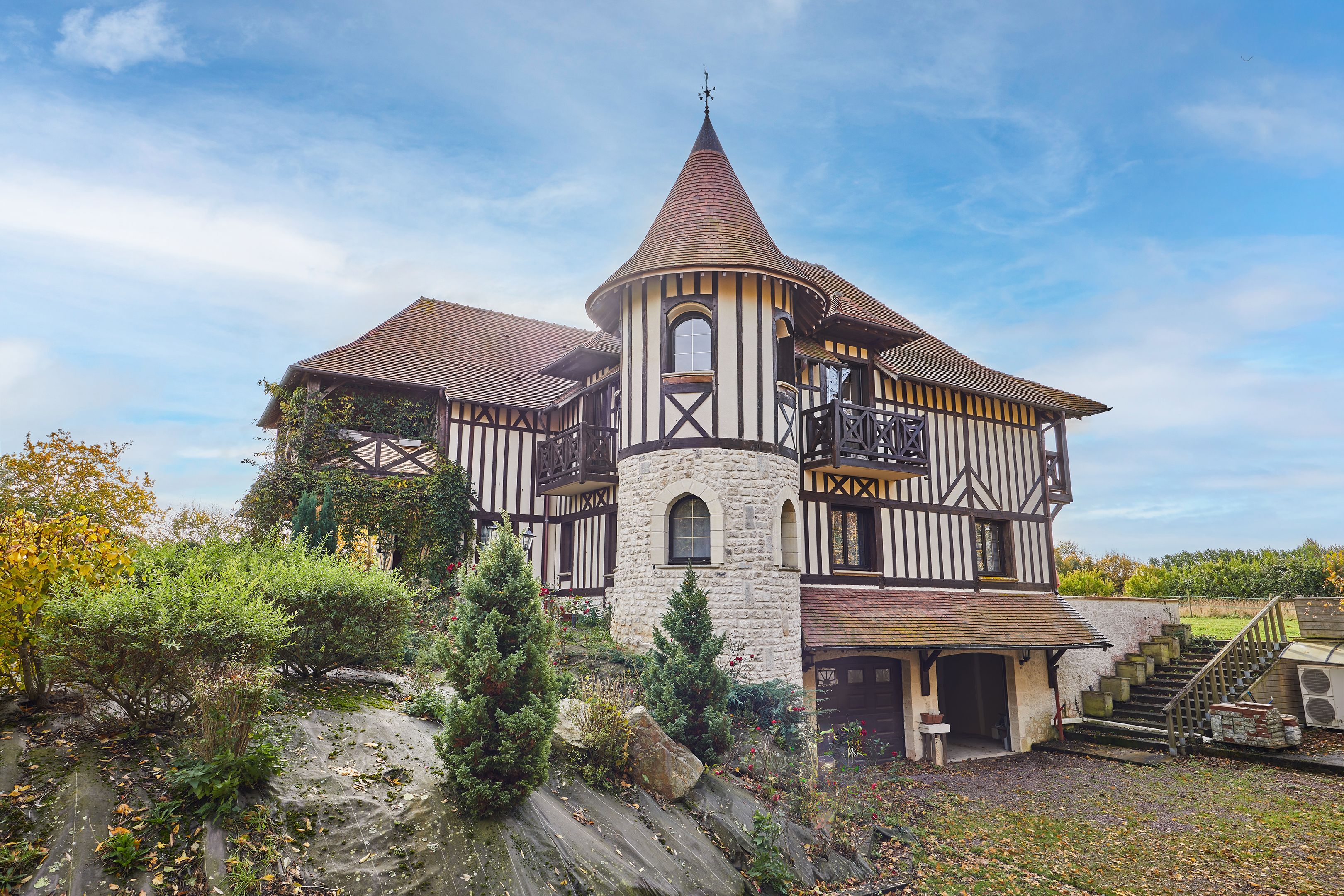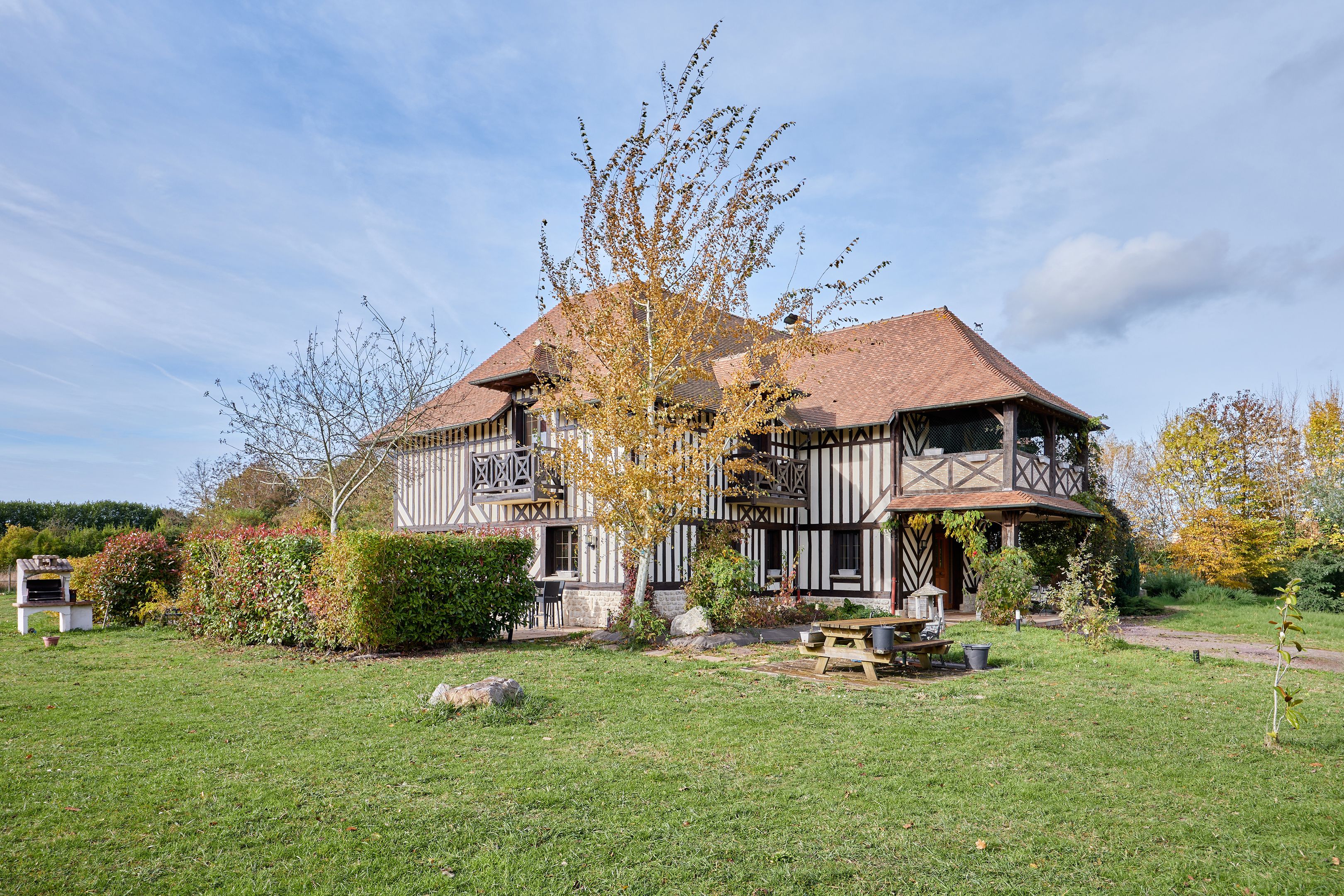 À 10min de Deauville-Trouville, belle propriété normande aux volumes généreux édifiée sur un terrain plat d'environ 6000m2. Au rez-de-chaussée : entrée, salon avec cheminée, salle-à-manger avec poêle, cuisine ouverte, bureau, chambre avec salle d'eau et toilettes, toilettes invités. Au 1er étage : mezzanine desservant 6 chambres chacune avec leur salle d'eau et balcon, deux toilettes indépendants. Au dernier étage : salle de jeux, deux chambres. Sous-sol complet d'environ 200m2 avec espace buanderie et double garage.