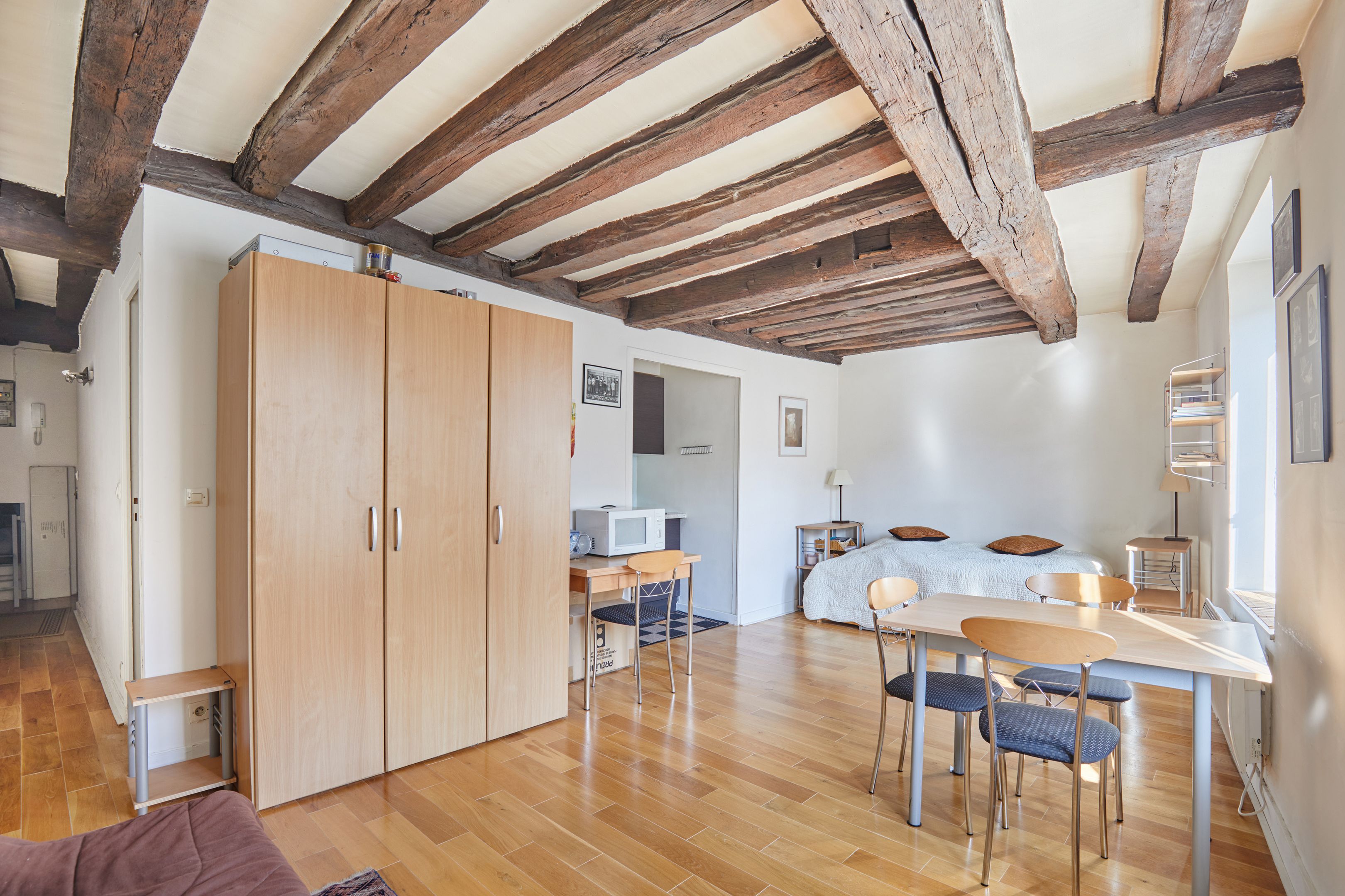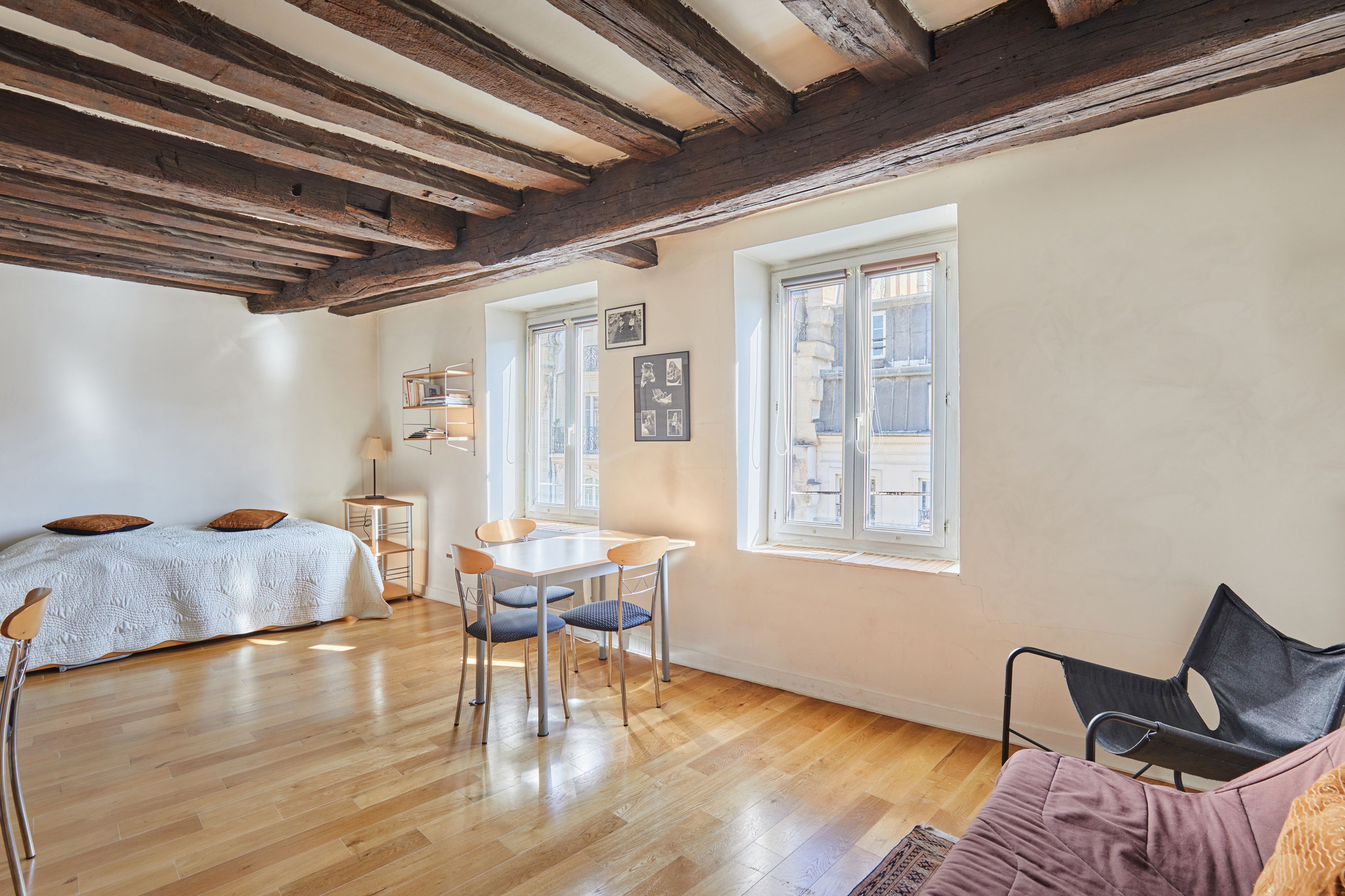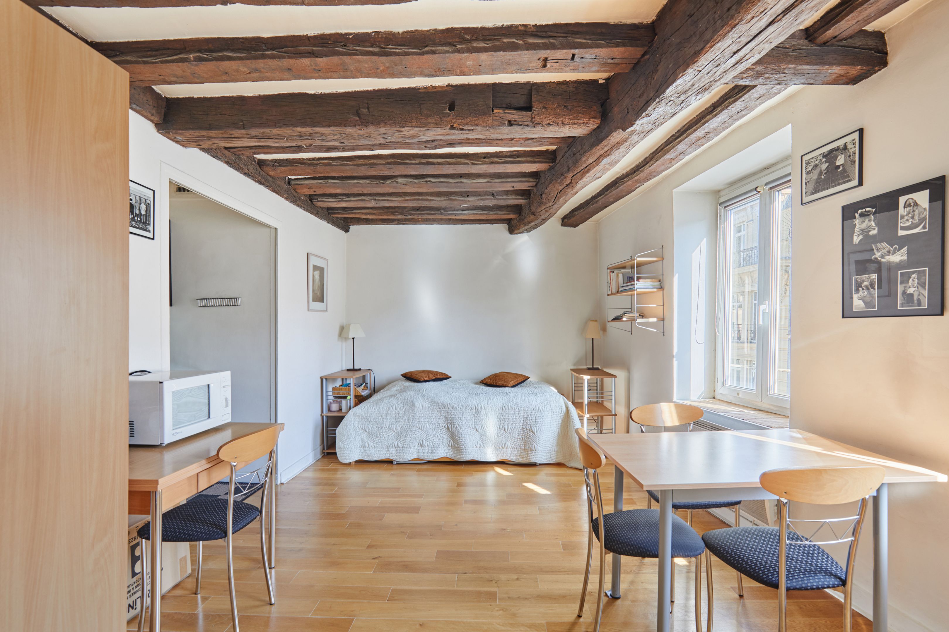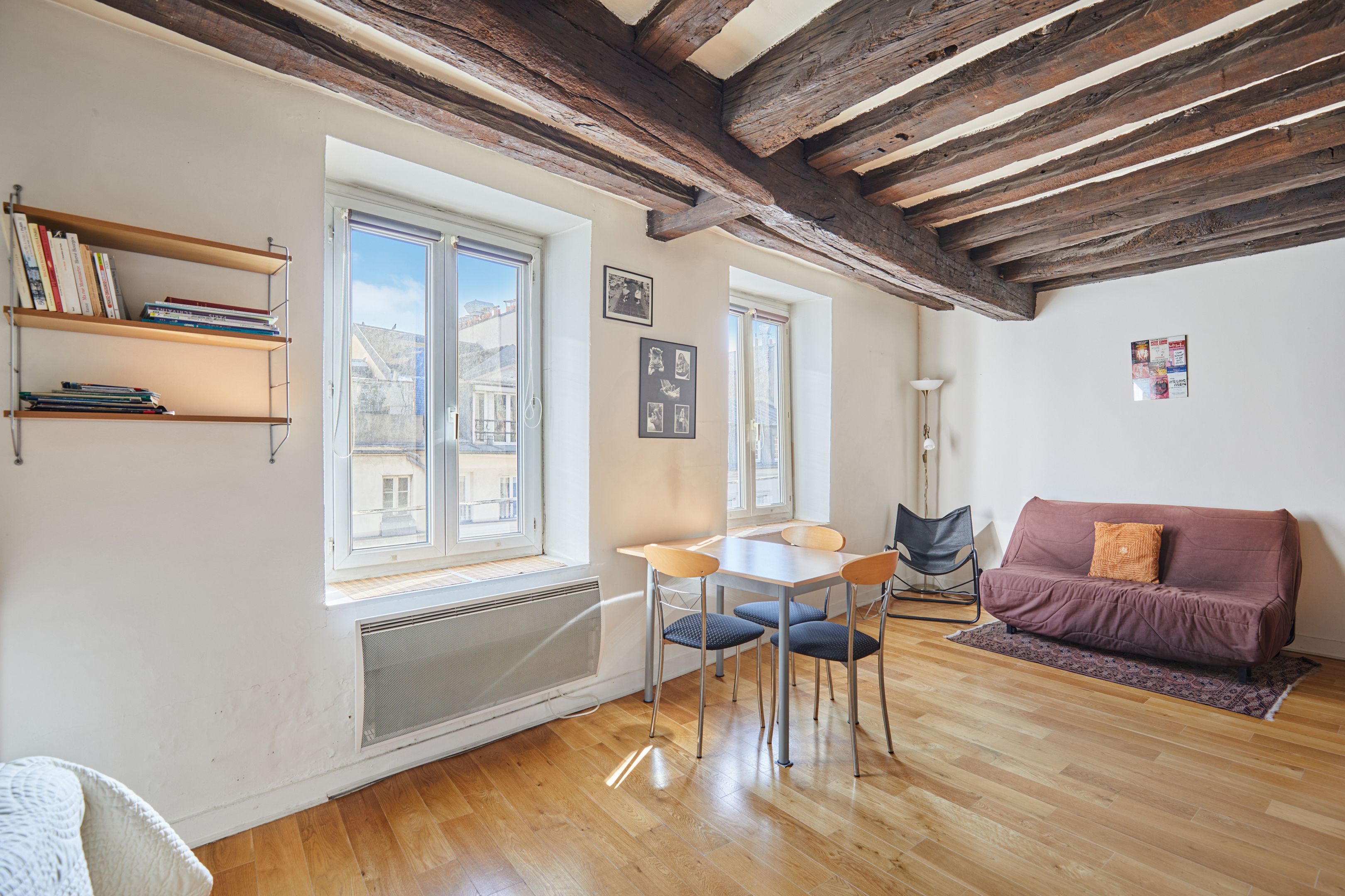 Idéalement situé à deux pas de la place des Victoires et de la rue Montorgueil, au 5ème étage d'un immeuble récemment ravalé, studio très lumineux de 29 m² en bon état général doté d'une petite cuisine et d'une salle d'eau avec toilettes. Parquet et poutres apparentes. Vendu meublé.