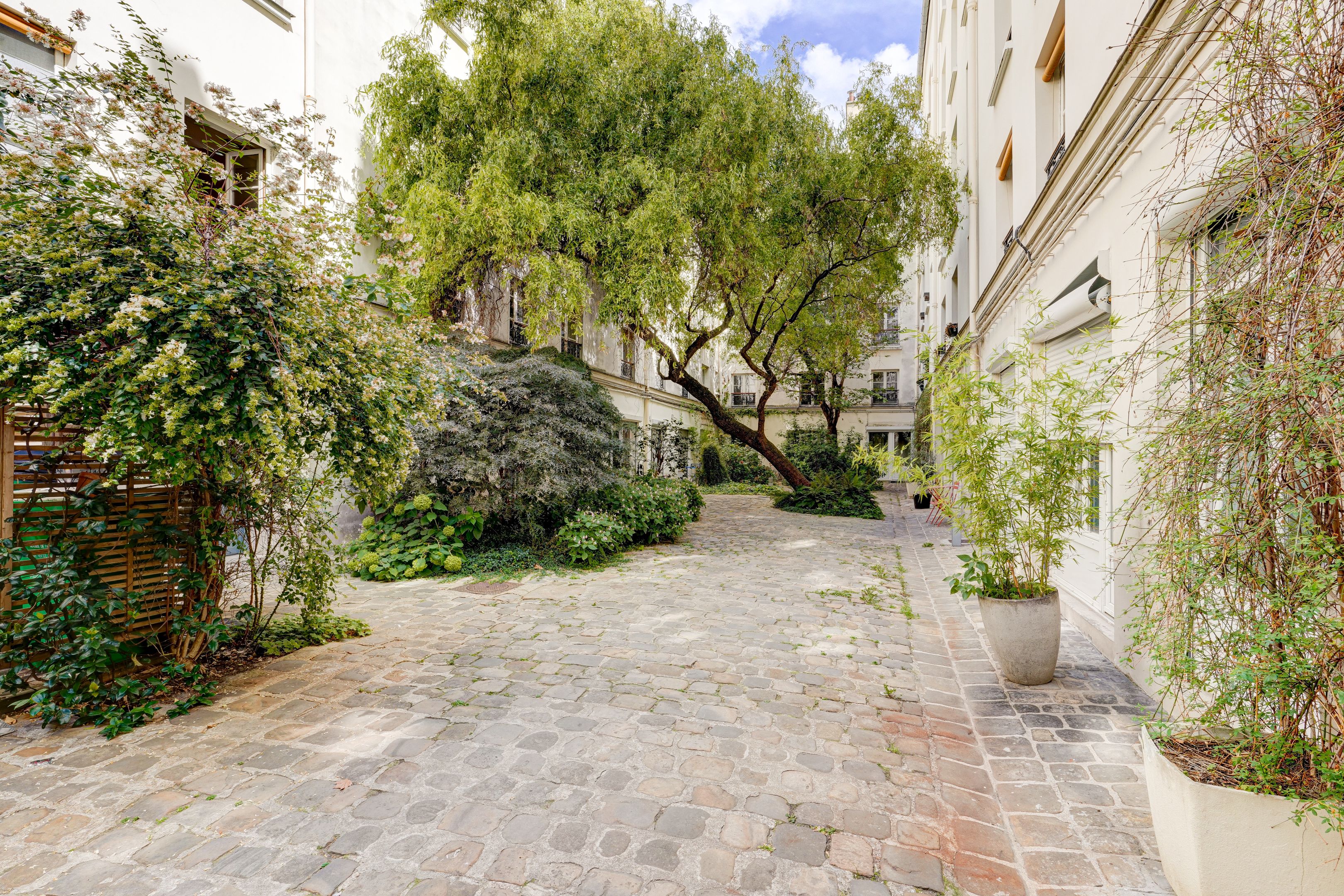 Immeuble de 1810 situé Carreau du Temple. Appartement entièrement rénové avec goût au 2ème étage desservi par escaliers, jouissant du calme d'une cour verdoyante. Entrée, séjour orienté ouest, cuisine ouverte aménagée et équipée, chambre, salle d'eau avec toilettes. Nombreux rangements.