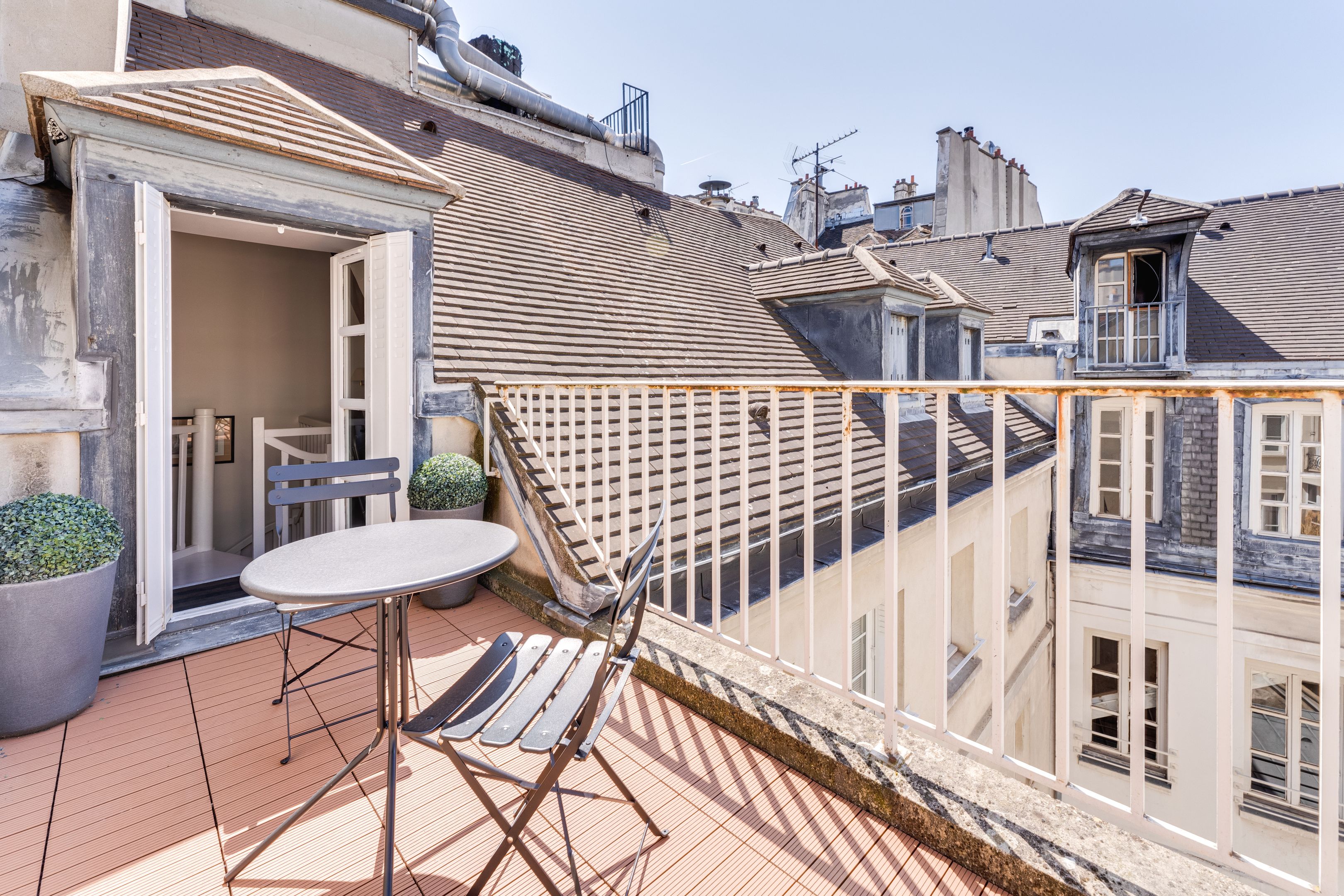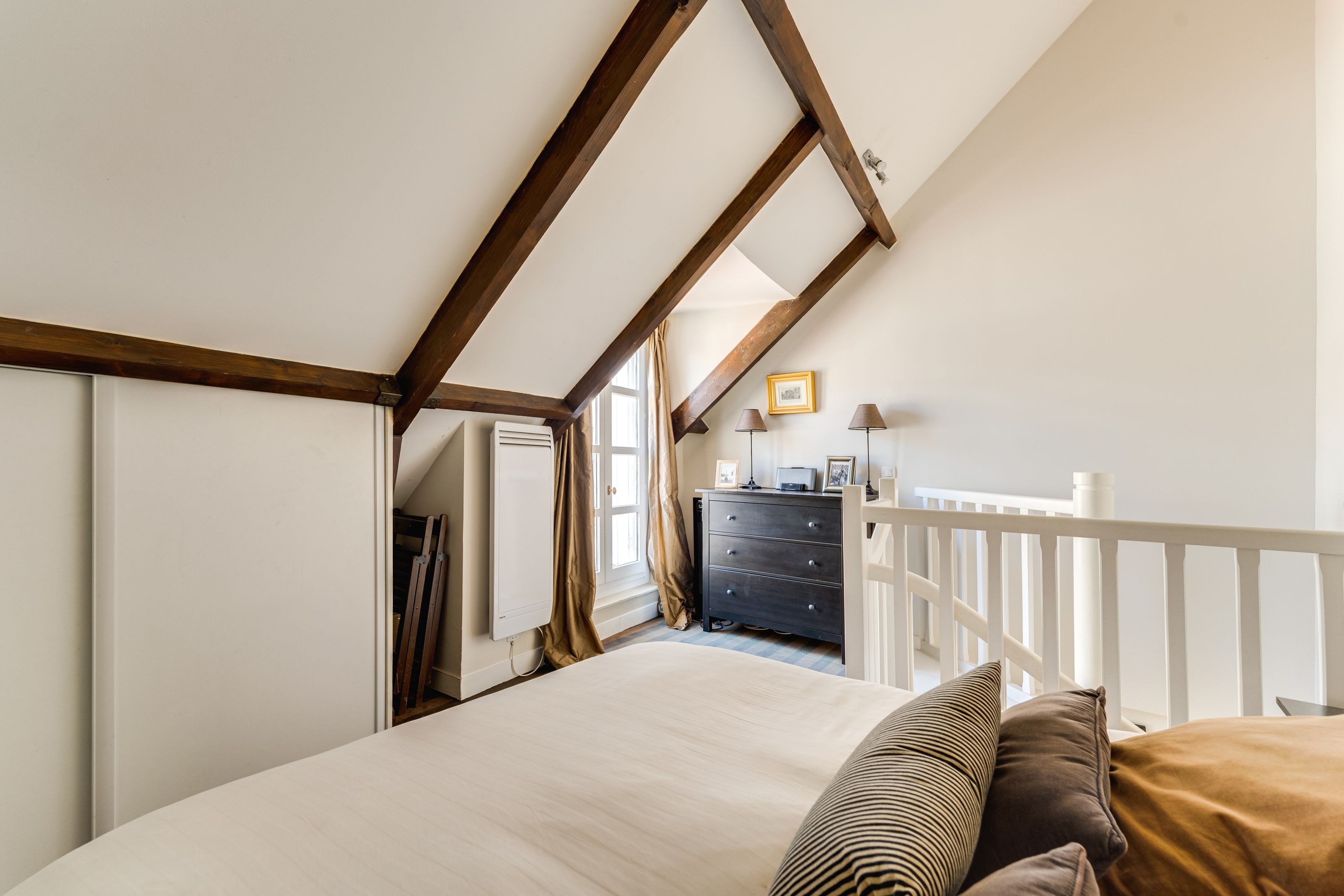 Immeuble ancien du 17e siècle avec des parties communes très bien entretenues, idéalement situé à proximité de la place Saint-André des Arts, charmant duplex de 37,70m² (loi Carrez), au 3e et dernier étage desservi par ascenseur, entièrement refait par architecte avec des matériaux de qualité, et bénéficiant d'une belle luminosité et d'un calme parfait. Au 3e étage : entrée, séjour, cuisine séparée, toilettes invités, buanderie. À l’étage supérieur : chambre dotée d'une terrasse ensoleillée de 6m², salle de douche avec toilettes.