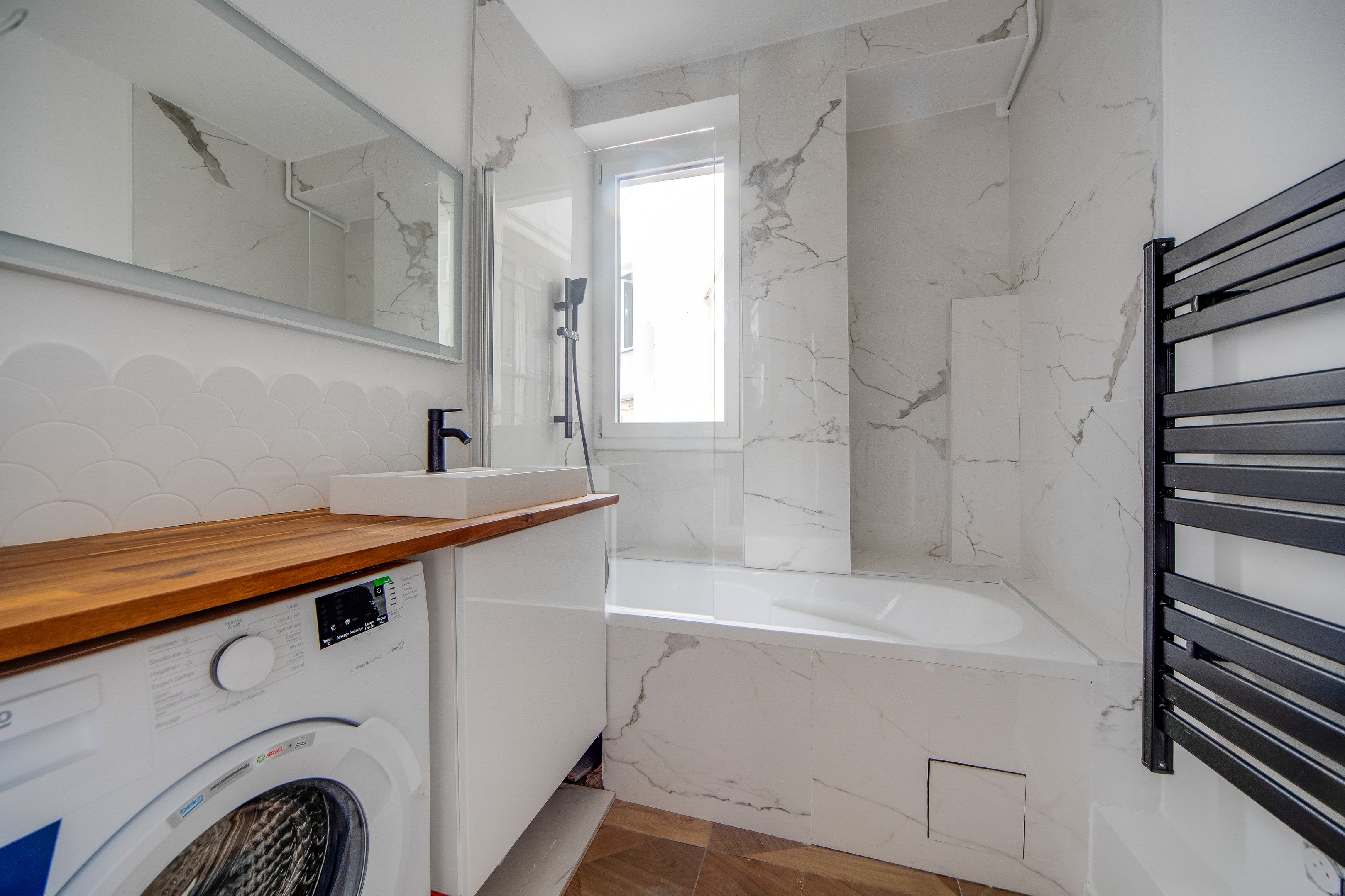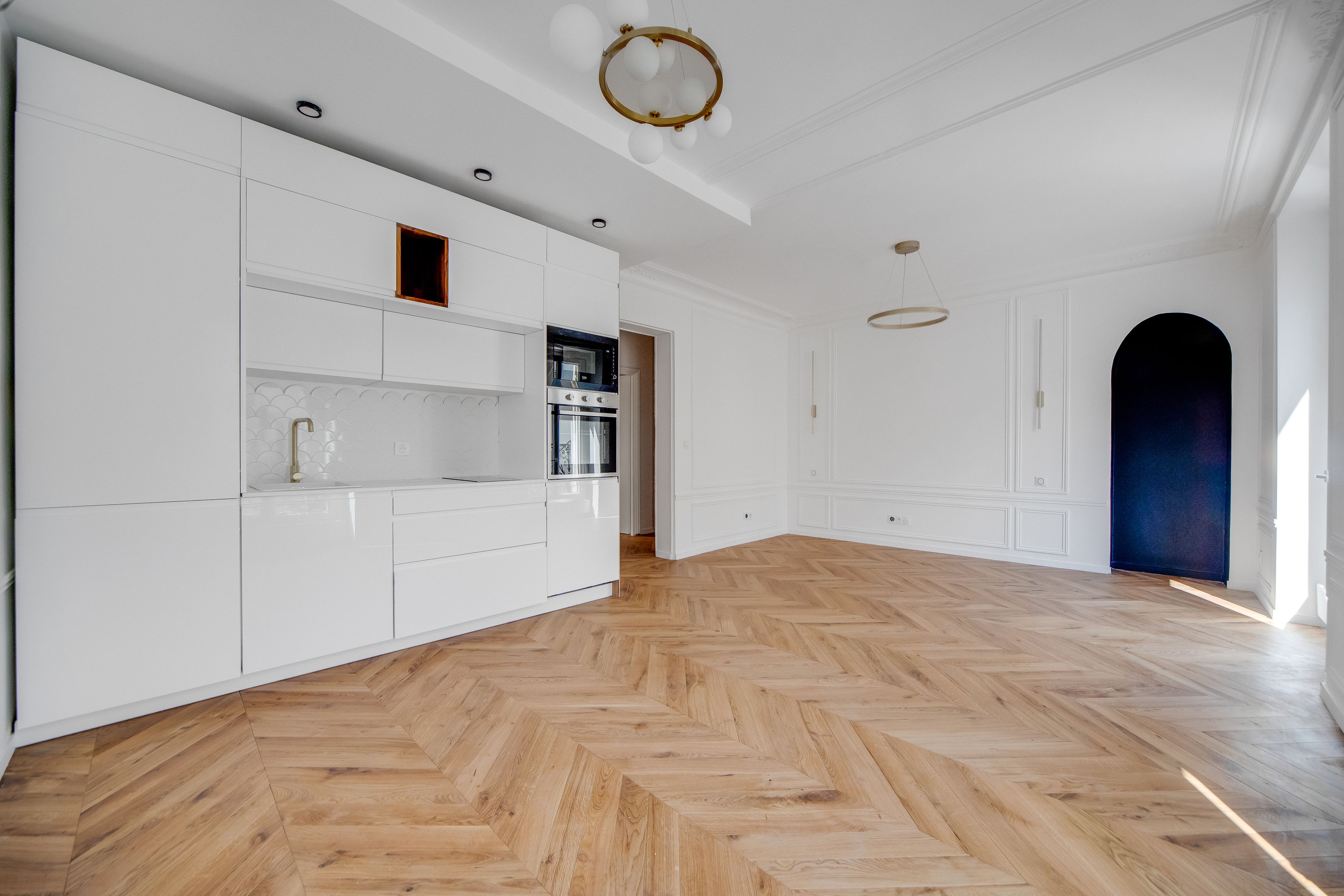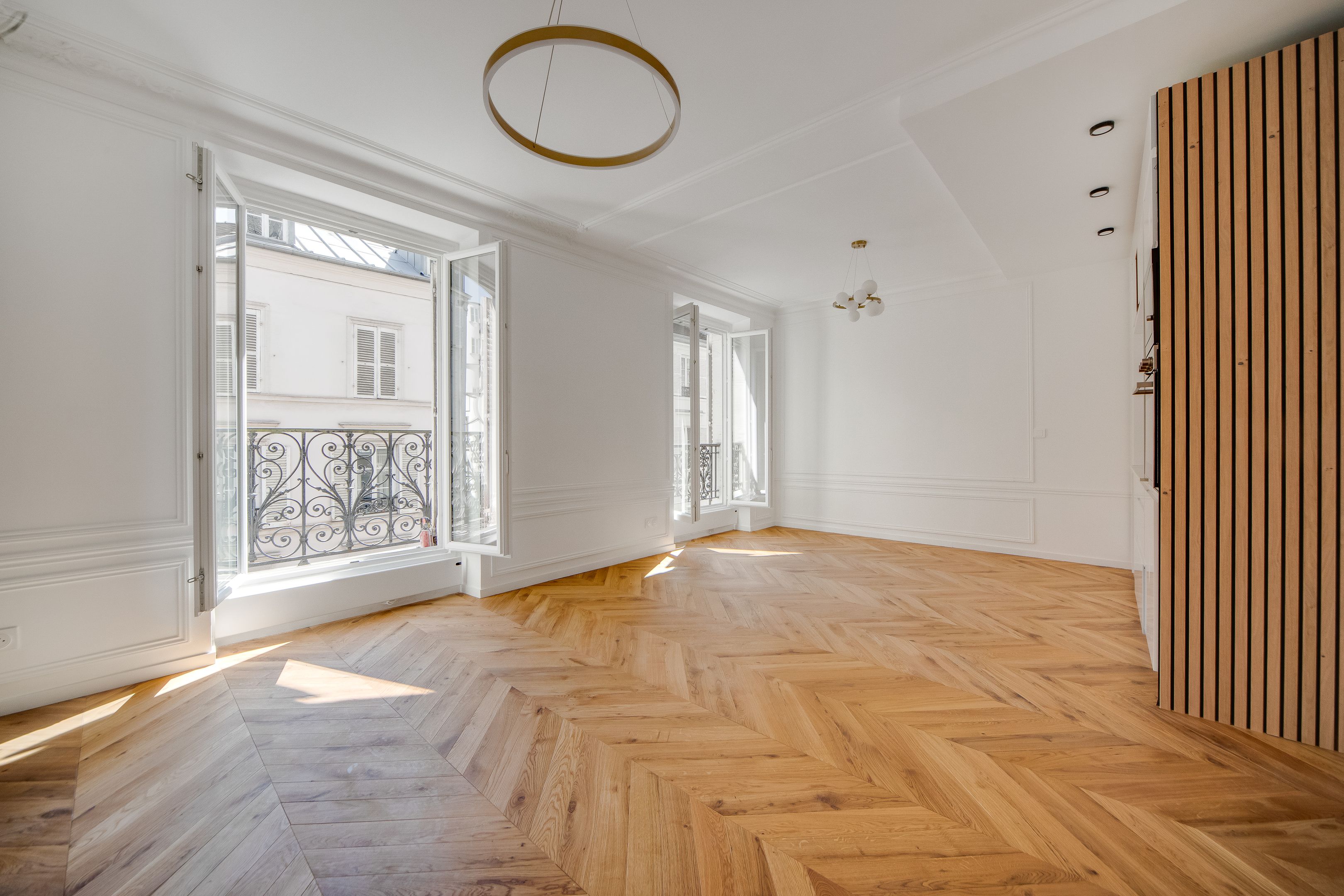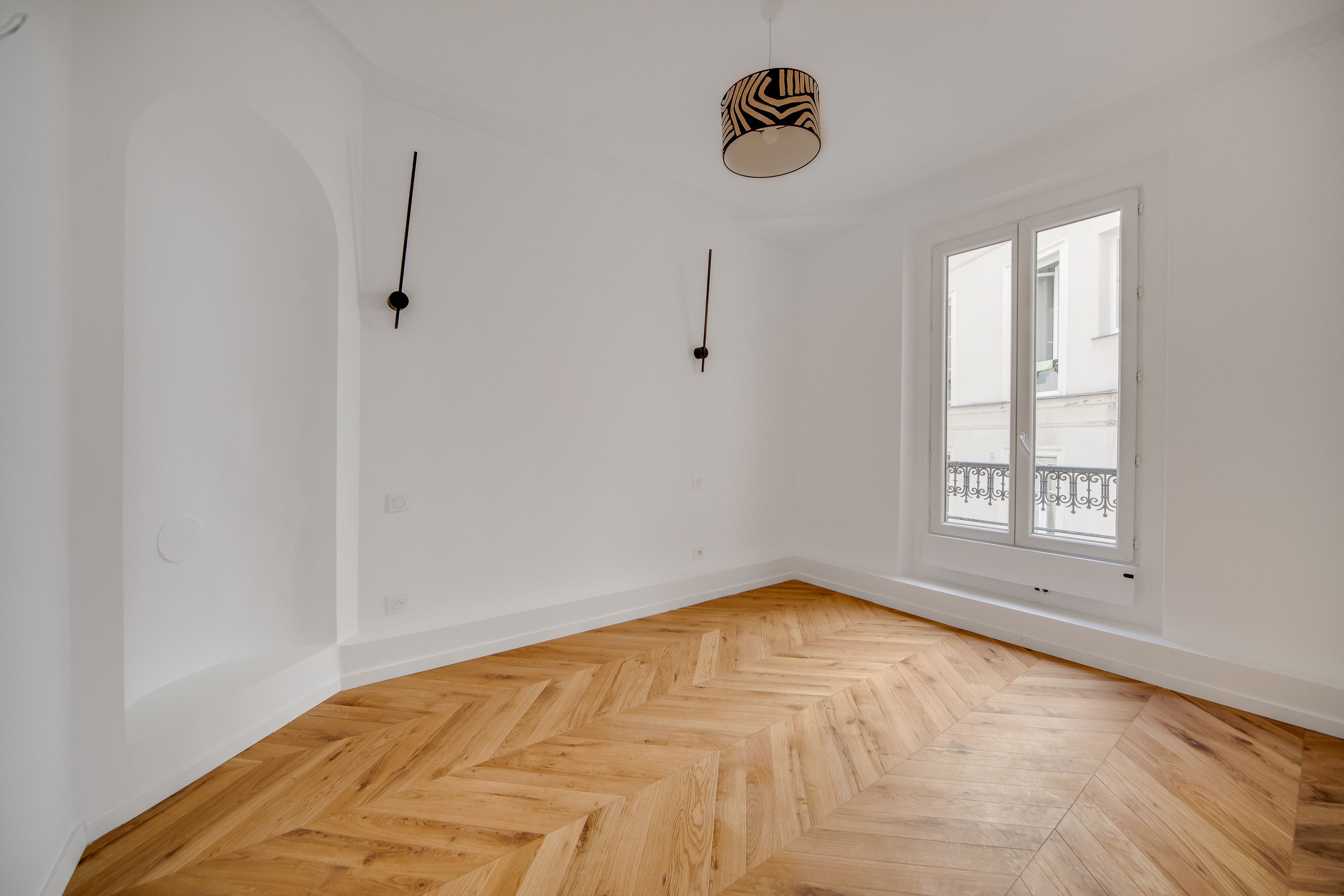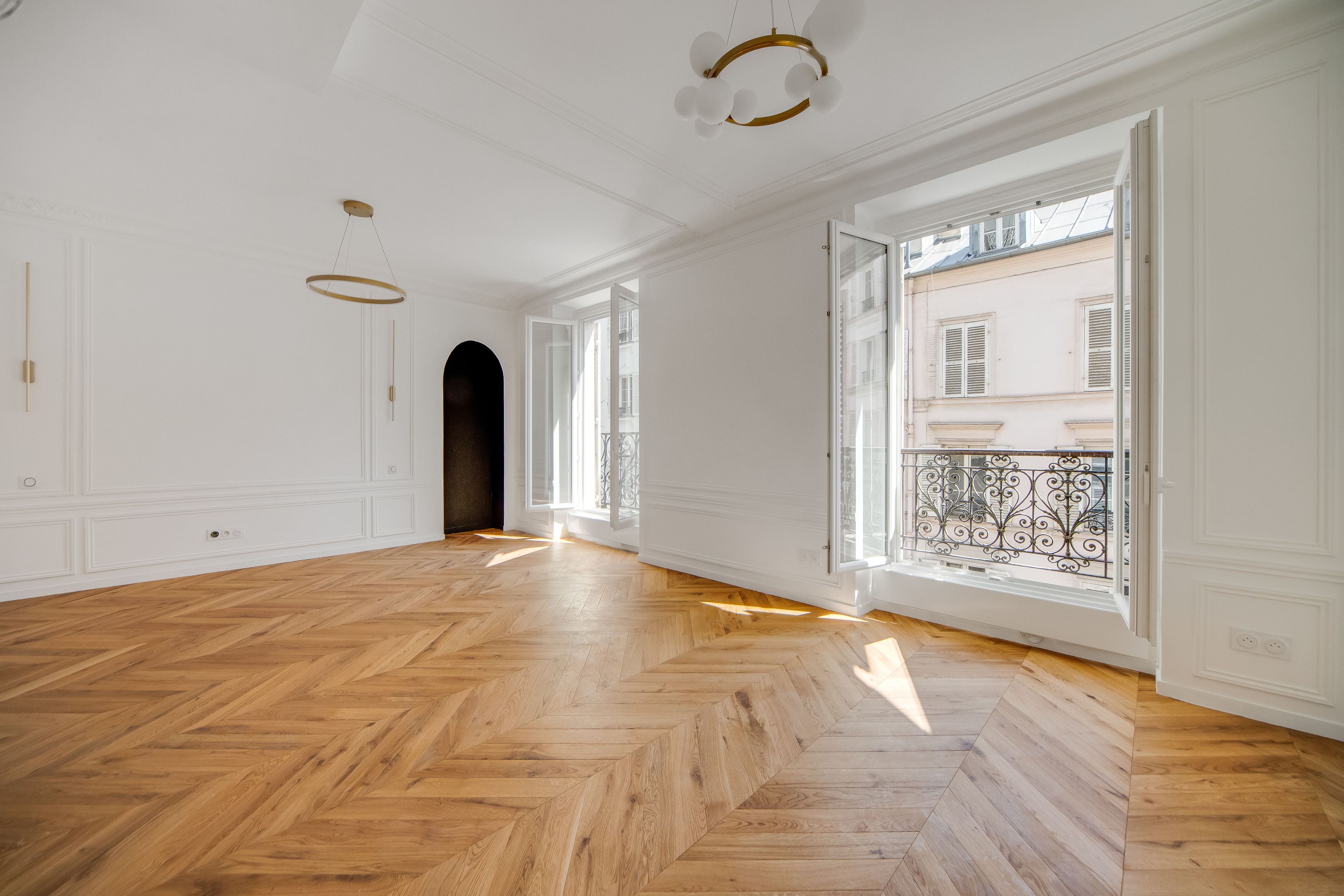 Étoile - Ternes, idéalement situé près des nombreux commerces et transports. Au 2ème étage accessible par ascenseur d'un immeuble ancien de belle facture édifié en 1900, bel appartement lumineux d'une surface de 44,03 m² loi Carrez (45,33 m² au sol) entièrement rénové avec goût, au charme de l'ancien et bénéficiant d'un plan parfait sans perte d'espace. Entrée, séjour orienté à l'est ouvrant sur un large balcon, cuisine ouverte, chambre au calme sur cour, salle d'eau avec toilettes, dégagement, nombreux rangements. Une cave.