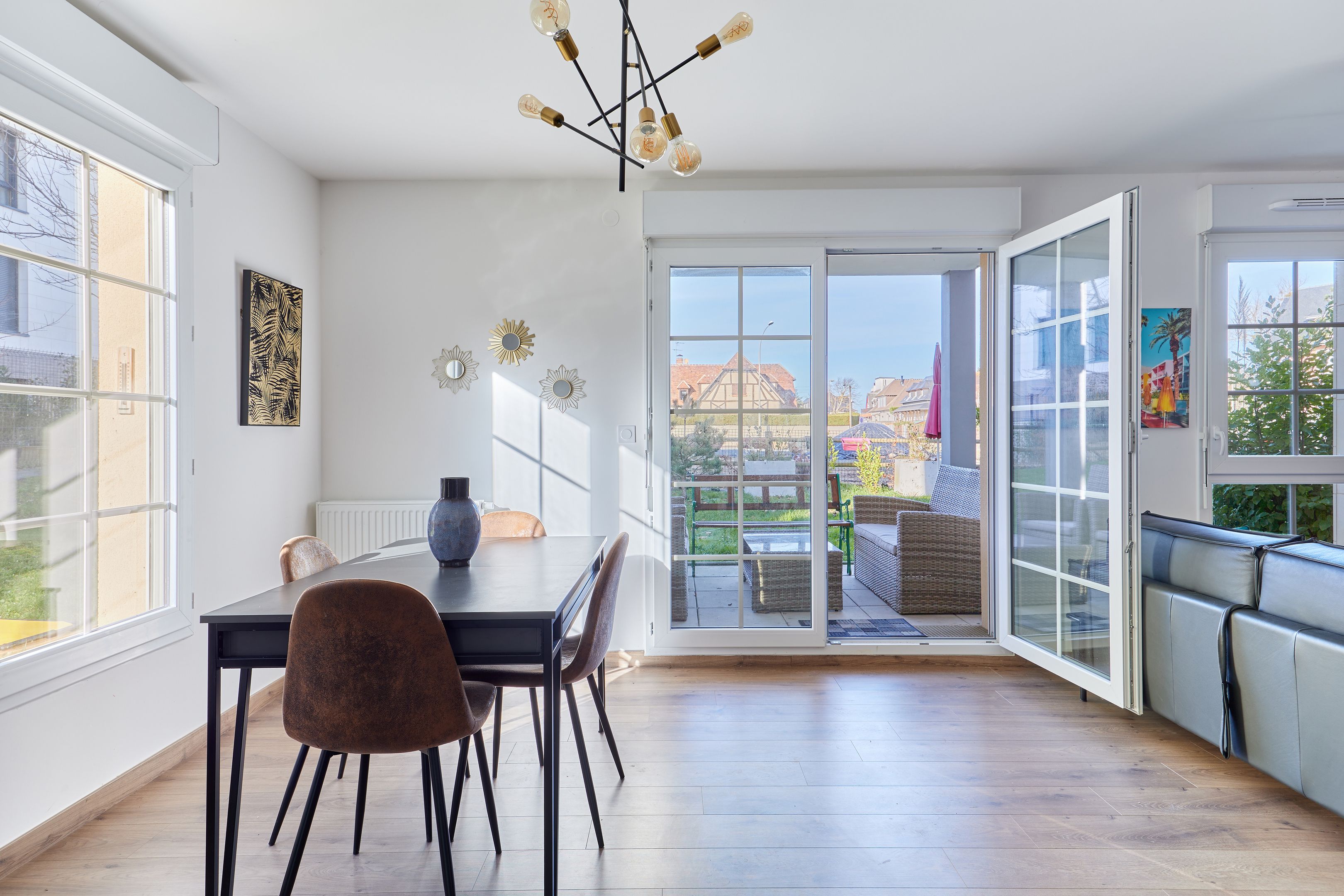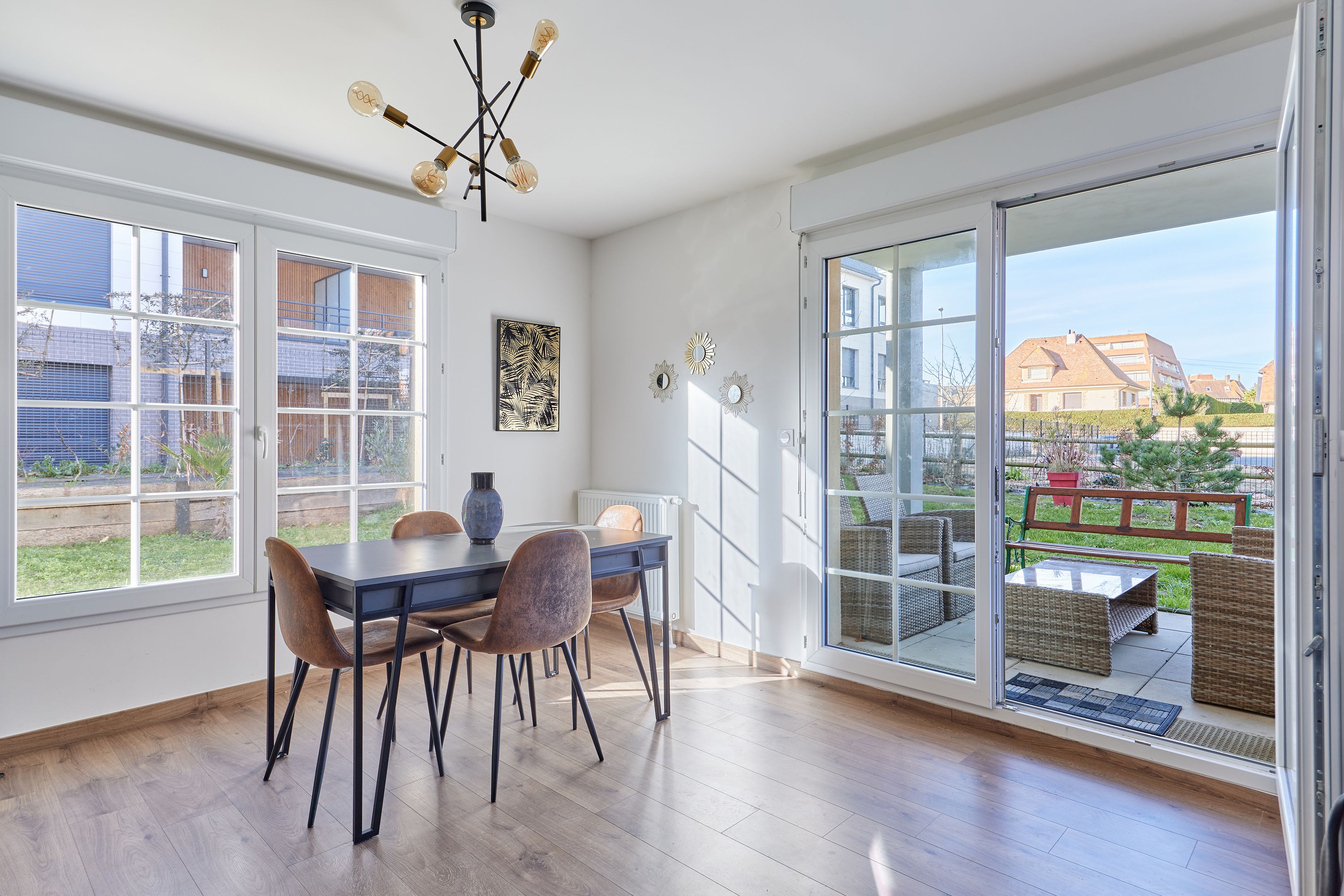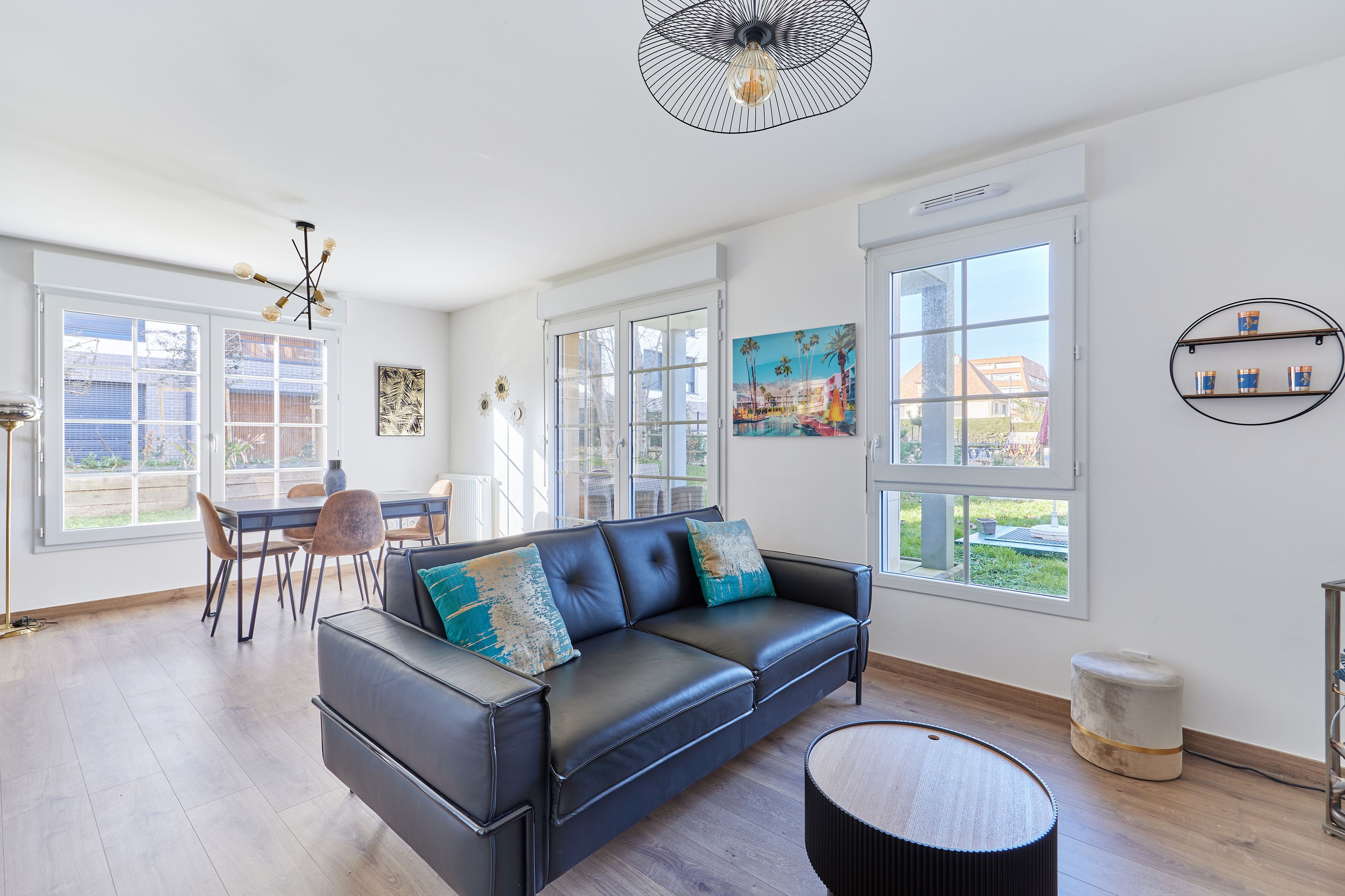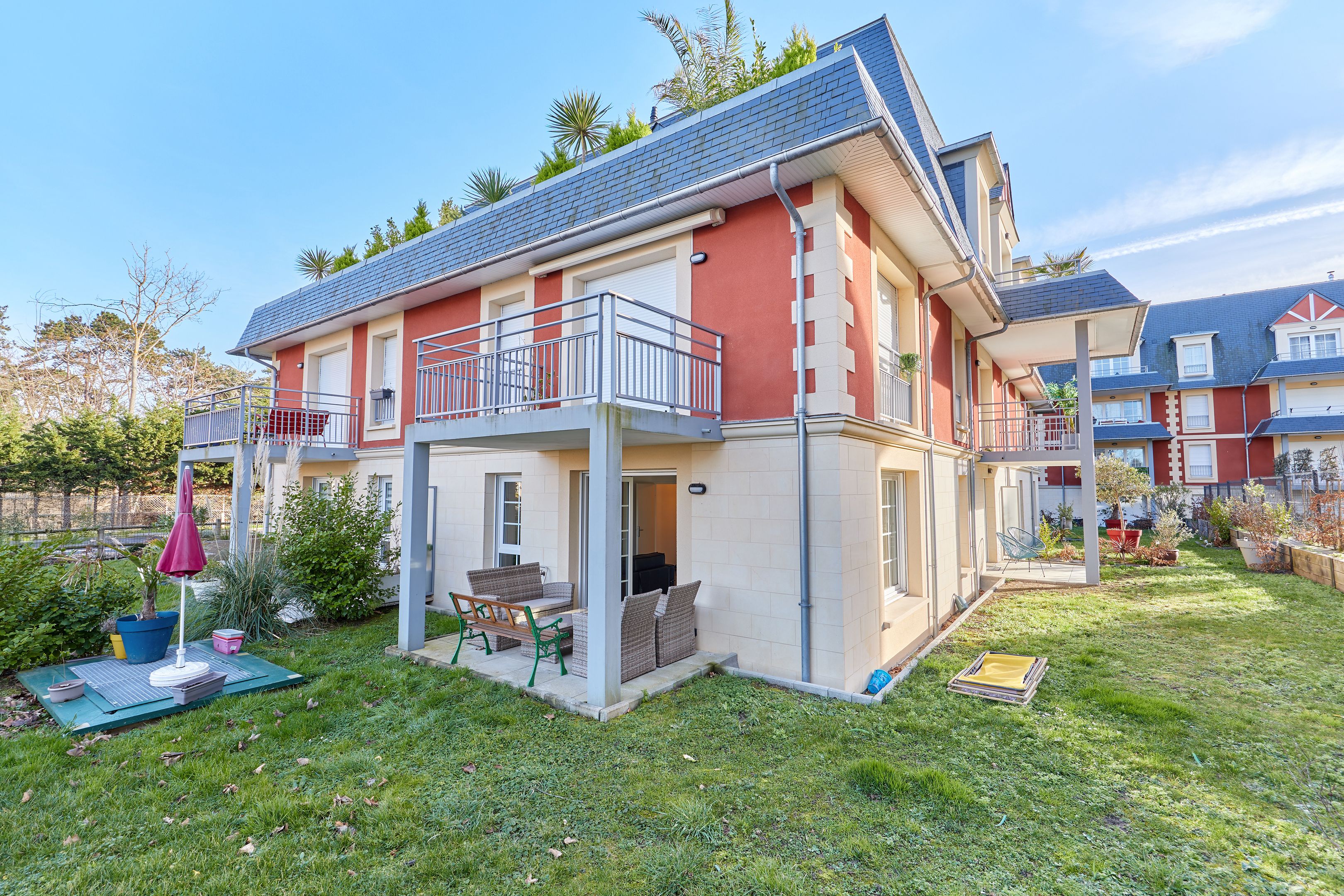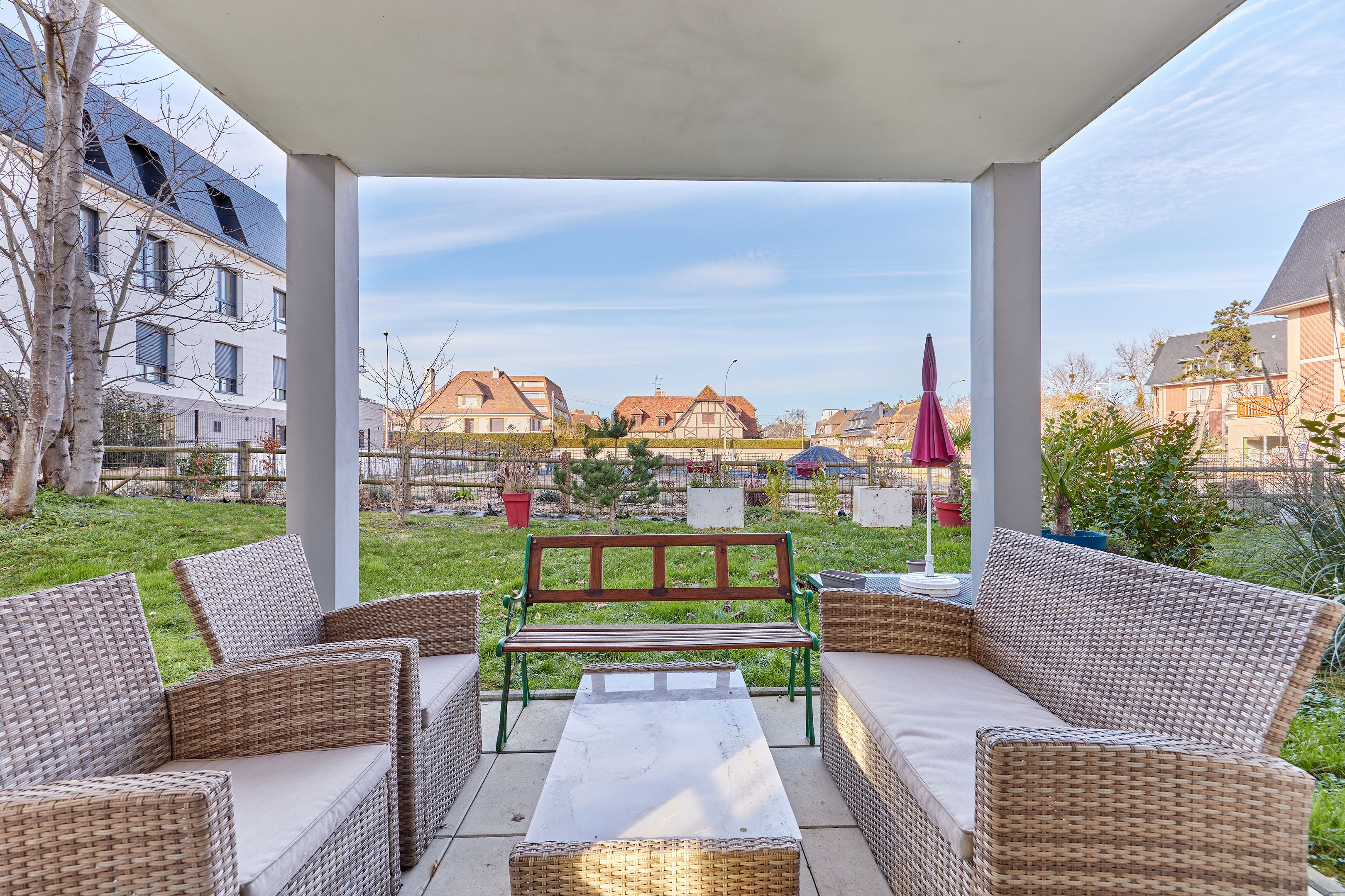 À 250 m de la plage des Ammonites, en rez-de-jardin d'une résidence de 2021, bel appartement de 65 m². Entrée avec placards, séjour ouvert sur le jardin exposé nord-ouest, cuisine équipée, deux chambres dont une avec placards, l'autre disposant d'un accès terrasse, salle d'eau, toilettes indépendantes. Place de parking et cave en sous-sol desservis par ascenseur.