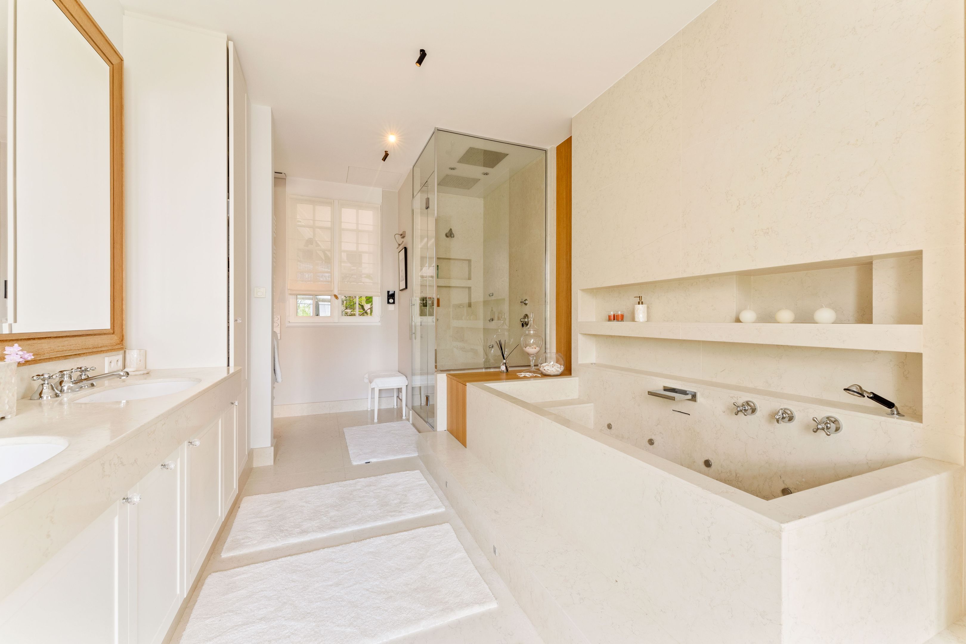 La partie nuit se compose de deux chambres avec lit double dont une master bedroom avec baignoire spa et douche/hammam.