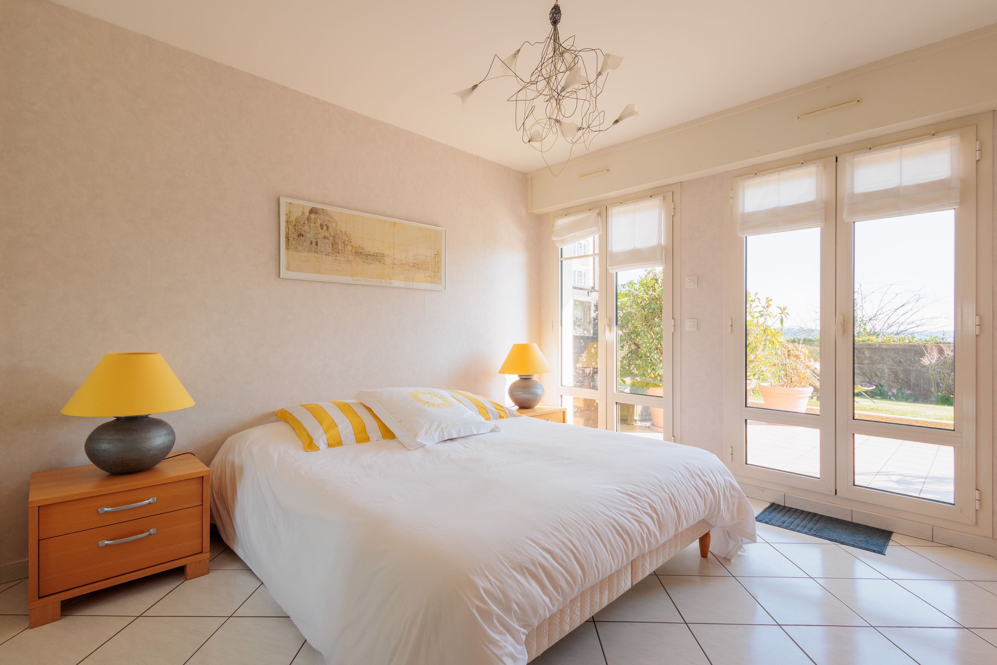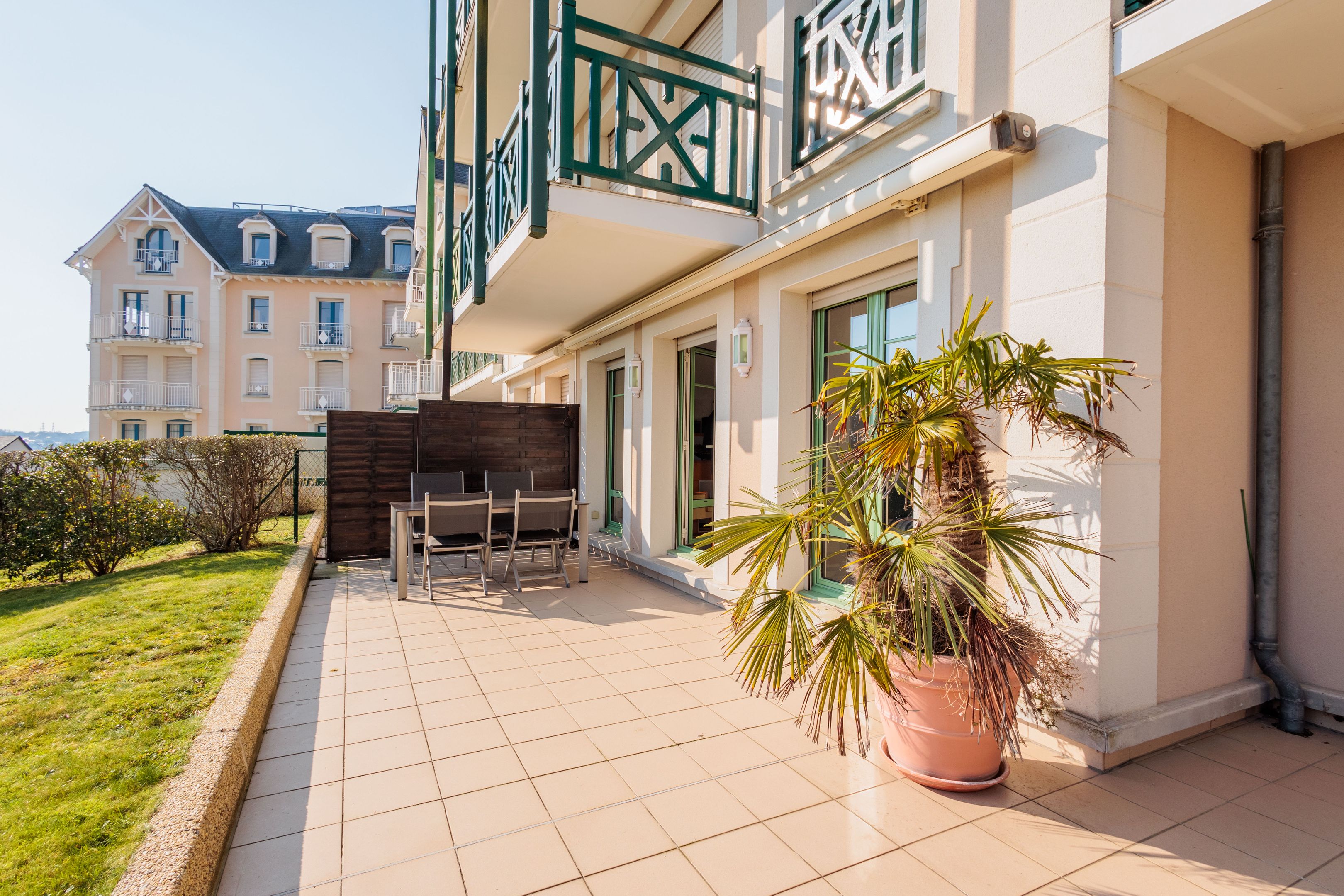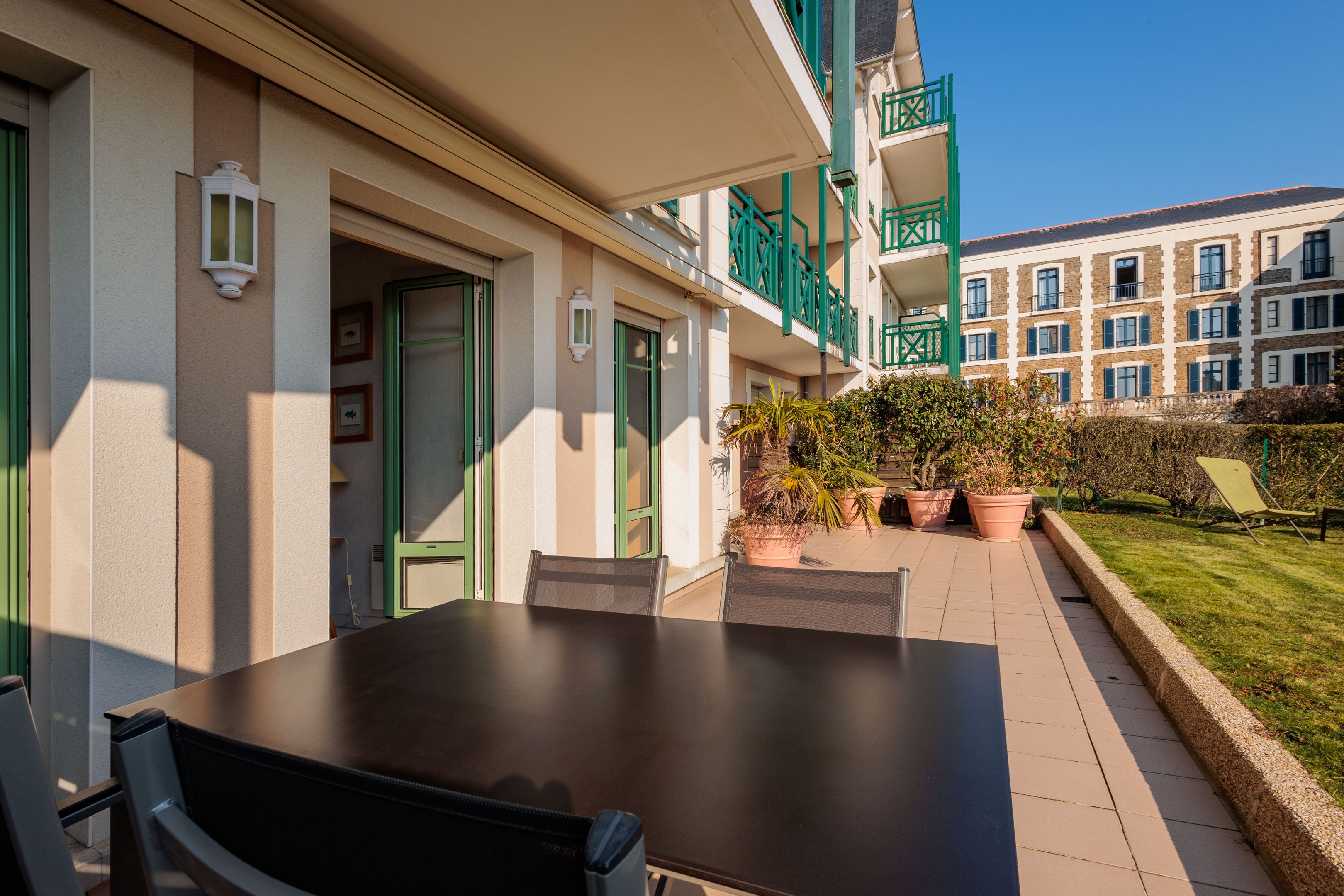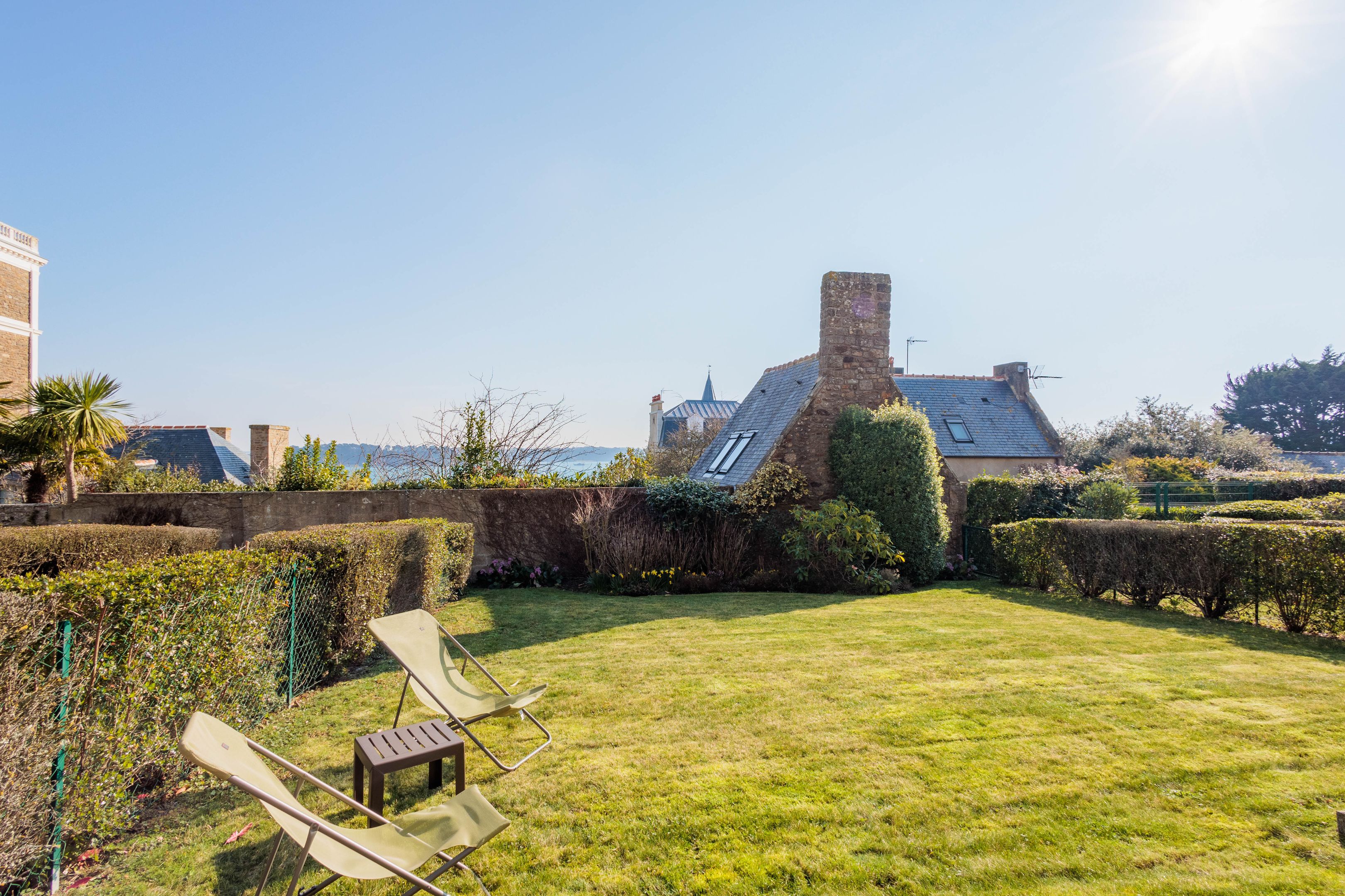 "Les Jardins du Tennis Club" - Au cœur de Dinard, à proximité immédiate des commerces, de la plage et du port de plaisance, dans une résidence calme et bien entretenue. Agréable appartement en rez-de-jardin bénéficiant d'un emplacement de premier plan, d'une superbe vue mer et de beaux espaces extérieurs. Entrée, agréable séjour avec large vue sur la baie du Prieuré et la Tour Solidor ouvrant sur terrasse et jardin à usage privatif de 140m² environ, cuisine ouverte équipée, 2 chambres de belle taille avec placard toute hauteur et accès sur le jardin, salle de bains et toilettes séparées. Cave de 3㎥ à quelques mètres. Place de stationnement intérieur. Garage à vélos et court de tennis à usage partagé. Services quotidiens d'une gardienne.