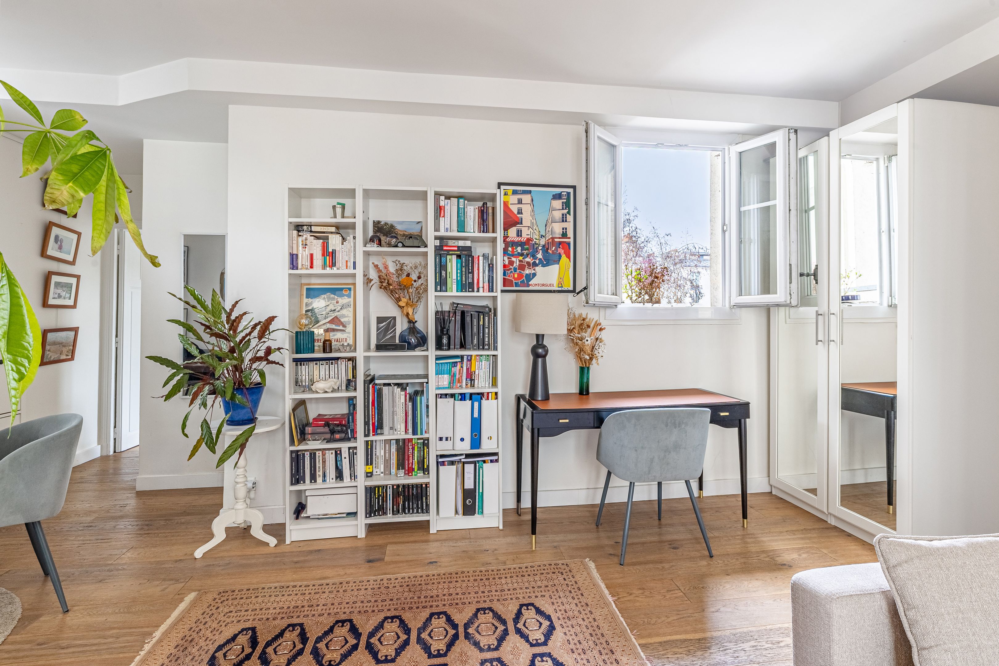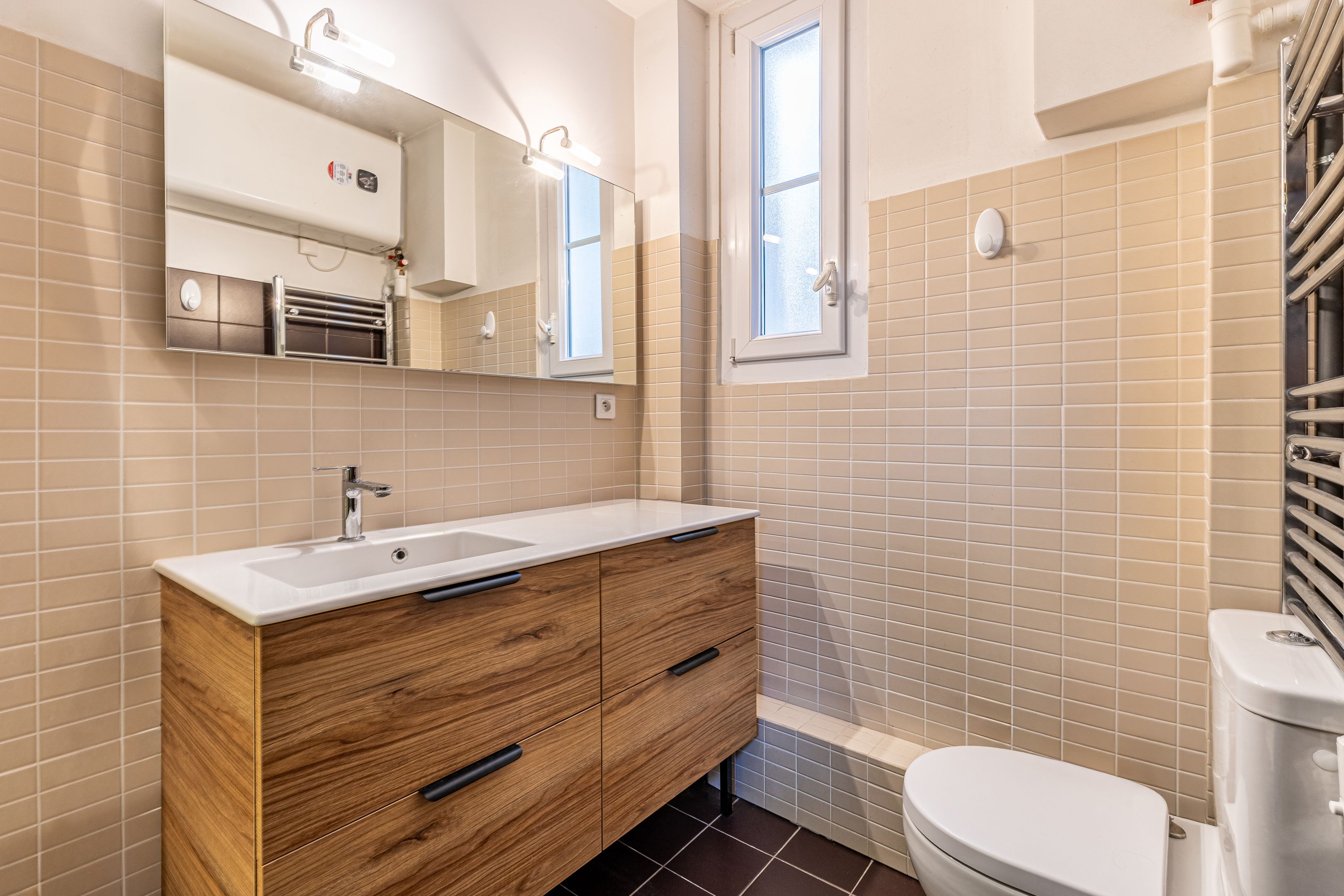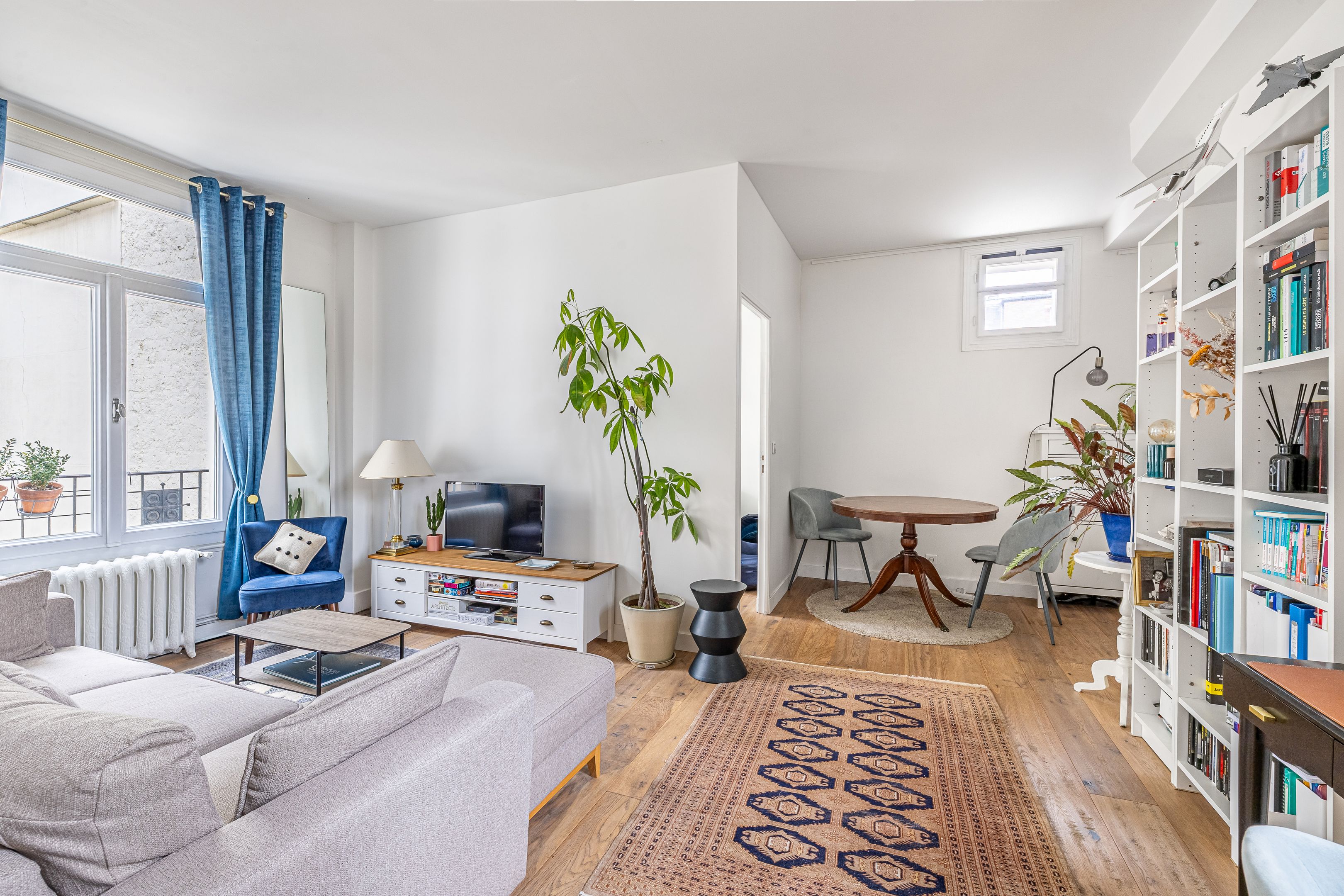 À proximité du Square de Clignancourt et de la Mairie du XVIIIe, au 4ème étage d'un immeuble édifié en 1920 desservi par ascenseur, charmant appartement de trois pièces au calme sur cour.