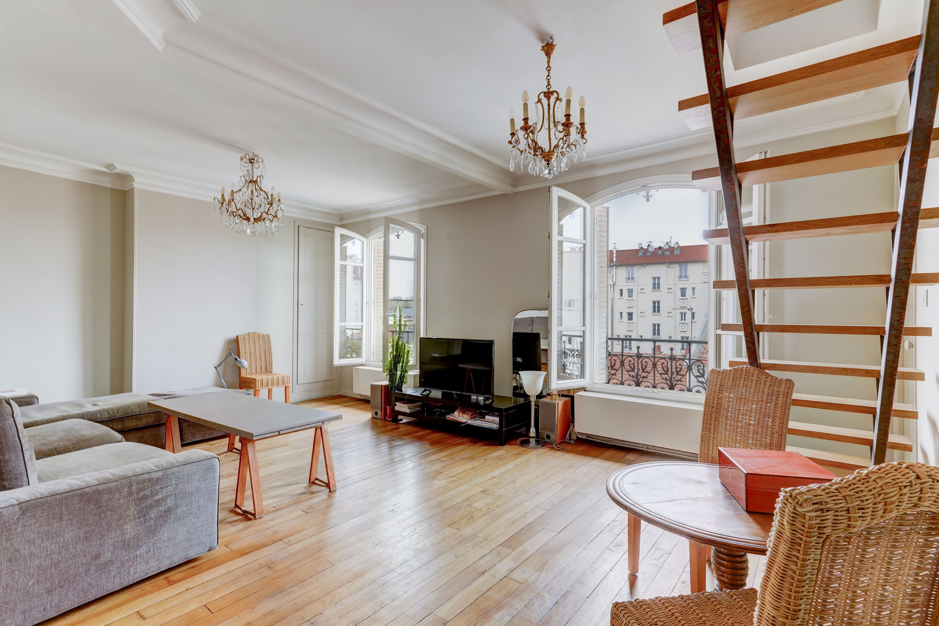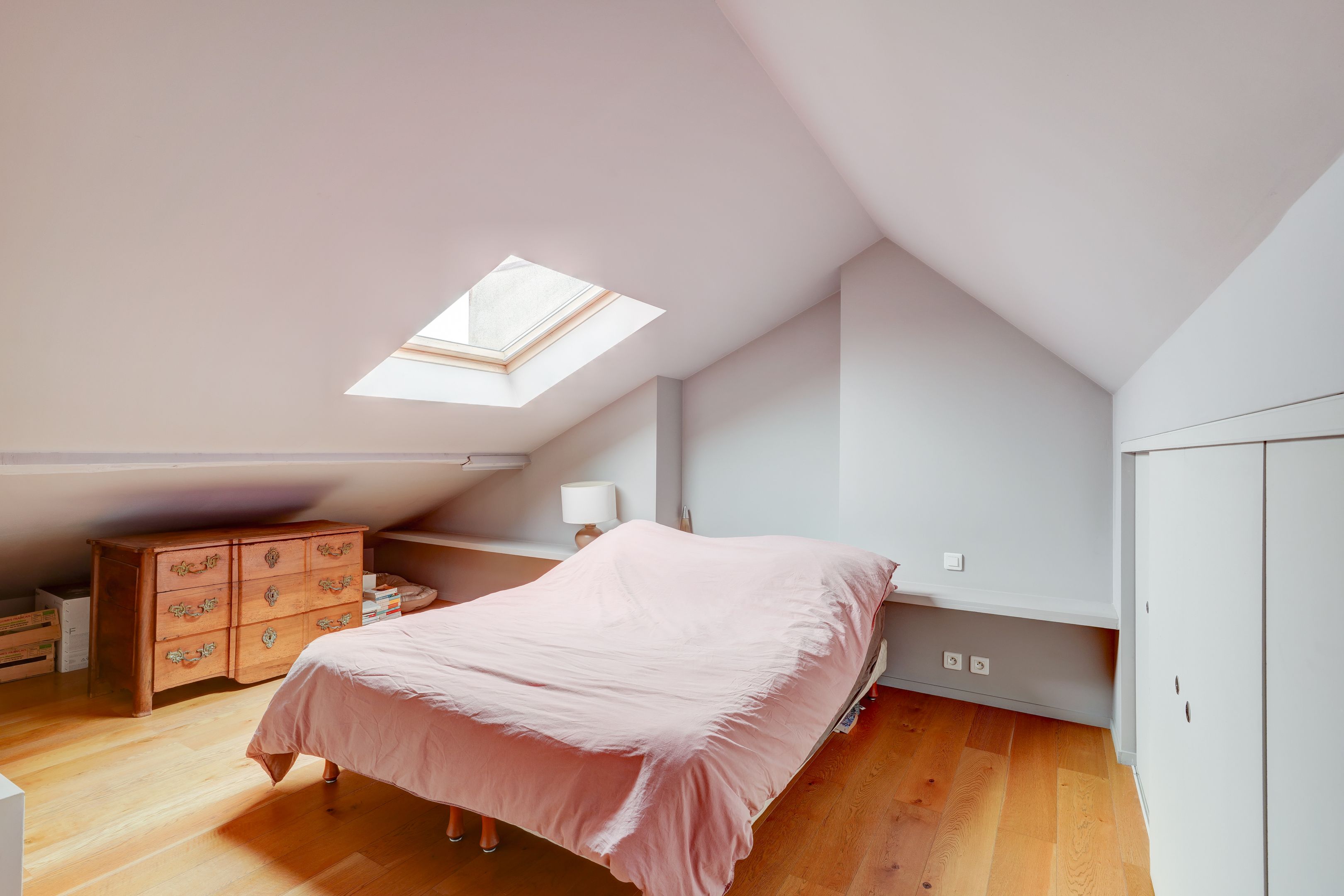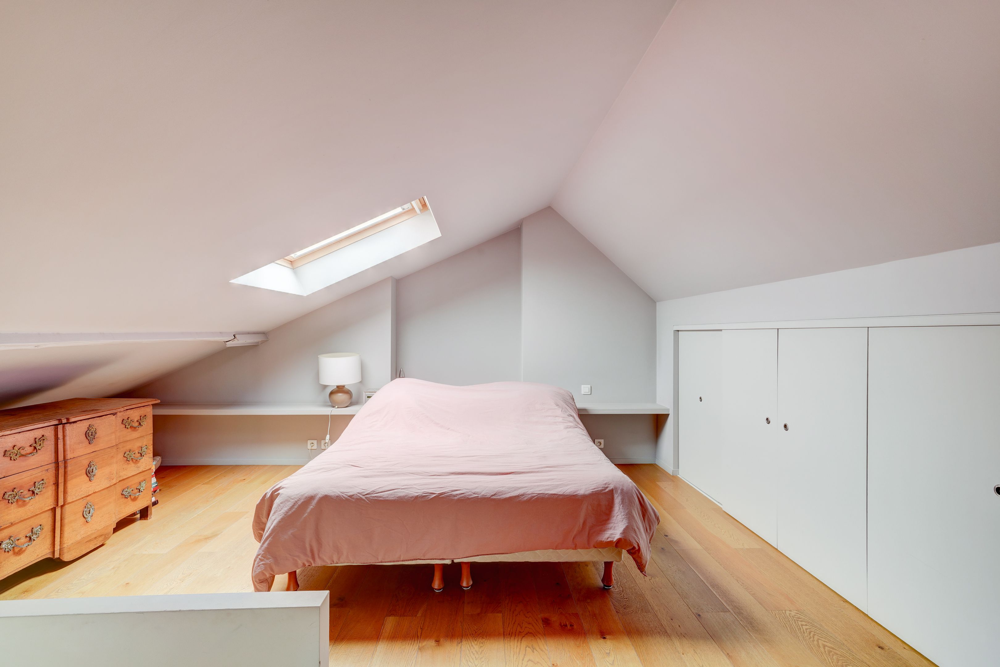 Immeuble 1910, appartement duplex de 74,40 m² Loi Carrez (106,02 m² au sol), au 4ème et dernier étage desservi par escalier. Au 1er niveau : entrée, séjour avec vue dégagée, cuisine séparée aménagée et équipée, chambre de belle taille, salle d'eau avec toilettes. Au 2ème niveau : grande chambre en suite avec grands "VELUX", espaces de rangement. Calme et lumineux. Une cave complète ce bien.