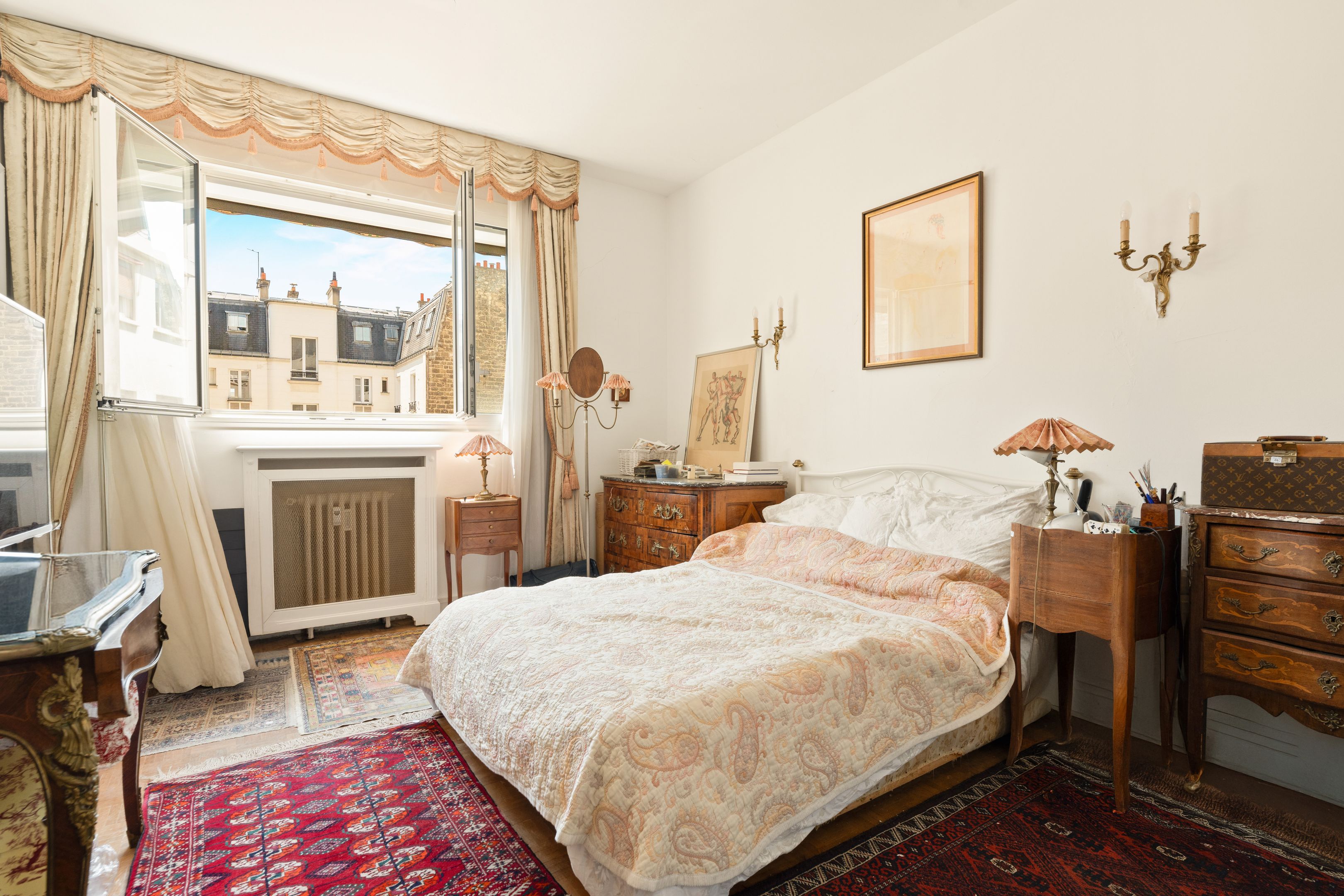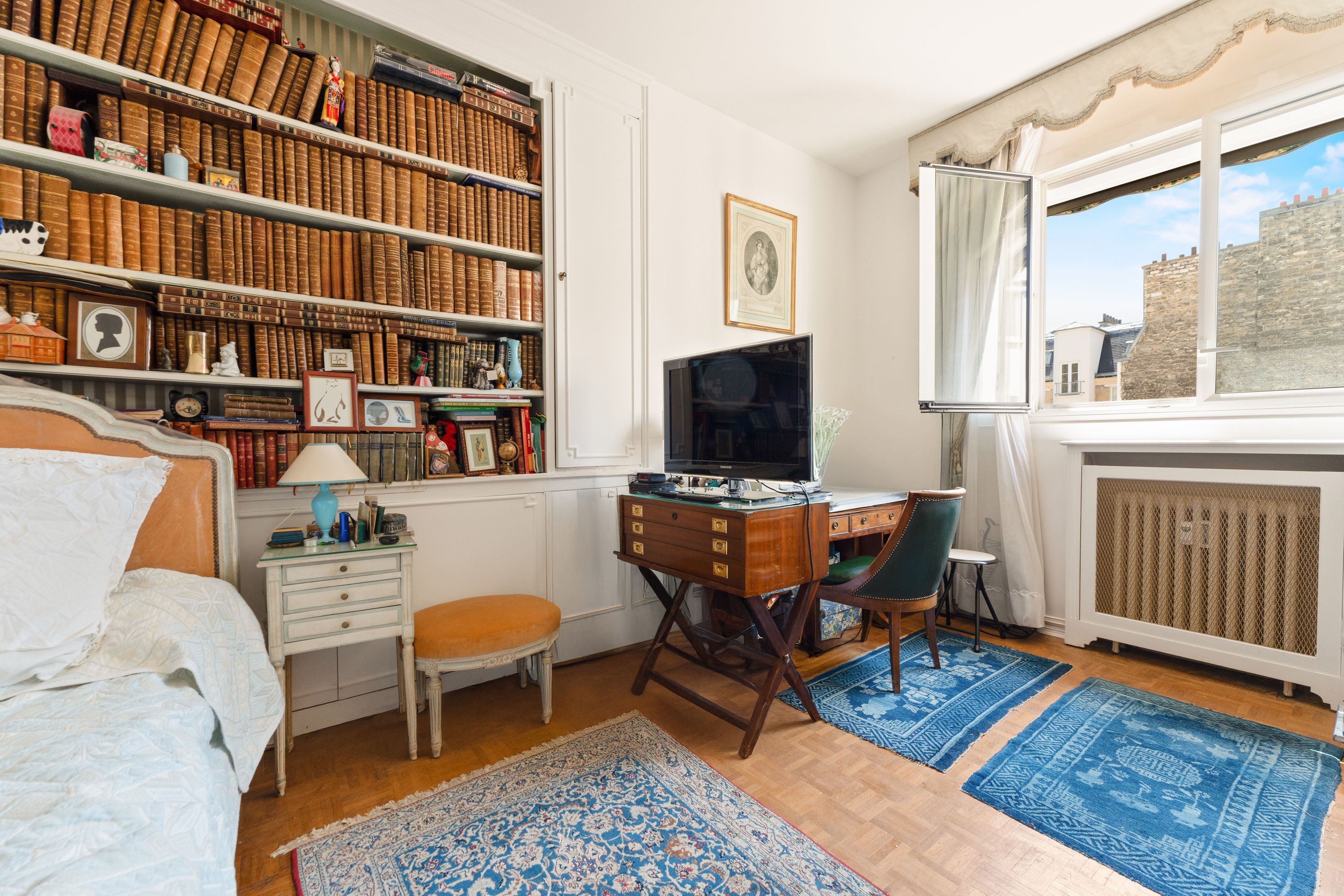 Trocadéro - Passy. Idéalement situé au coeur des nombreux commerces, transports et écoles de renom. Au quatrième étage accessible par ascenseur d'un bel immeuble d'angle milieu XXè de bon standing et sécurisé (gardien), appartement familial traversant de 87 m2, bénéficiant d'un plan compact et efficace ainsi que de beaux volumes. Galerie d'entrée, cuisine séparée aménagée agrémentée d'un espace dinatoire, deux chambres au calme absolu profitant d'une grande luminosité, salle de bains avec toilettes, nombreux rangements. Travaux nécessaires.