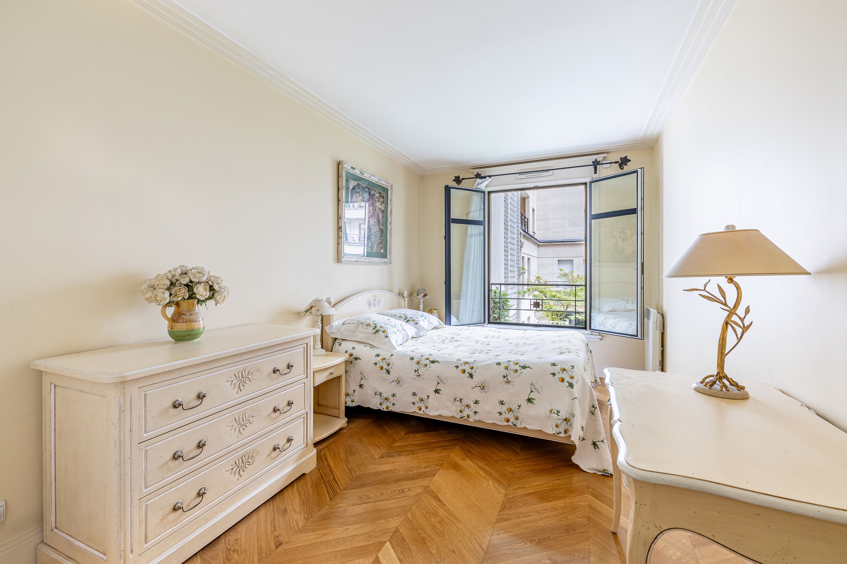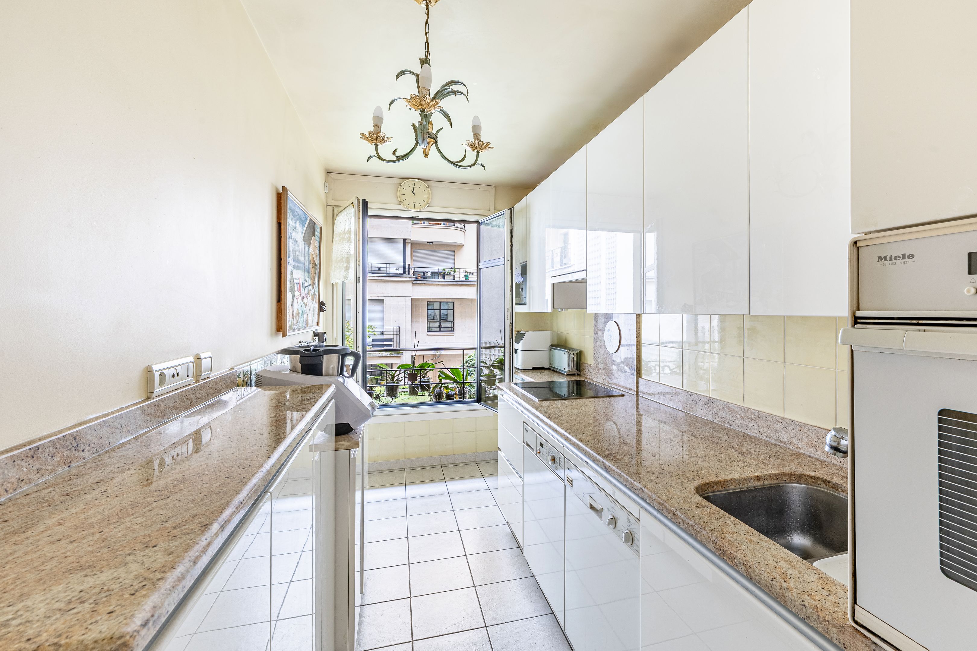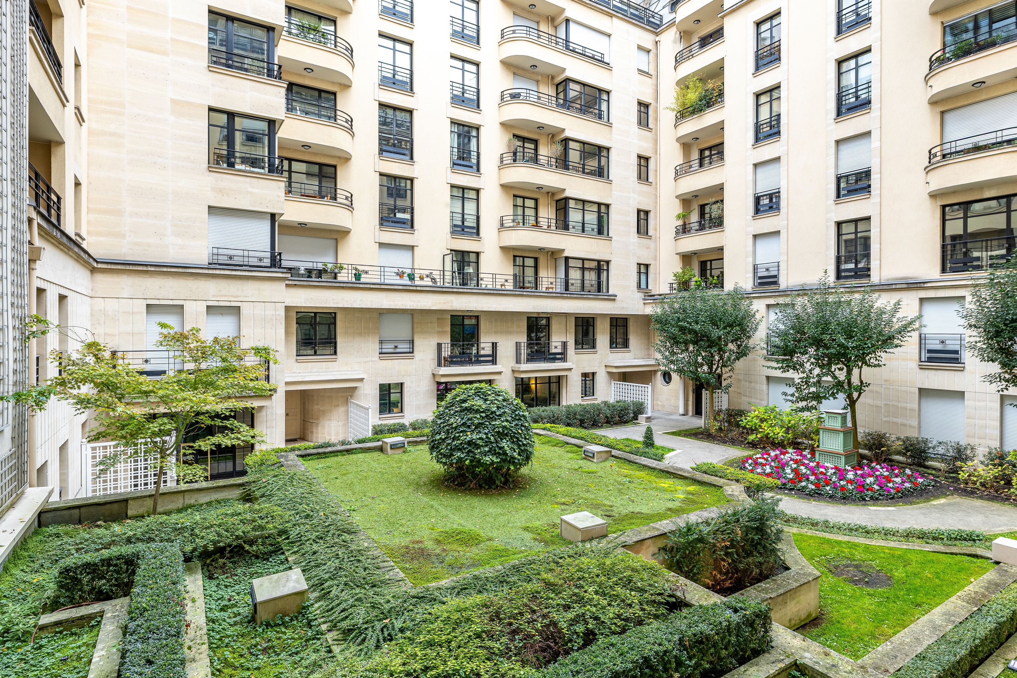 Immeuble moderne d'inspiration Art Déco de très bon standing jouissant des services d'un gardien et de vidéosurveillance, appartement de 85 m² (loi Carrez) en parfait état, calme et traversant entre rue et jardin, situé au 1er étage desservi par ascenseur, bénéficiant d'un excellent plan, d'agréables volumes ainsi que d'une exposition sud. Entrée, vaste pièce de réception agrémentée de larges fenêtres offrant une vue dégagée, cuisine séparée donnant sur cour végétalisée, suite parentale avec salle d'eau et toilettes, seconde chambre, salle de bains avec toilettes, toilettes invités, nombreux rangements intégrés. Deux caves saines et sécurisées. Possibilité d’acquérir une place de parking facile d’accès dans l’immeuble, en supplément avec chargeur électrique pour voiture et vélo, au prix de 60 000€. Professions libérales autorisées.