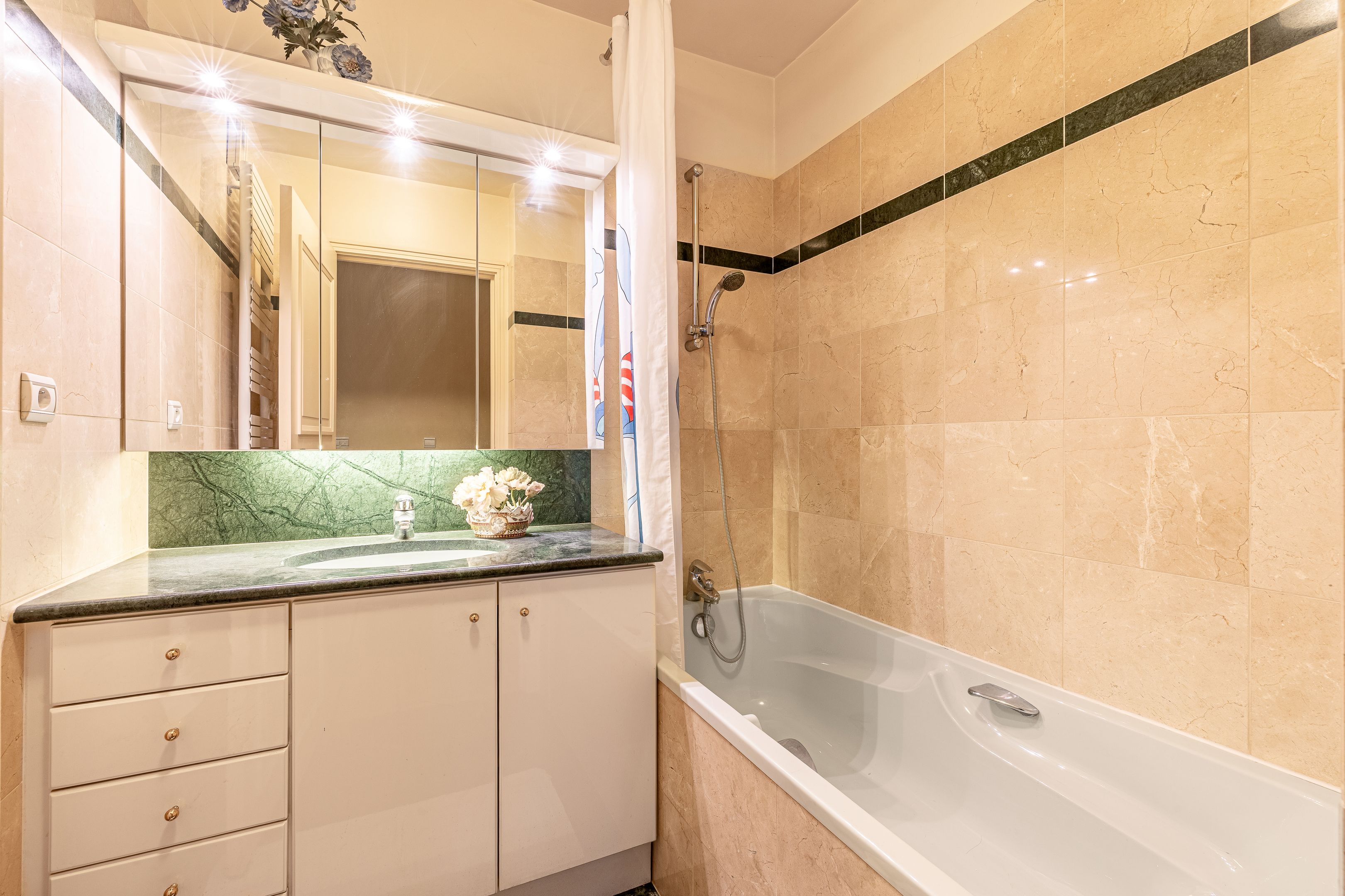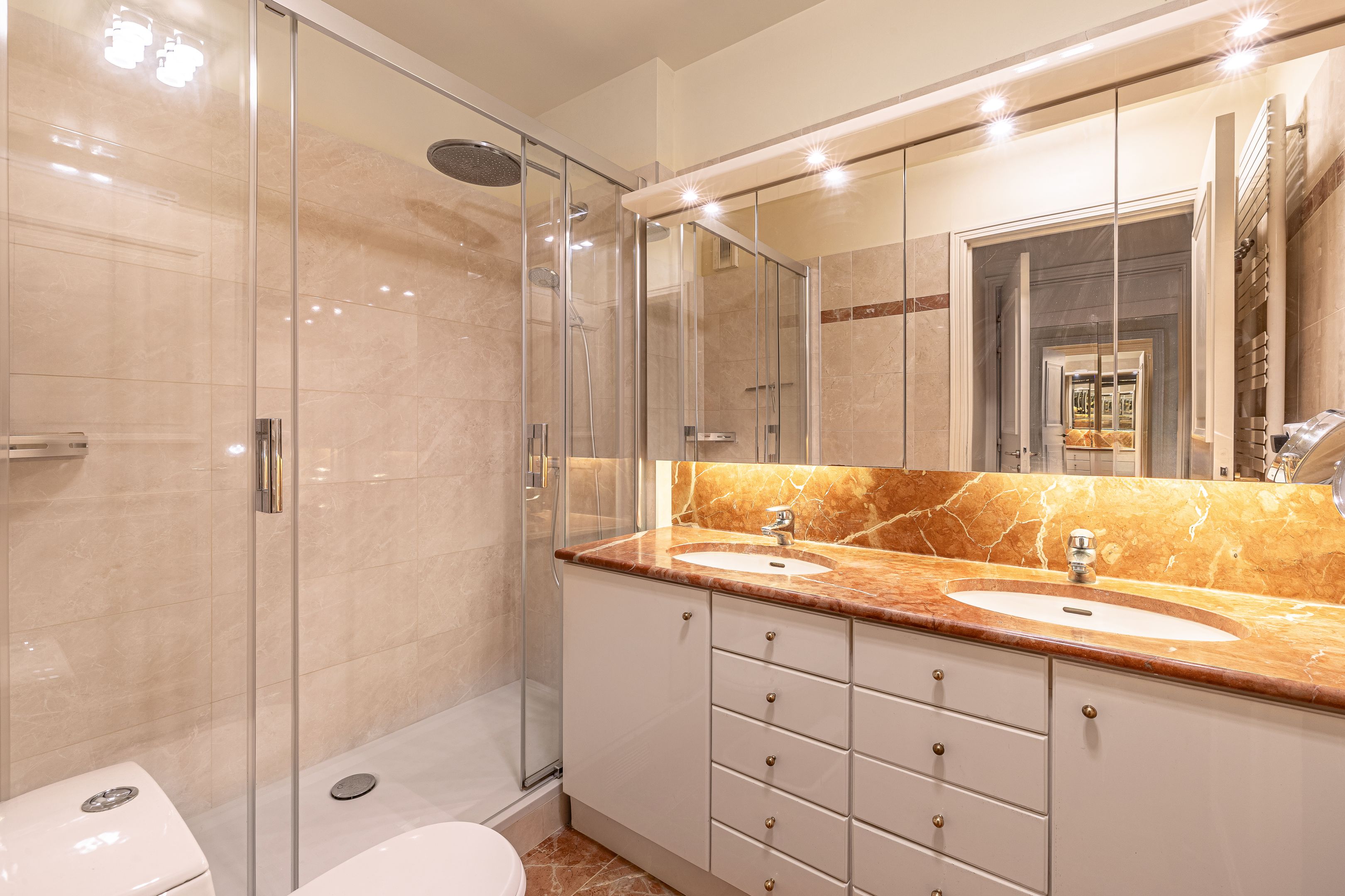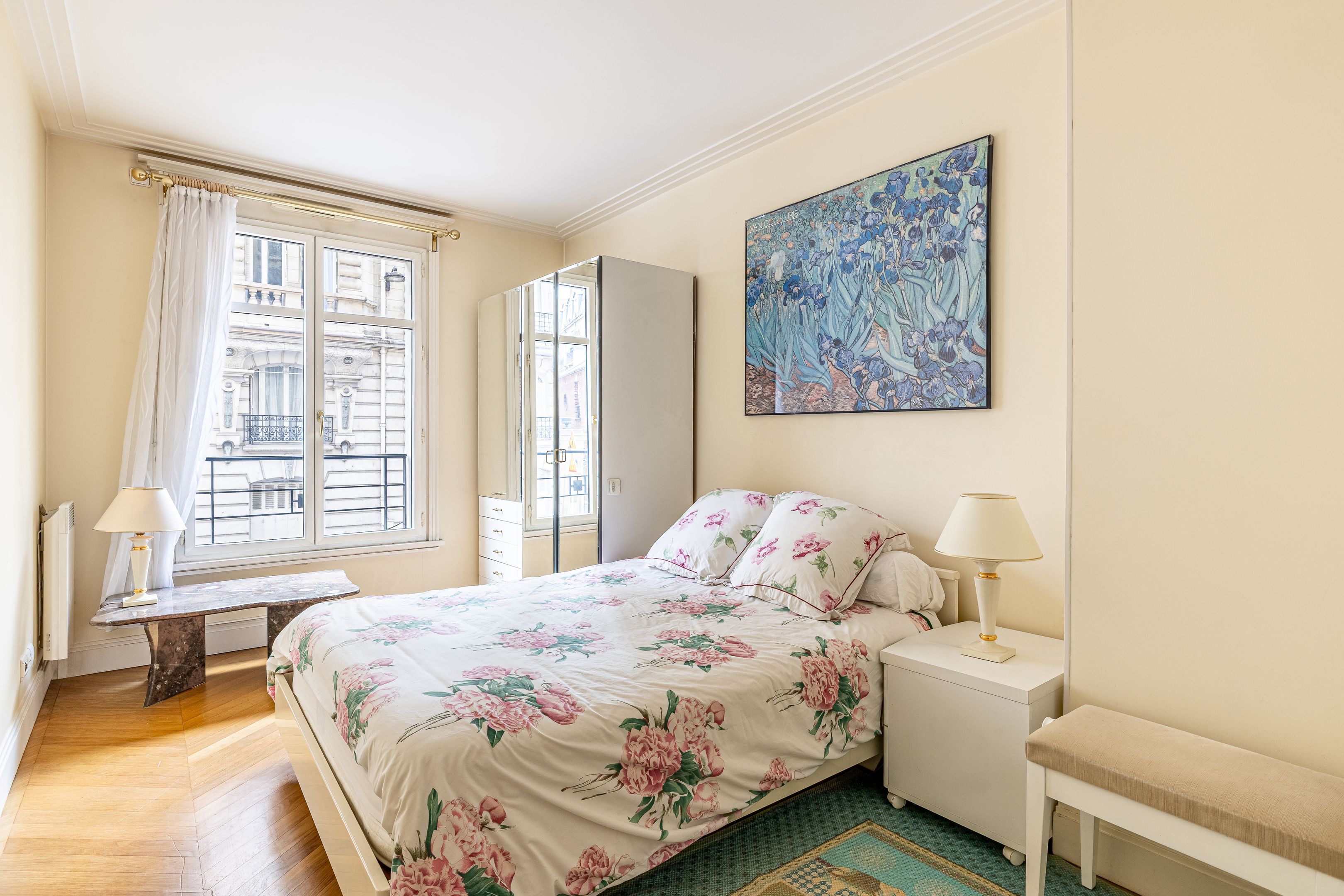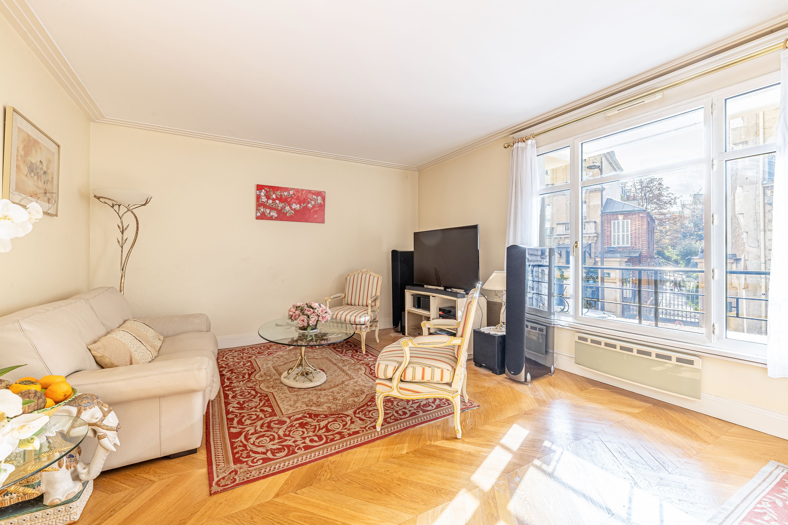 Immeuble moderne d'inspiration Art Déco de très bon standing jouissant des services d'un gardien et de vidéosurveillance, appartement de 85 m² (loi Carrez) en parfait état, calme et traversant entre rue et jardin, situé au 1er étage desservi par ascenseur, bénéficiant d'un excellent plan, d'agréables volumes ainsi que d'une exposition sud. Entrée, vaste pièce de réception agrémentée de larges fenêtres offrant une vue dégagée, cuisine séparée donnant sur cour végétalisée, suite parentale avec salle d'eau et toilettes, seconde chambre, salle de bains avec toilettes, toilettes invités, nombreux rangements intégrés. Deux caves saines et sécurisées. Possibilité d’acquérir une place de parking facile d’accès dans l’immeuble, en supplément avec chargeur électrique pour voiture et vélo, au prix de 60 000€. Professions libérales autorisées.