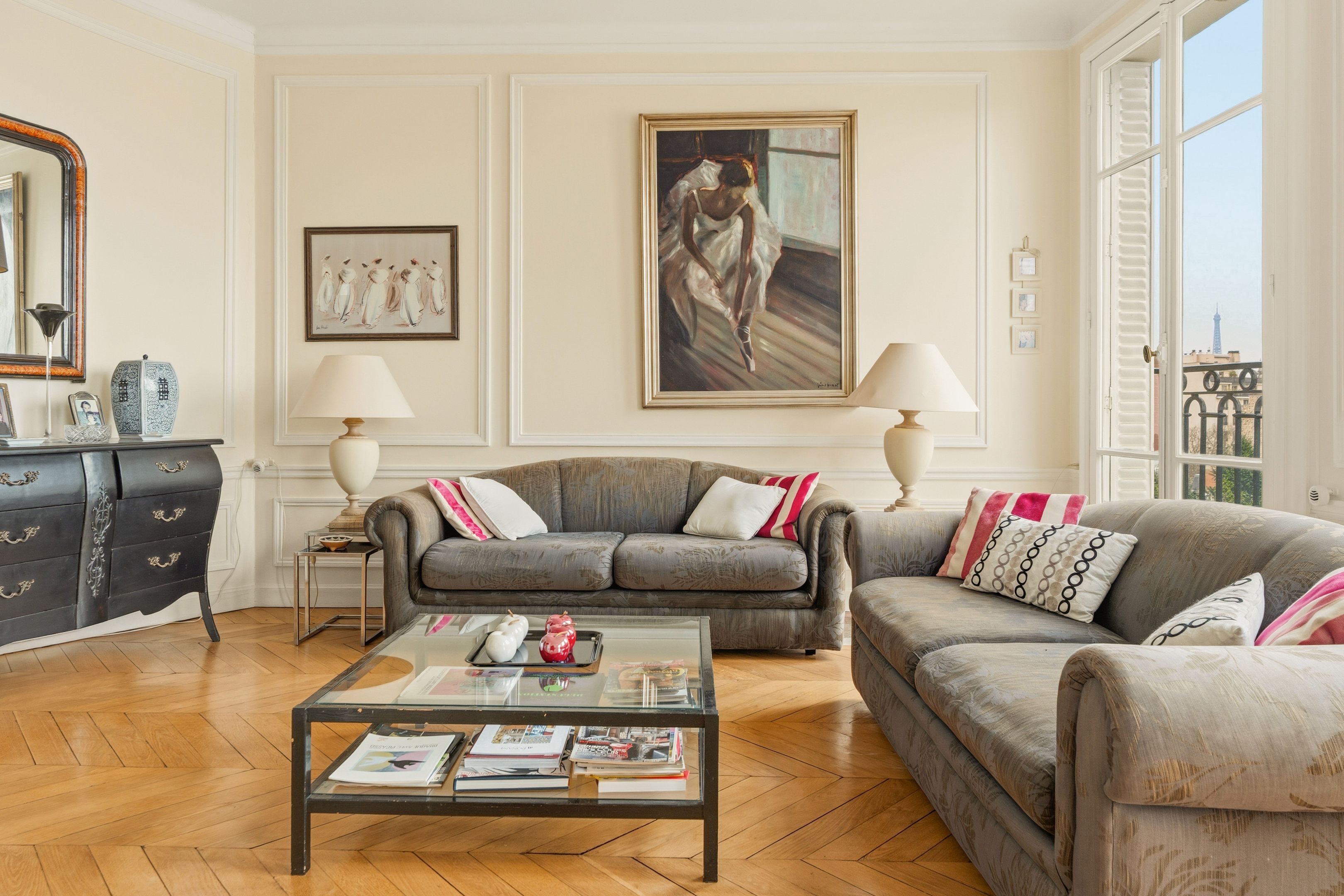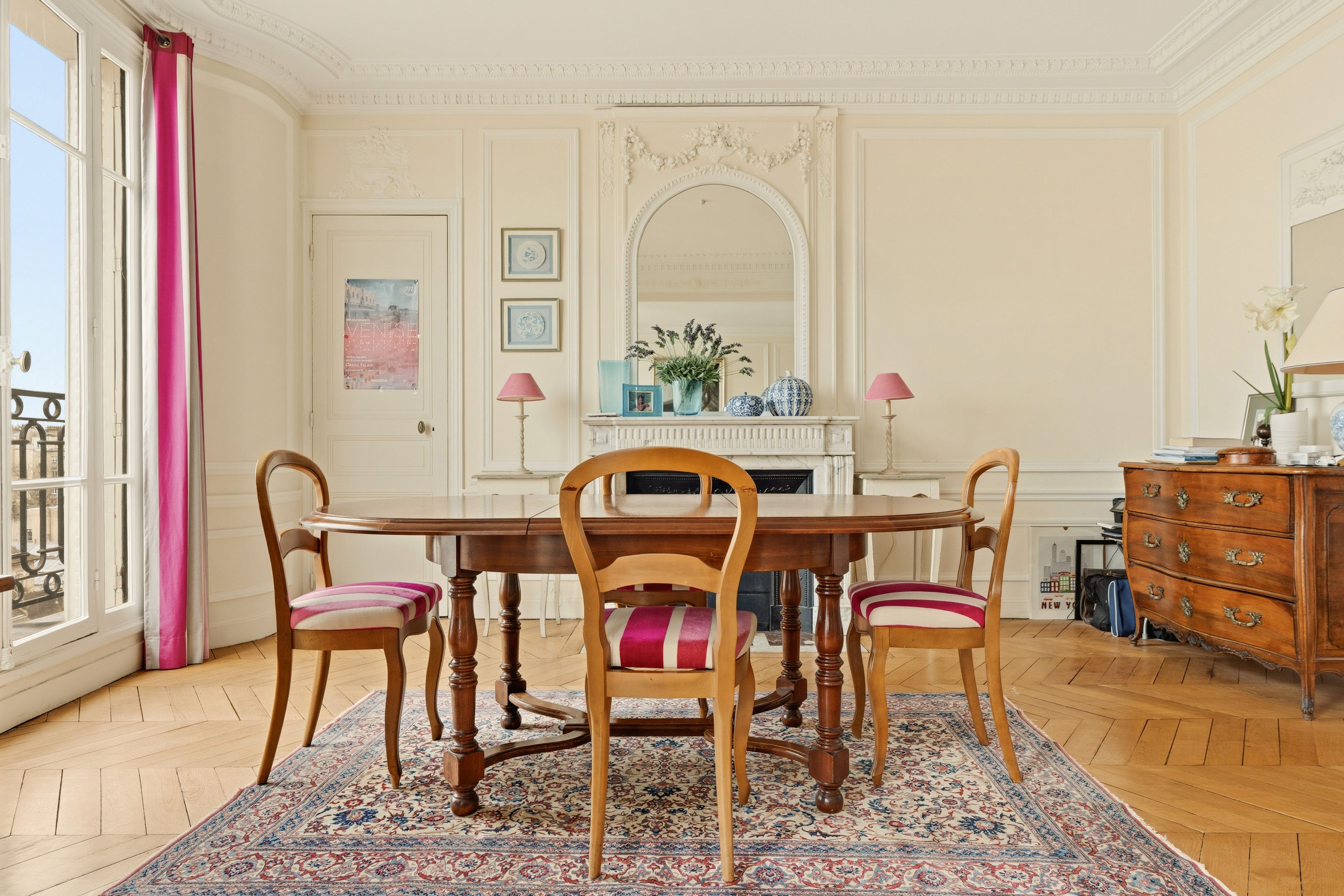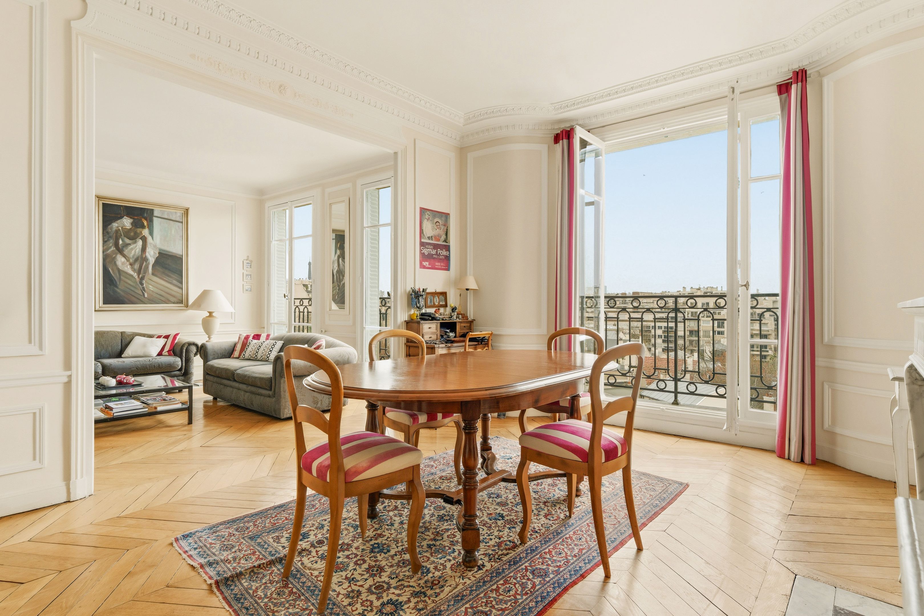 Michel-Ange - Molitor. Immeuble en pierre de taille de standing à quelques pas du Village d'Auteuil et à proximité de toutes les commodités et des écoles de renom. Au sixième étage, appartement de 105,35 m² bénéficiant du charme de l'ancien (parquet, moulures et cheminées), d'une belle luminosité et d'une jolie vue dégagée sur le Hameau Boileau. Galerie d'entrée, salon-salle à manger, cuisine indépendante aménagée et équipée, deux chambres, salle de bains, dressing, toilettes séparées, nombreux rangements. Au septième étage par escalier, chambre de service de 8,50 m² Loi Carrez indissociable du lot au prix de 80 000 €. Grande cave.