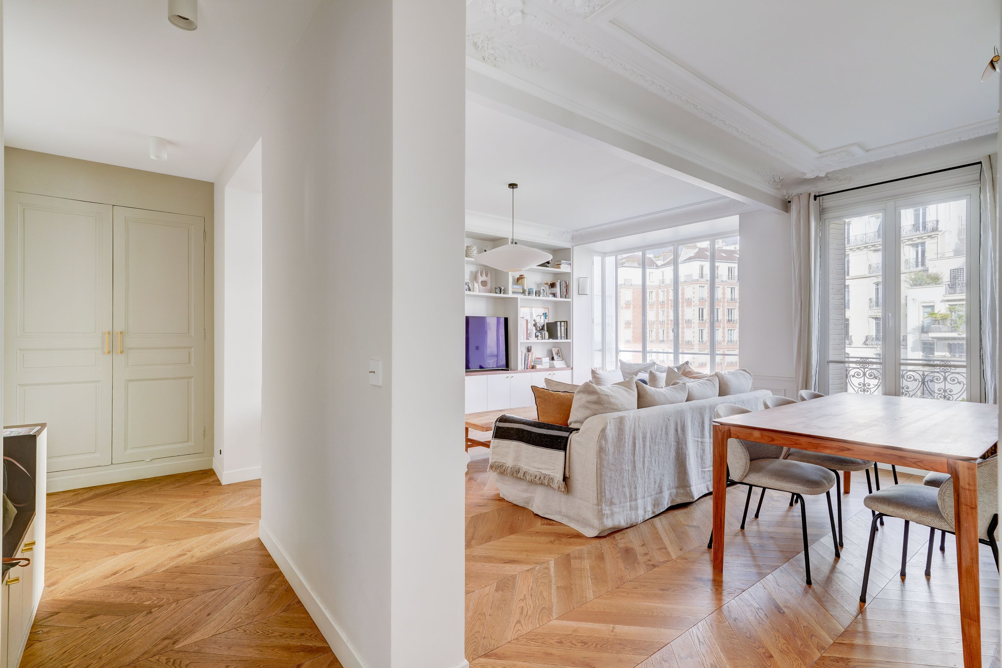 Idéalement situé à deux pas des commerces de la rue de Passy, immeuble ancien en pierre, 4ème étage, appartement de 79 m² en parfait état doté d'une vue dégagée et de beaux volumes. Entrée, double séjour avec bow-window, cuisine ouverte aménagée et équipée, deux chambres, salle de bains, toilettes séparées. Nombreux rangements. Cave.
