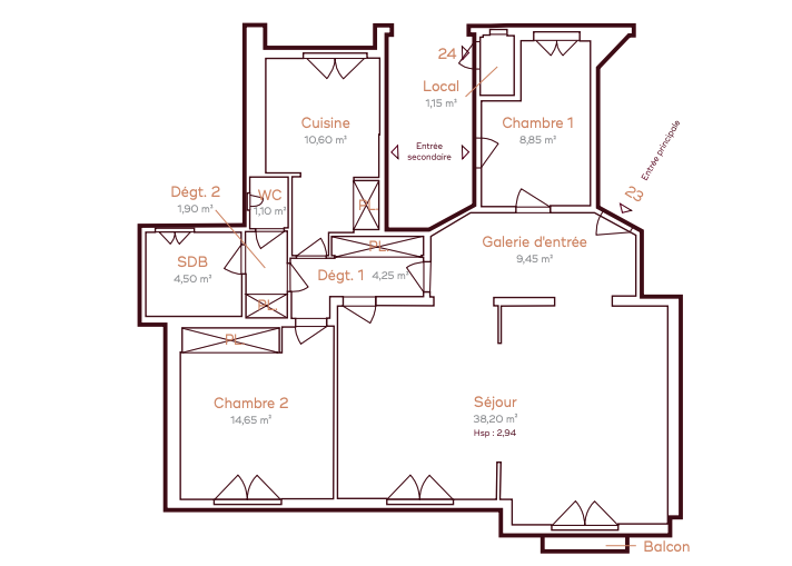 93.5 m²2 chambresDPE: D (238 kWh/m².an) / GES: D (46kg CO2/m².an)Pas de procédure en coursplan
