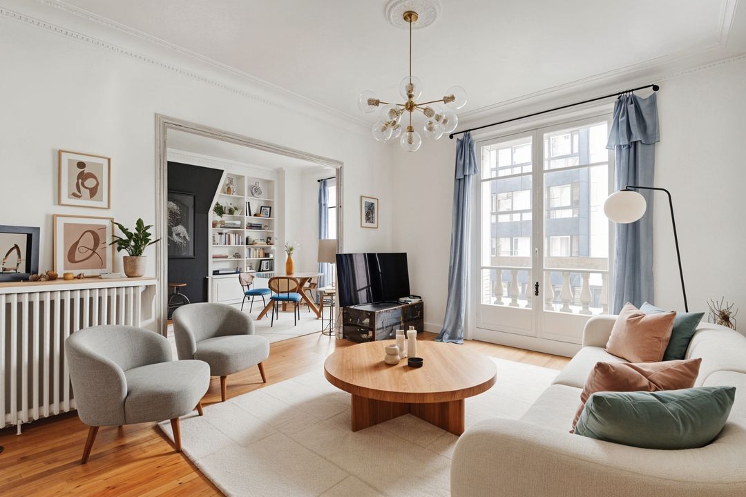 Neuilly - Place du Duc d'Orléans, idéalement situé dans un magnifique immeuble Art Déco sécurisé de haut standing et dont les parties communes ont été récemment rénovées, appartement de 93,5 m² loi Carrez situé au 6ème étage avec ascenseur, traversant et ensoleillé. Entrée, double séjour, 2 chambres, salle de bains, toilettes et rangements. Cave