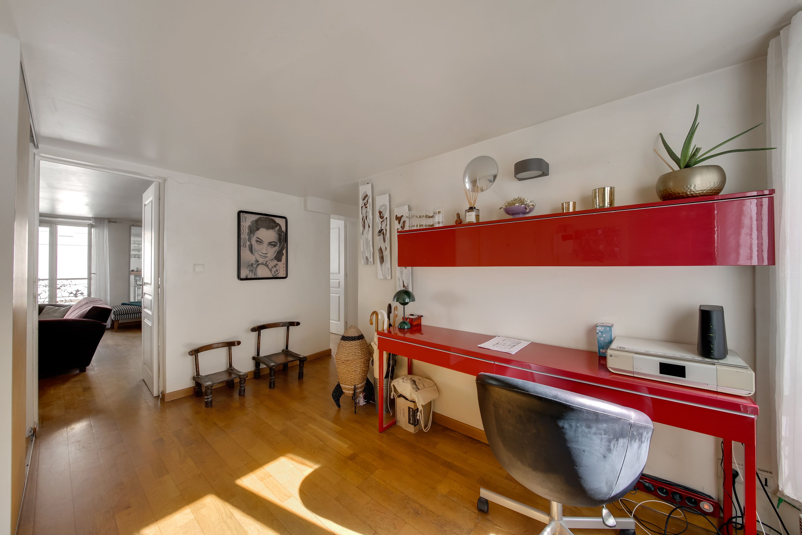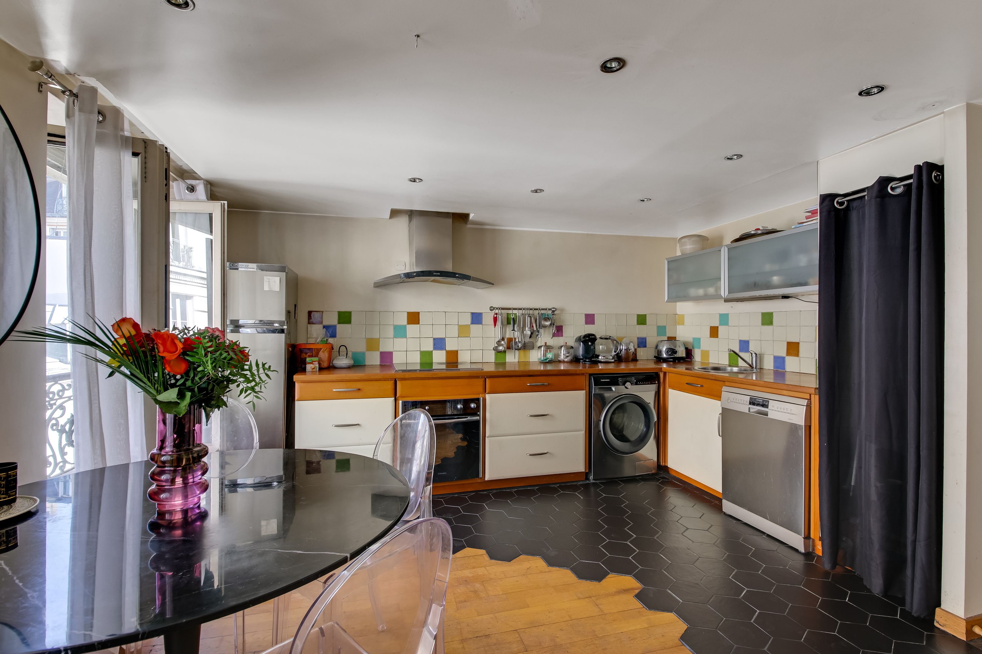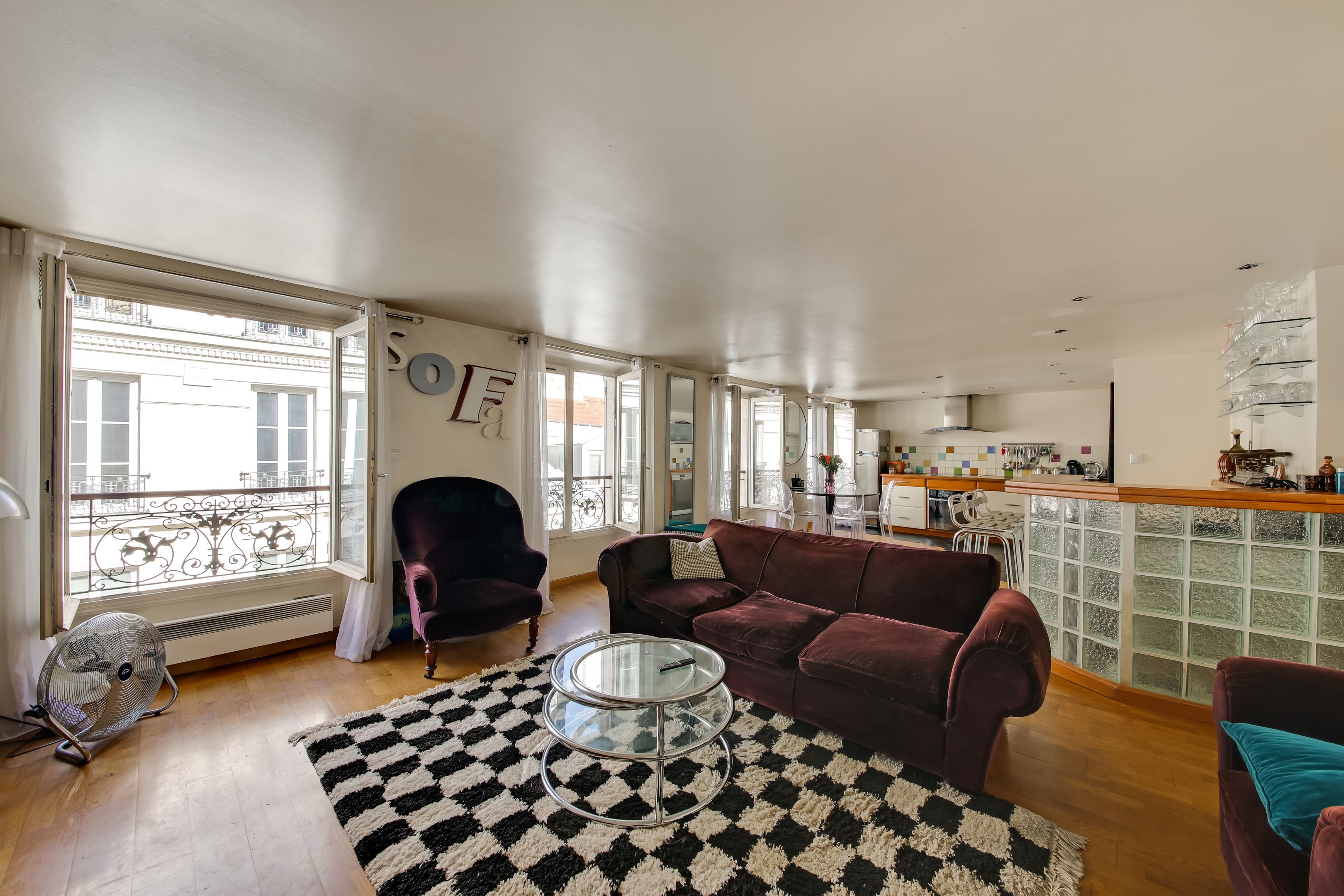 Quartier de la Chaussée d'Antin. Au quatrième étage d'une copropriété édifiée en 1860, appartement traversant de 77,41m2 loi Carrez, composé d'une belle entrée actuellement à usage de bureau avec sa fenêtre sur cour, un double séjour, une cuisine ouverte aménagée, deux chambres au calme sur cour, une salle de bains, toilettes indépendantes. Cave.