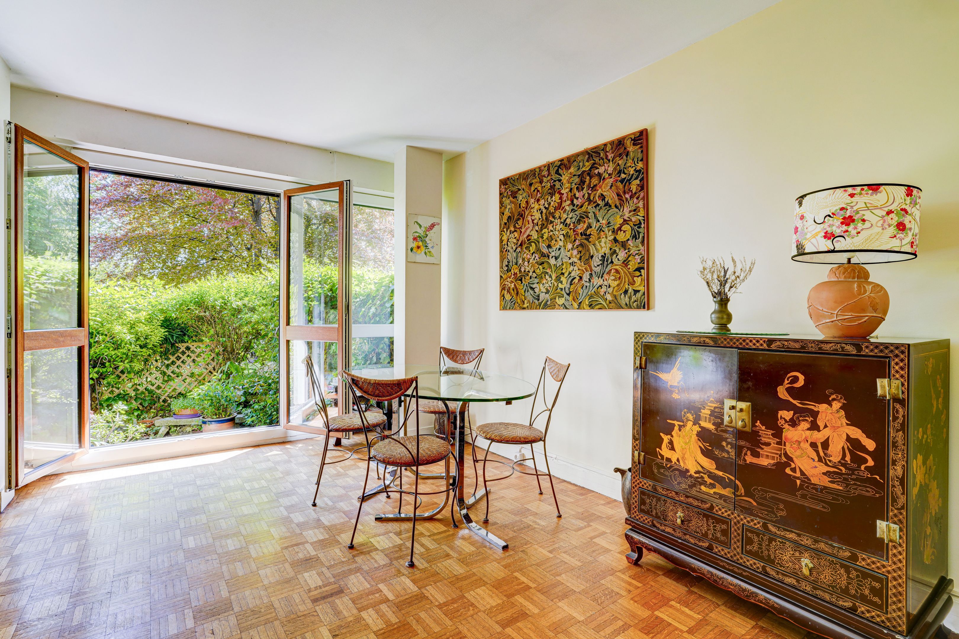 En bordure de Seine au cœur d'une résidence arborée, accueillante, sécurisée à proximité du tramway, à proximité de la gare de St Cloud, des commerces du Parc de Saint-Cloud et du Bois de Boulogne, appartement familial traversant sans vis à vis de 92m² avec son jardin terrasse privatif de 25m². Entrée, salon ouvert sur une terrasse arborée exposée est, cuisine équipée orientée ouest offrant un vue sur un jardin arboré fleuri, trois chambres dont une avec un accès terrasse double exposition, une deuxième avec salle de douche aménageable et une vaste salle de bain, nombreux rangements. Cave. Un emplacement de parking est possible dans la résidence, possibilité de louer un parking en supplément. Contact Nathalie Faes 06 22 85 50 46