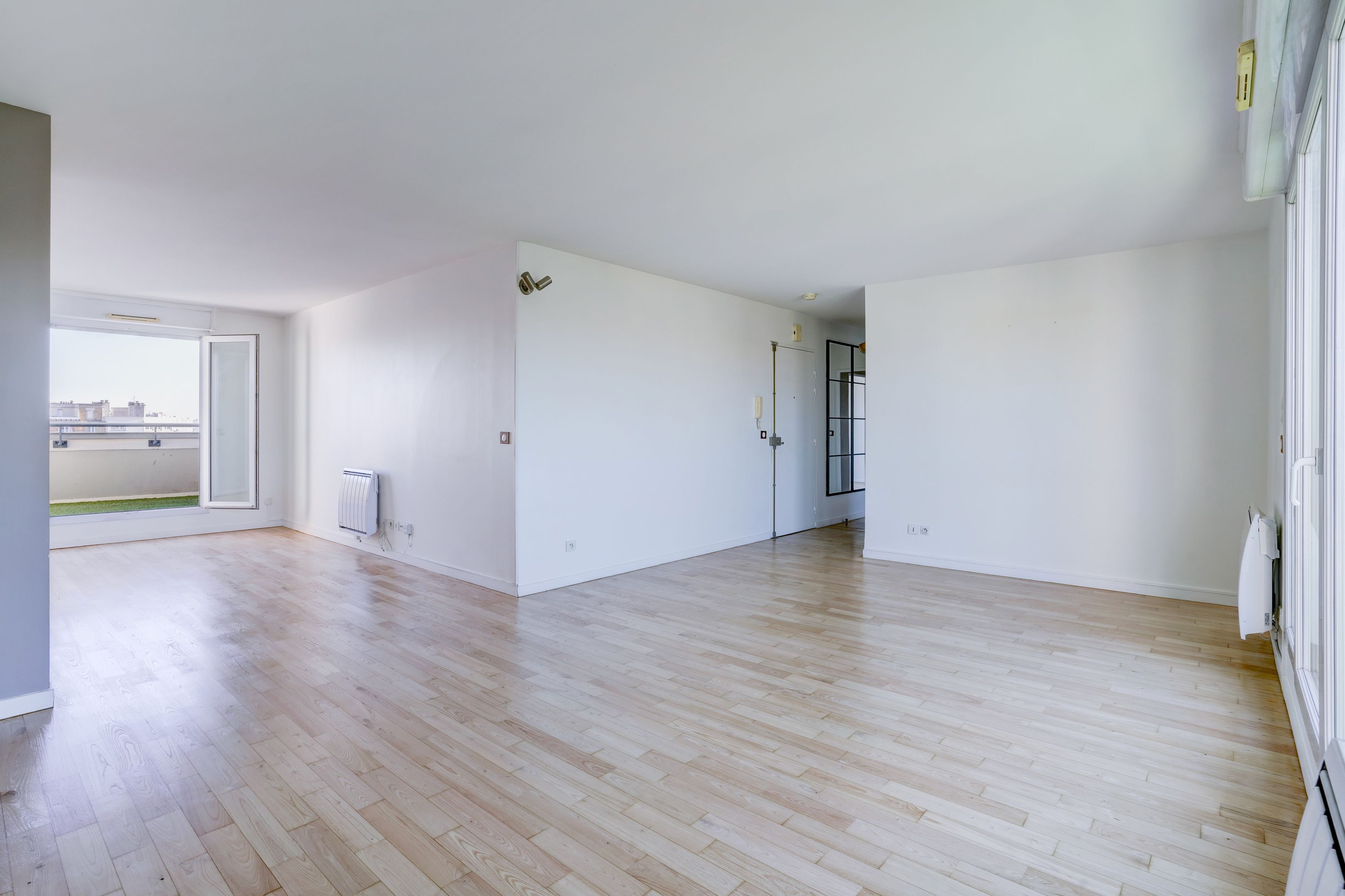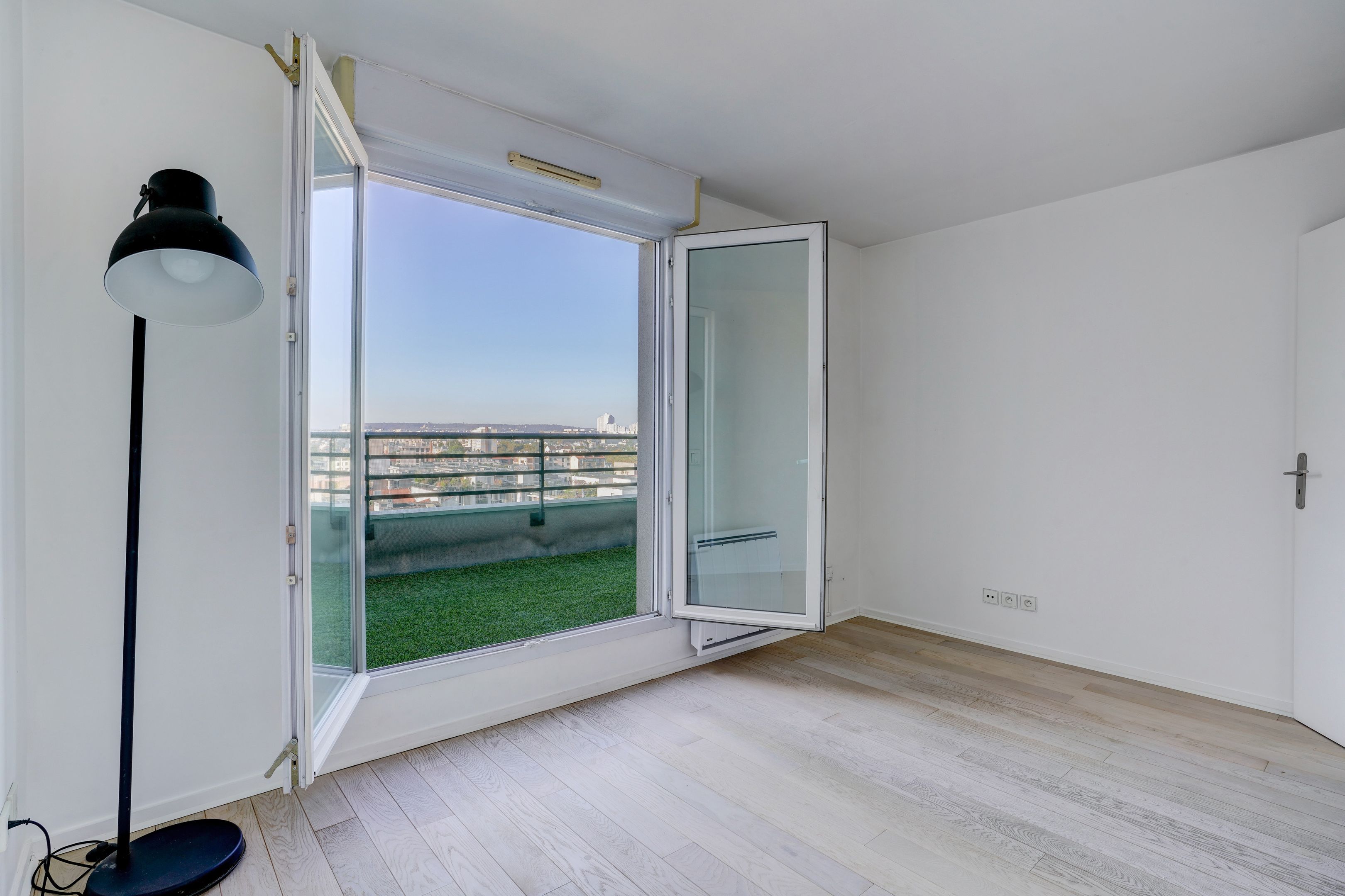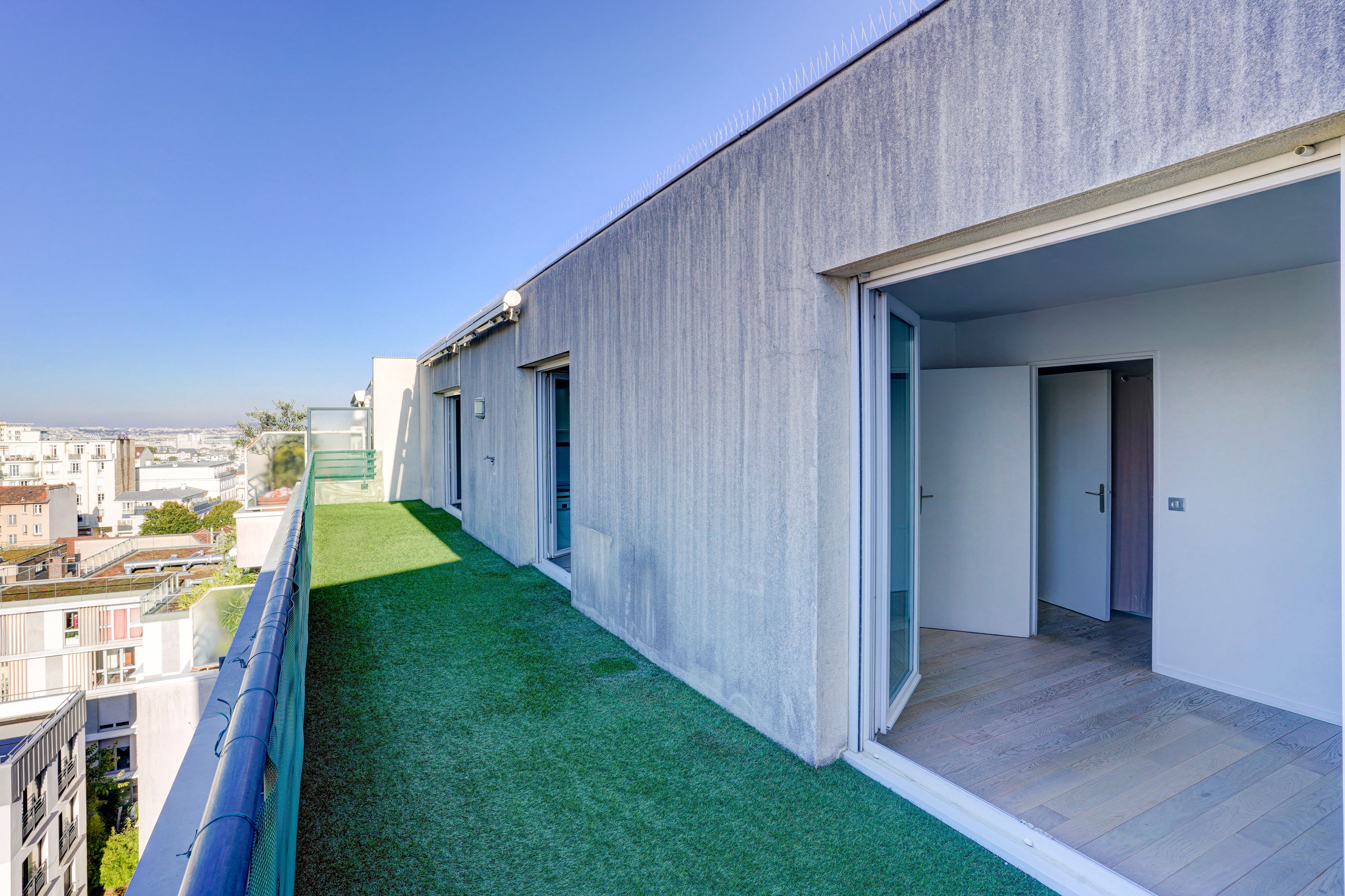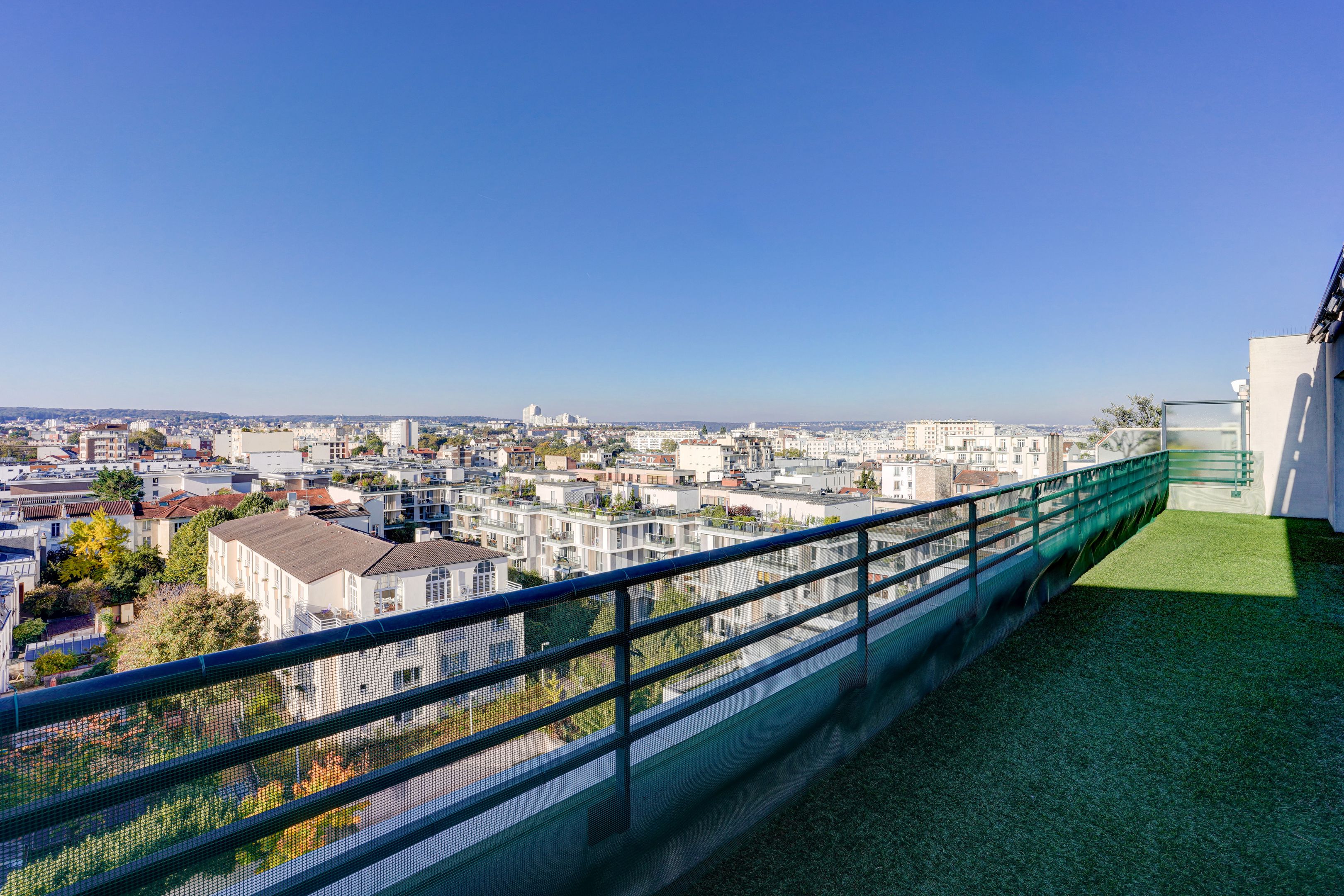 Une entrée dessert un espace réception traversant avec salle à manger et salon aux vues dégagées et une cuisine équipée séparée donnant sur une terrasse de 27m² avec vue sur Paris. Pour la partie nuit, deux chambres avec leur balcon de 5m², des rangements intégrés, une salle de bain avec douche et toilettes séparées. Une cave et un parking. Transports à proximité (gare de Vanves ligne N, Métro Malakoff Ligne 13).