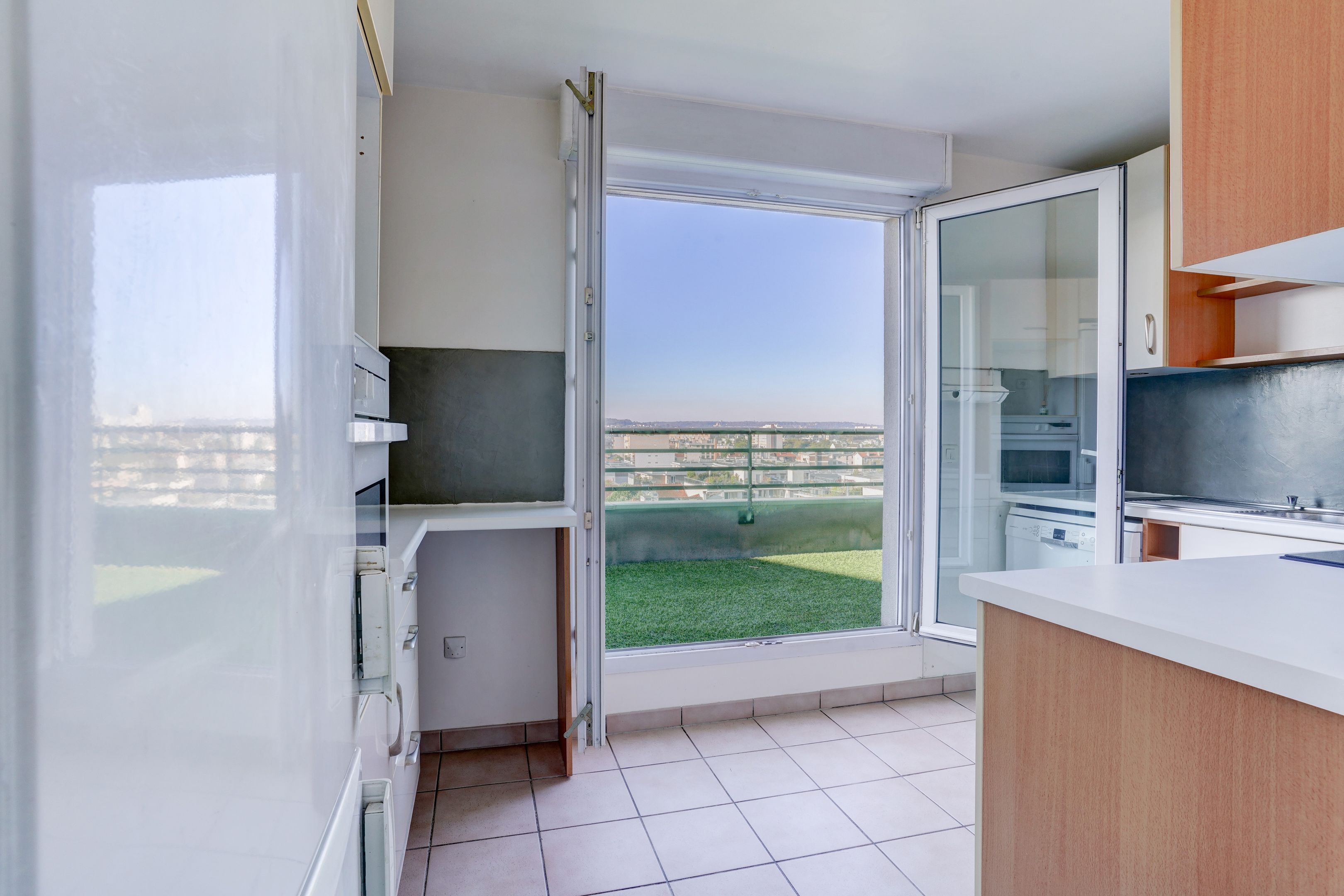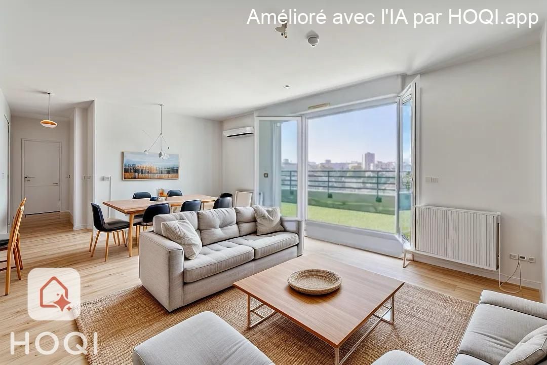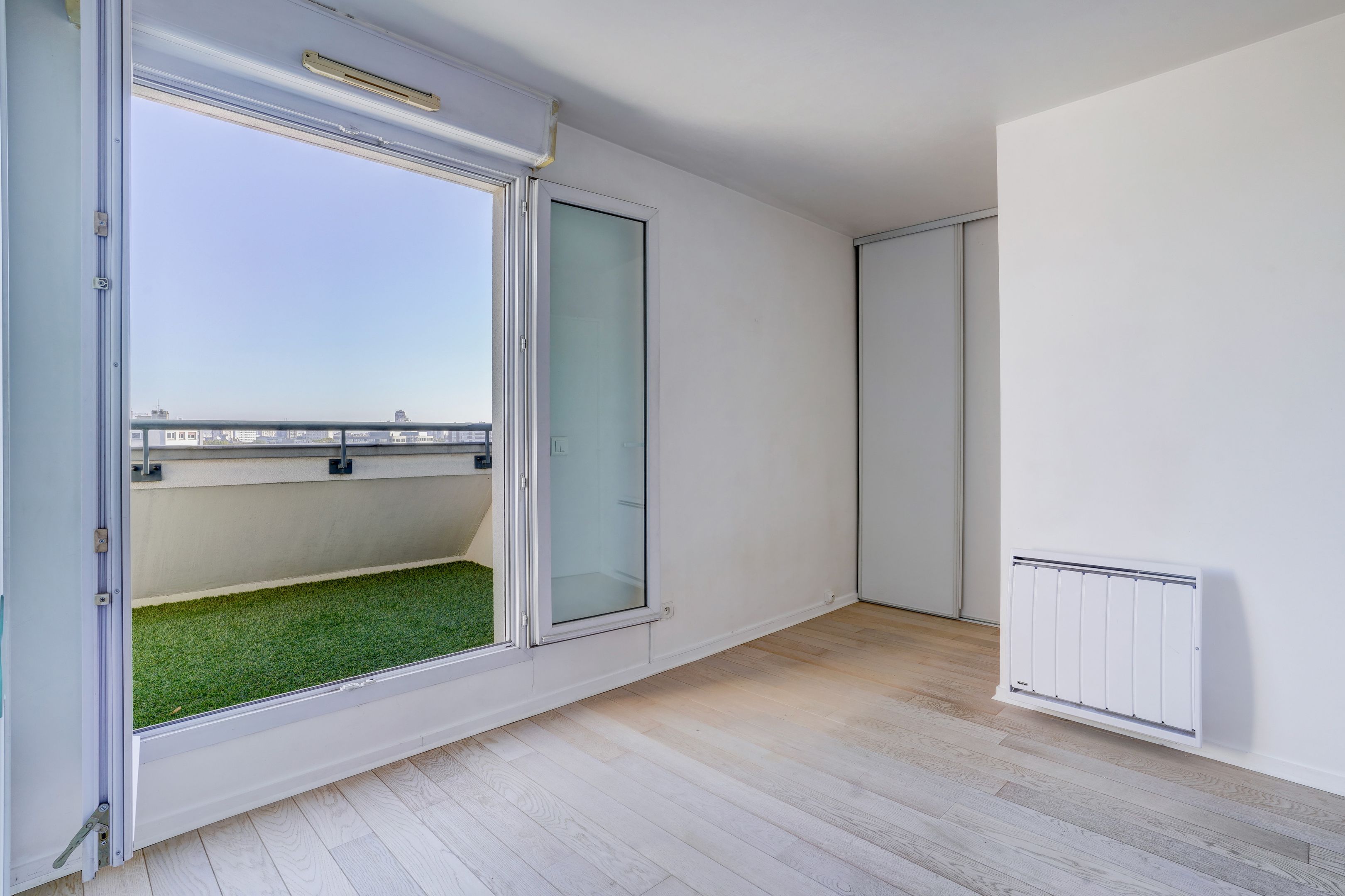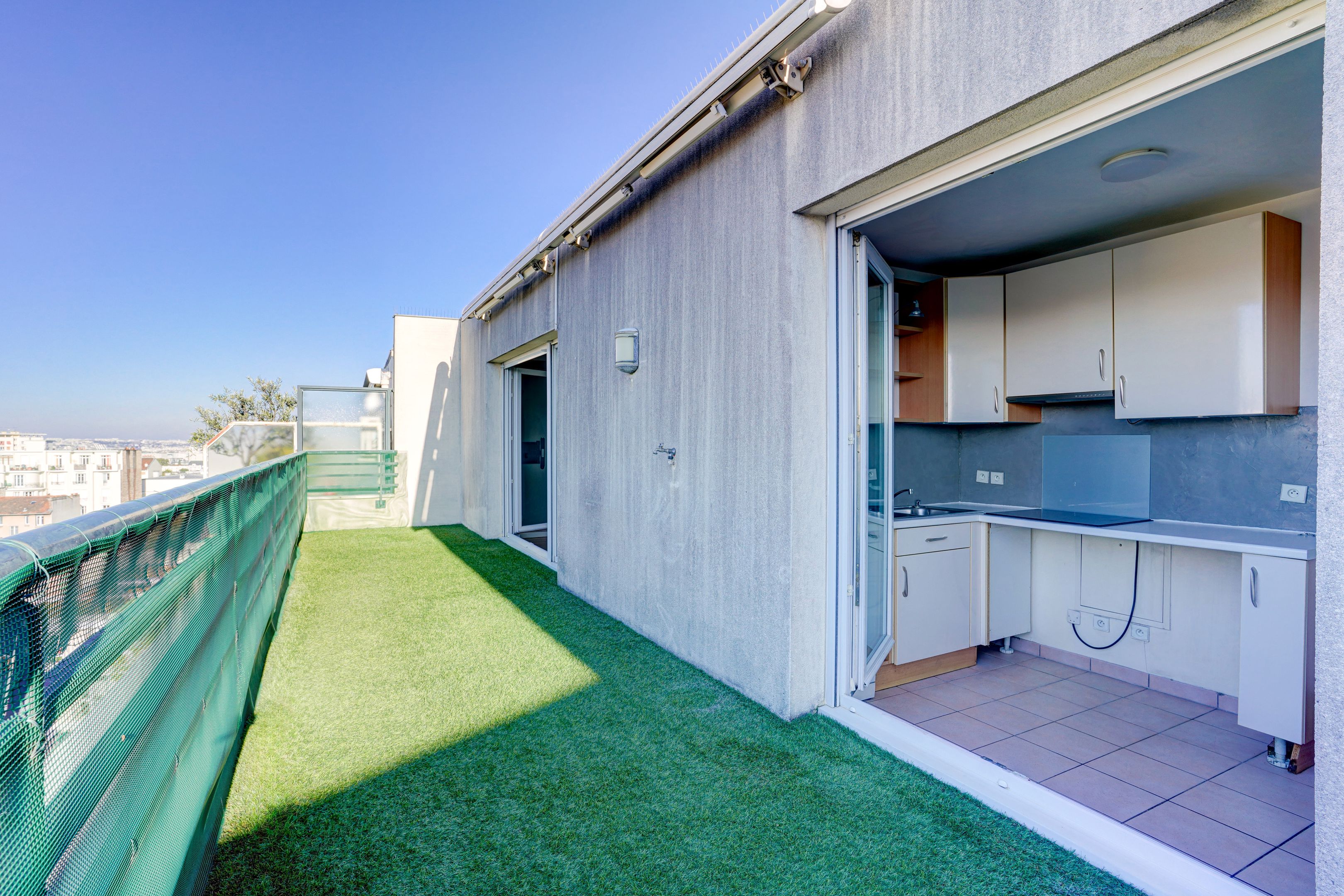 Une entrée dessert un espace réception traversant avec salle à manger et salon aux vues dégagées et une cuisine équipée séparée donnant sur une terrasse de 27m² avec vue sur Paris. Pour la partie nuit, deux chambres avec leur balcon de 5m², des rangements intégrés, une salle de bain avec douche et toilettes séparées. Une cave et un parking. Transports à proximité (gare de Vanves ligne N, Métro Malakoff Ligne 13).