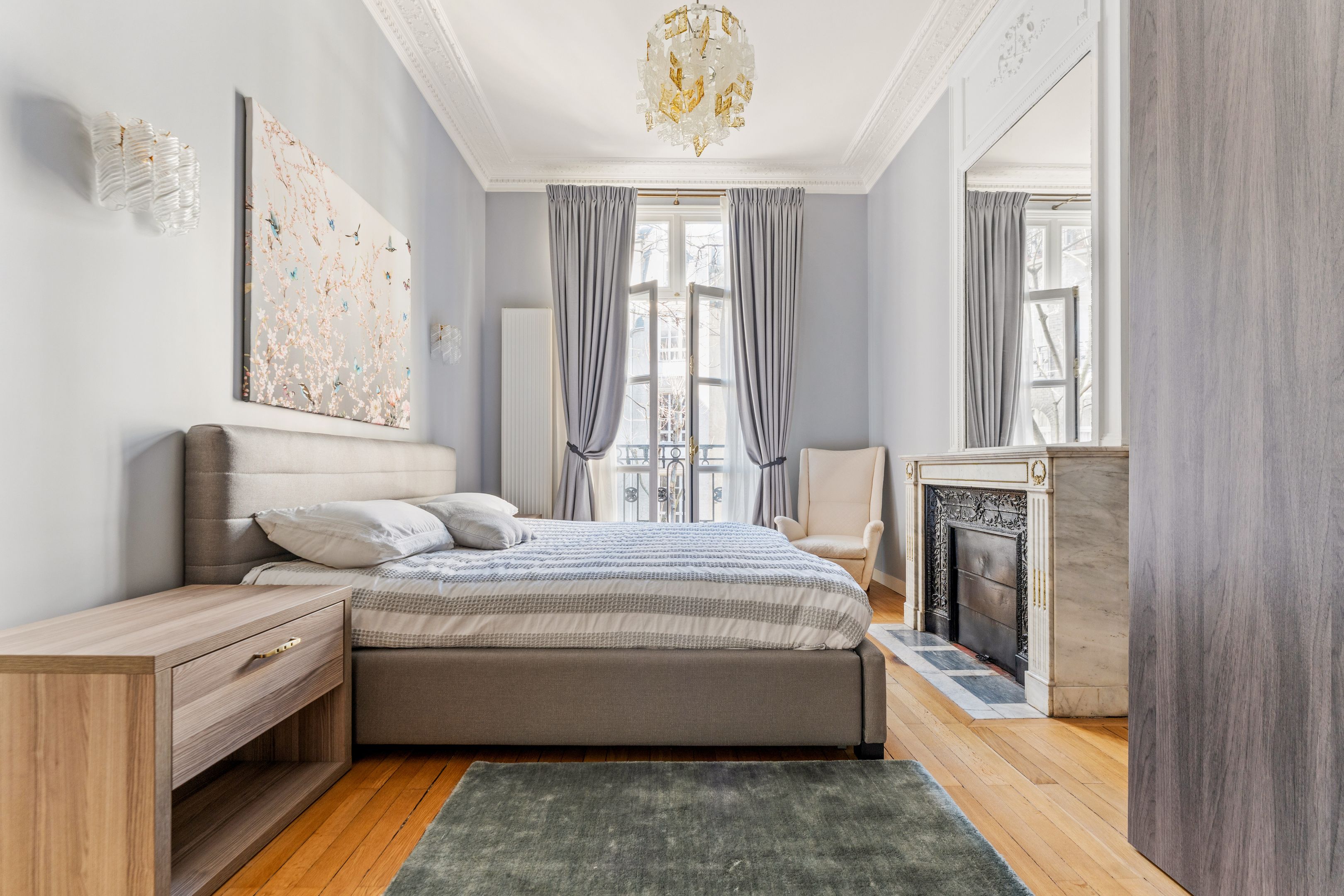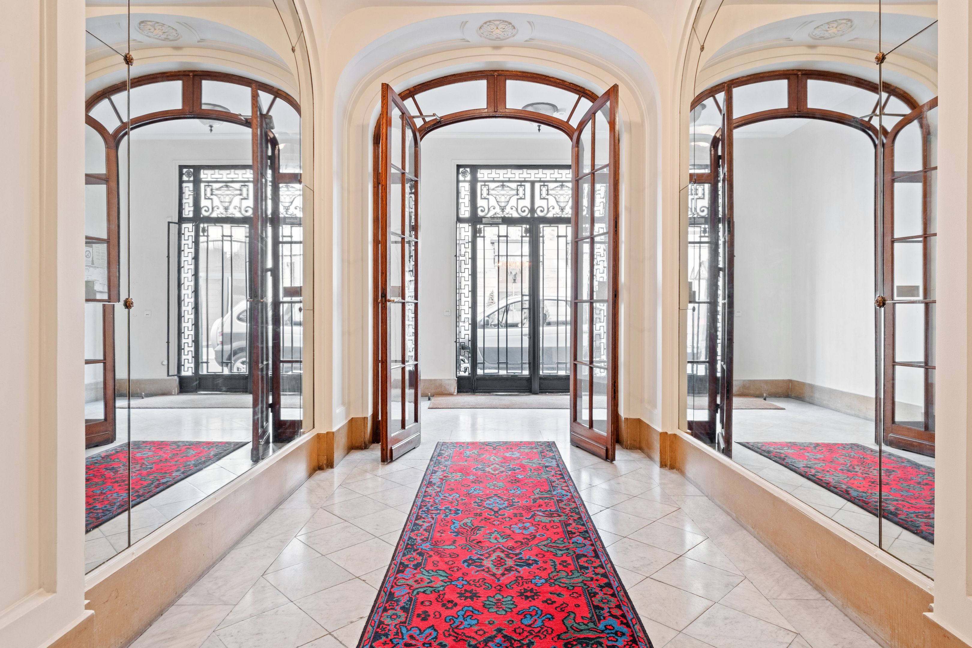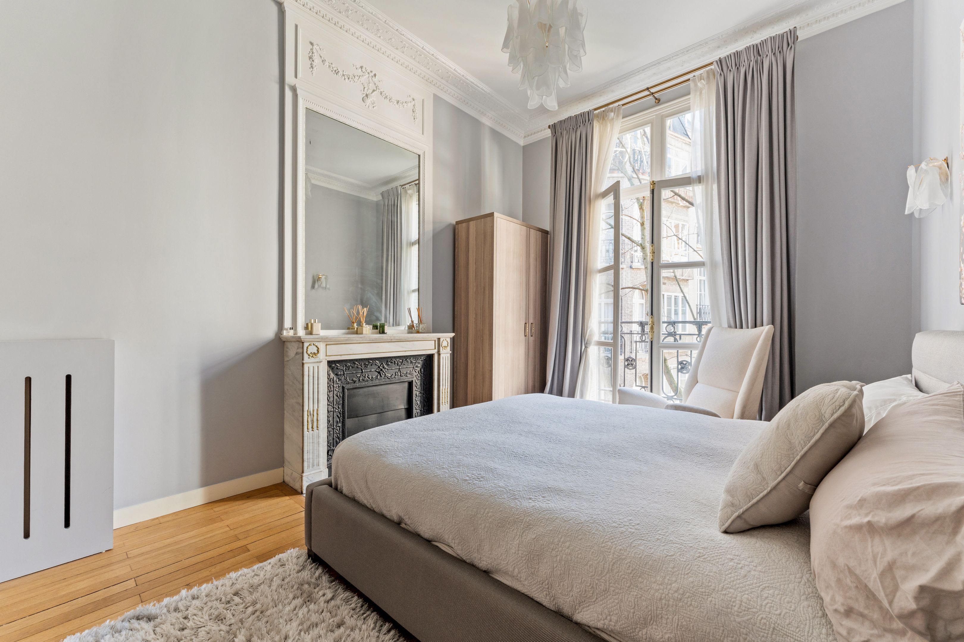 Victor Hugo. Au troisième étage desservi par ascenseur d'un bel immeuble ancien de bon standing et sécurisé, élégant appartement familial d'une surface de 131.10m² loi Carrez bénéficiant du charme de l'ancien (parquet, moulures, cheminées) et de beaux volumes, d'un calme absolu ainsi que d'agréables vues donnant sur de très agréables jardins intérieurs. Entrée, double séjour, salle-à-manger, cuisine semi-ouverte, deux belles chambres profitant chacune leur salle de bains avec toilettes, buanderie, toilettes séparées, nombreux rangements. Débarras.