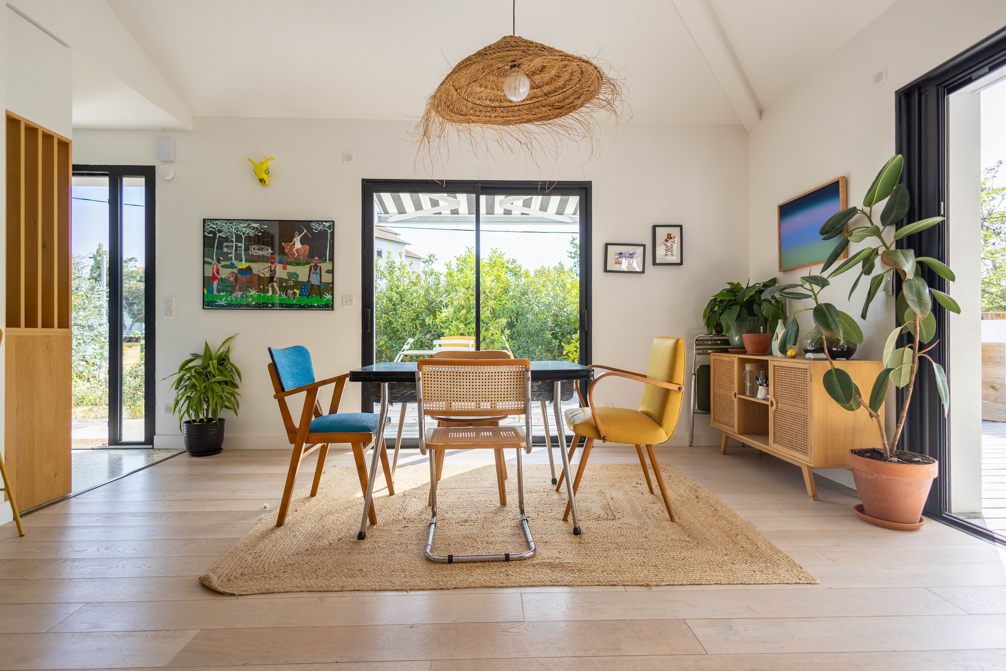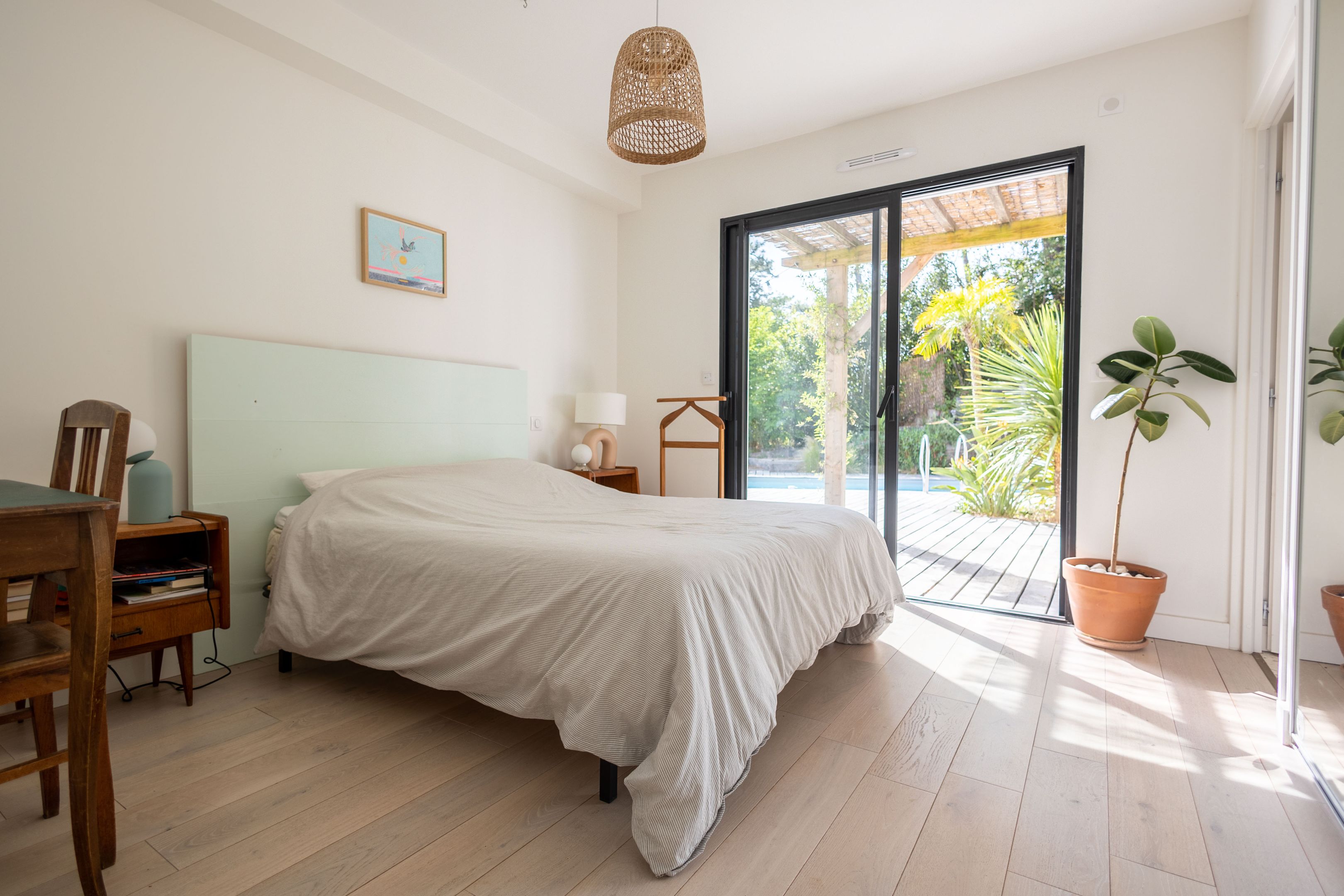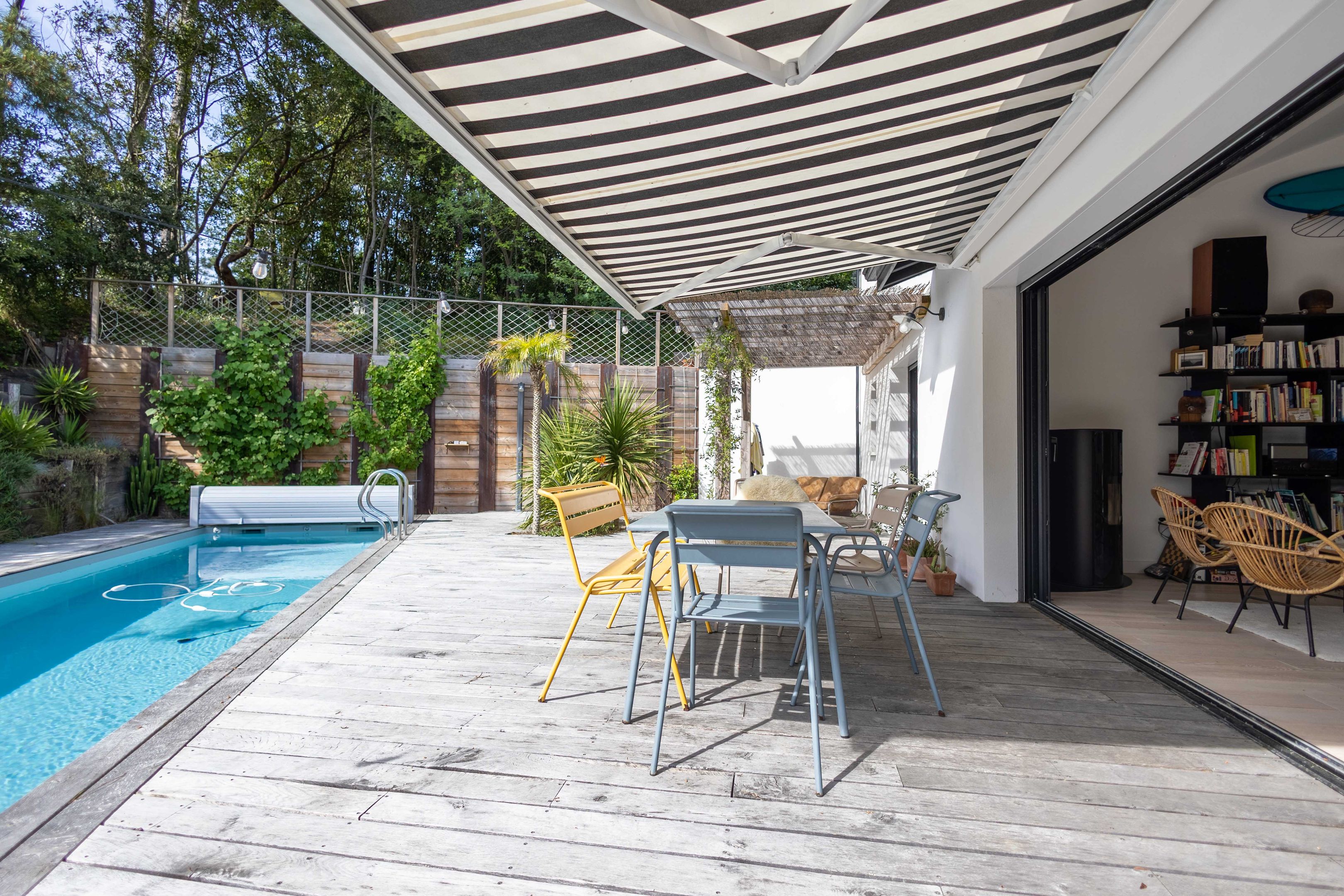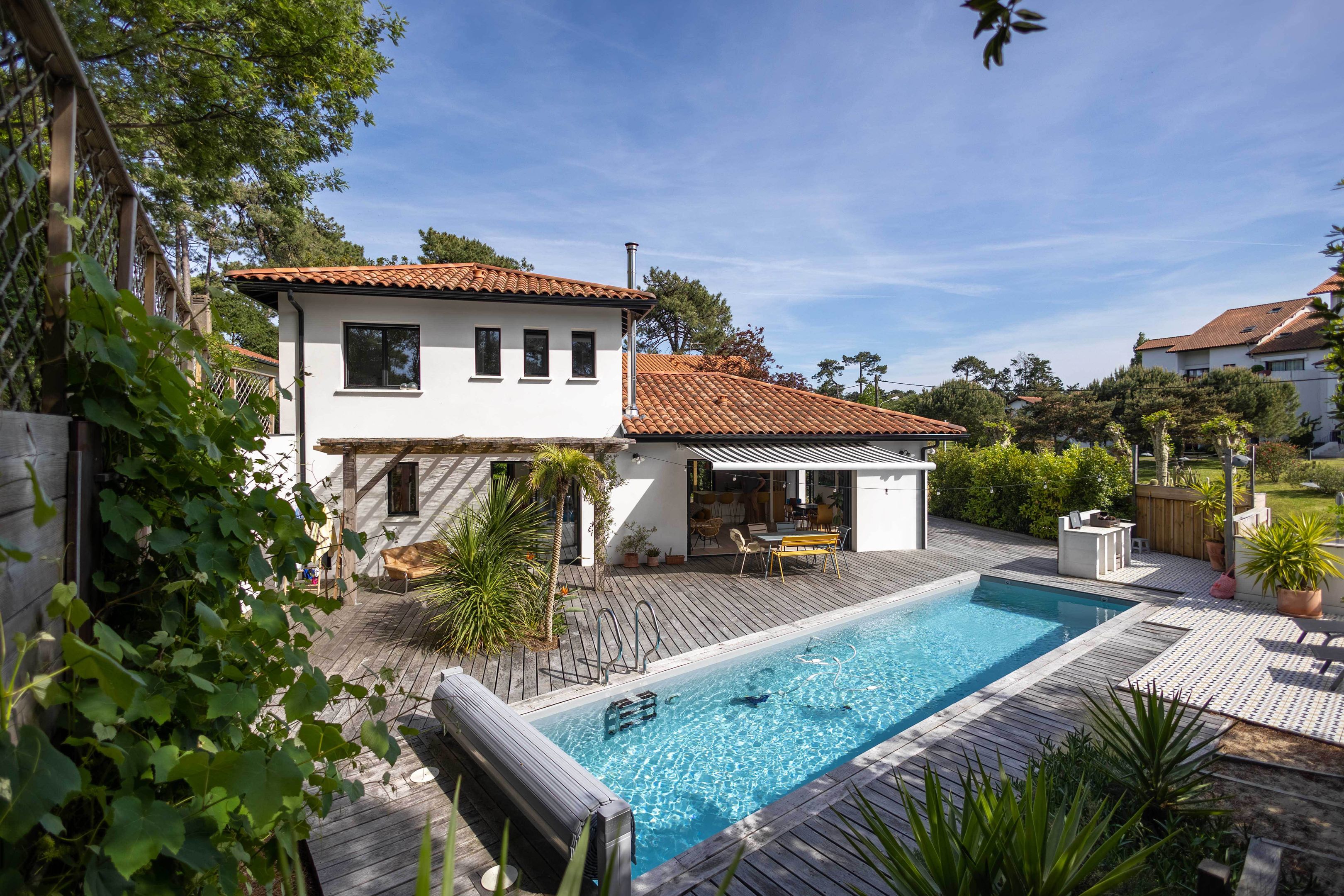 Belle maison d'architecte de 126m² bénéficiant de prestations de qualités, située aux portes du golf de l'Impératrice, à 2 pas des plages, jardin arboré d'environ 700m² offrant un couloir de nage chauffé, espace barbecue.