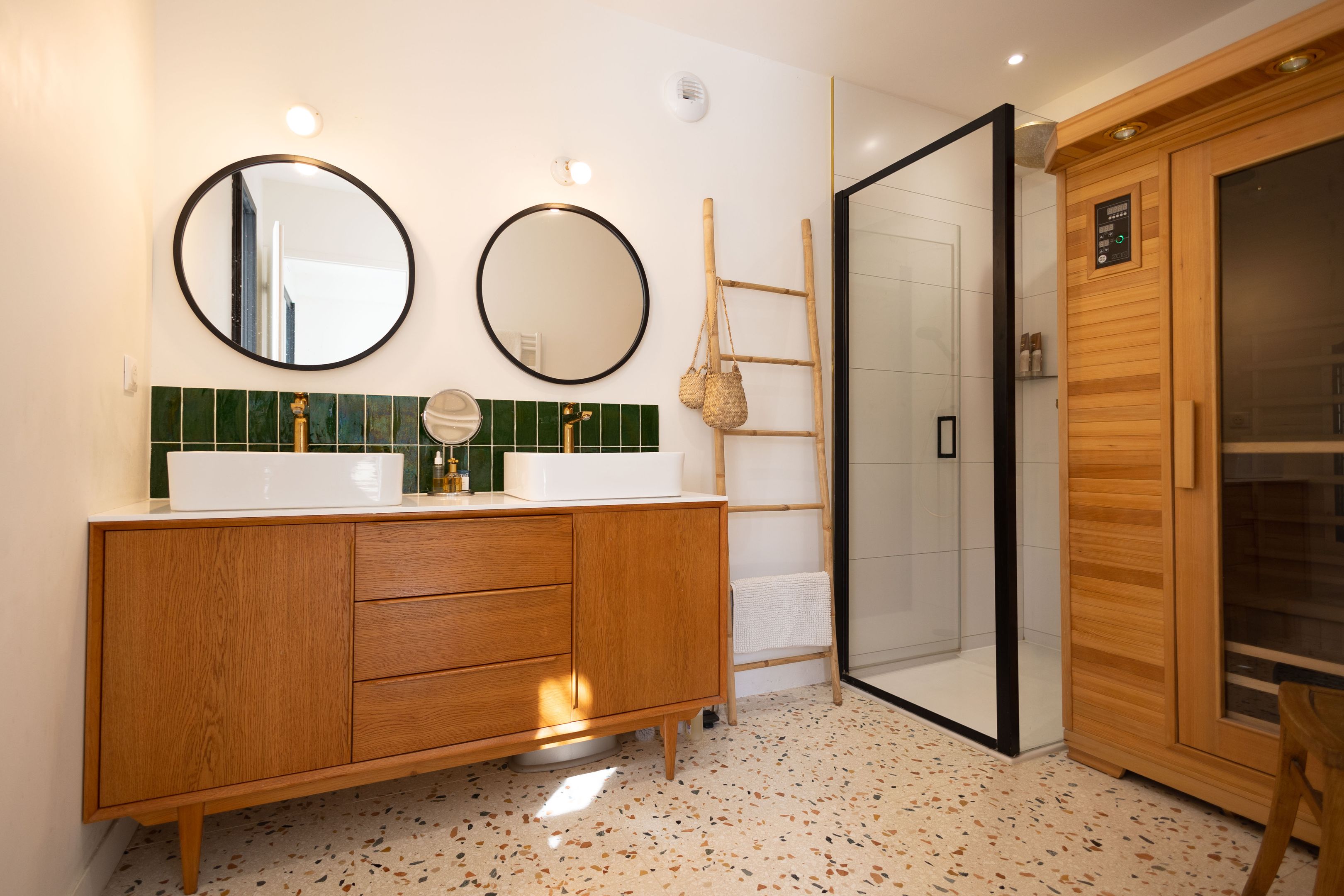 Entrée, salon-séjour, cuisine ouverte aménagée et équipée, 2 chambres dont une parentale, salle d'eau et sauna, toilettes, buanderie. A l'étage : 2 chambres, salle de bain.