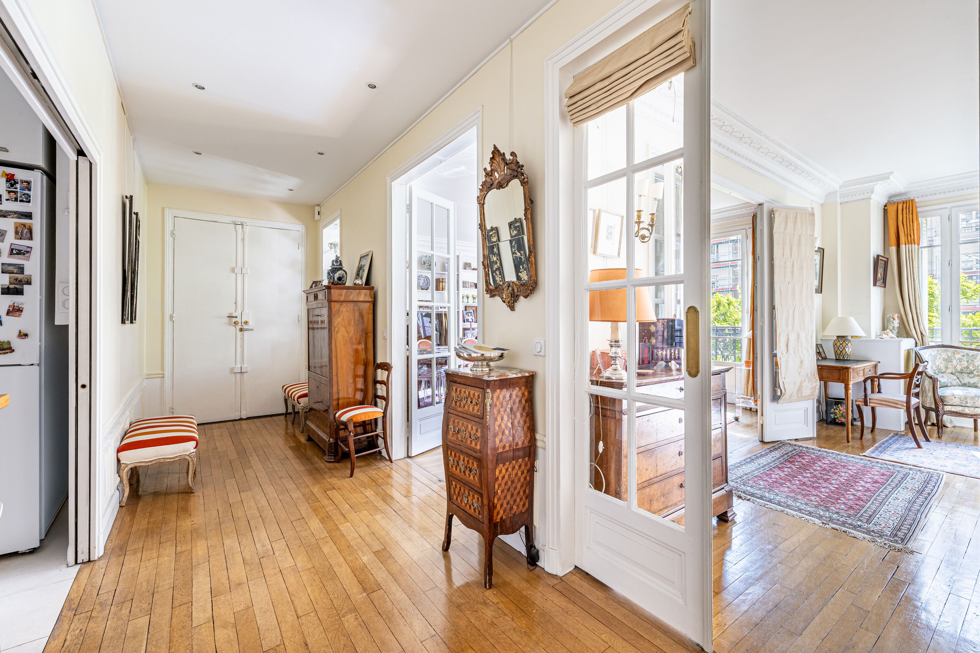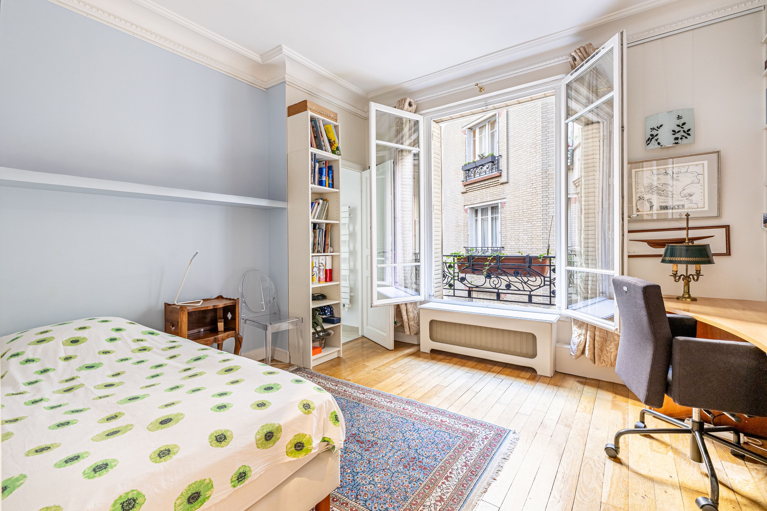 Auteuil Sud. Immeuble pierre de taille de standing des années 30 situé à quelques pas de toutes les commodités. Au 4ème étage appartement familial de 116m² bénéficiant de beaux volumes et d'une belle luminosité grâce à son exposition au Sud-Ouest. Entrée, salon-salle à manger, cuisine indépendante aménagée et équipée, trois chambres dont deux au calme sur cour, nombreux rangements, deux salles d'eau dont une avec toilettes, toilettes invités. Cave. Possibilité d'acquérir une chambre de service de 6,77m² avec douche et kitchenette située au 8ème étage (ascenseur jusqu'au 7ème) au prix de 50 000 €.