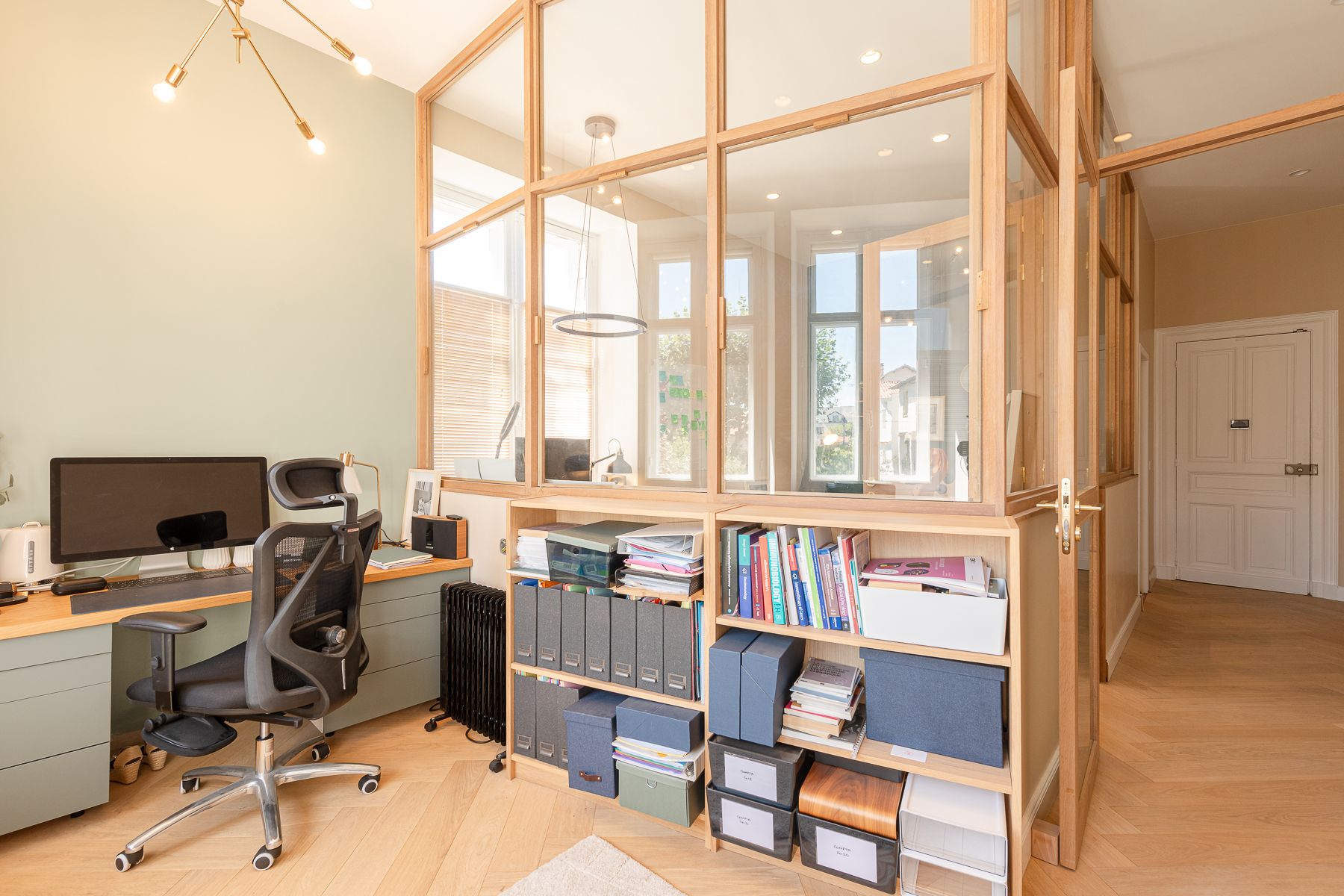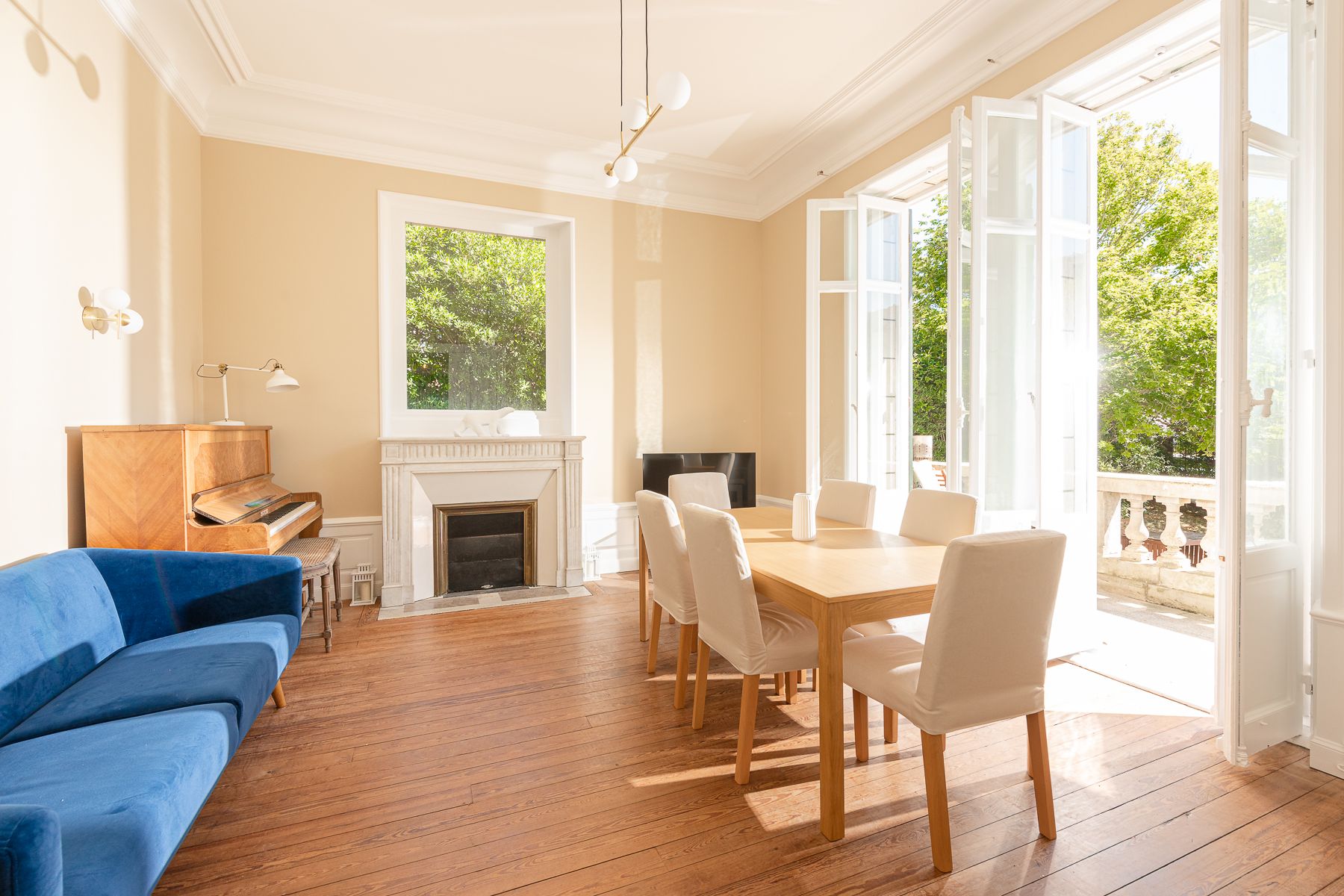 Au sein d'une demeure prestigieuse construite par le célèbre architecte biarrot Gustave Huguenin, à l'origine de la construction de la Villa d'Ilbarritz, appartement de 5 pièces en rez-de-chaussée d'une surface de 126 m², quadruple exposition. Entrée, séjour doté d'une double exposition avec balcon donnant sur jardin. 2 chambres très au calme, 3 salles d'eau avec toilettes, 2 bureaux vitrés. Faisabilité validée et chiffrée pour l'aménagement d'une cuisine ouverte sur séjour:salle à manger. Espaces modulables et fort potentiel pour de l'aménagement résidentiel ou l'exercice d'une profession libérale. Jardin d'agrément en jouissance exclusive de 600 m2, partie piscinable à l'arrière, implantation possible d'un garage couvert, 6 places de stationnements supplémentaires, cave de 15 m2. L'annonce comprend une photo non contractuelle (cuisine home-staging)