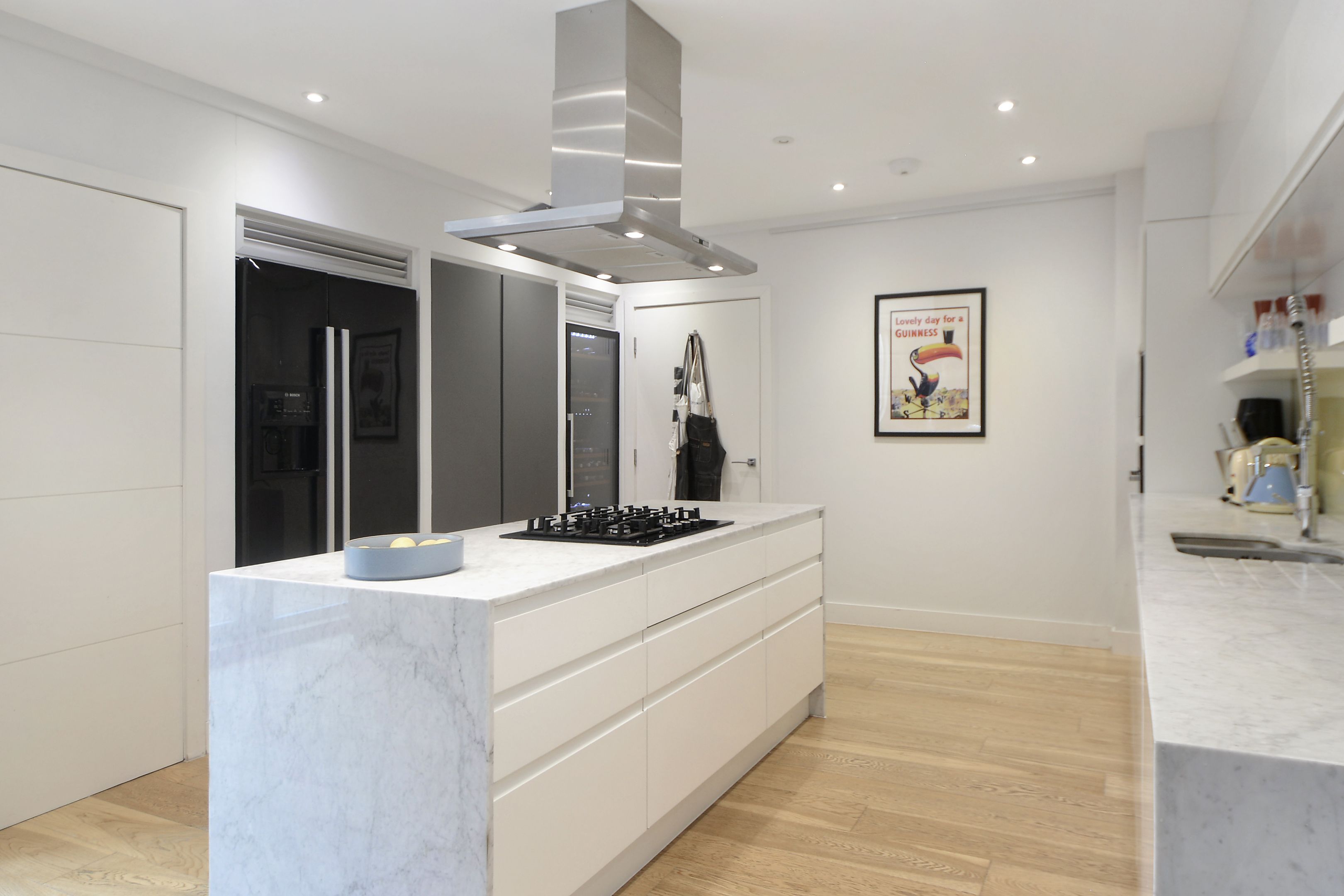 présente un design épuré et contemporain, avec un grand espace de travail et des appareils électroménagers haut de gamme, parfaits pour les passionnés de cuisine et les invités.