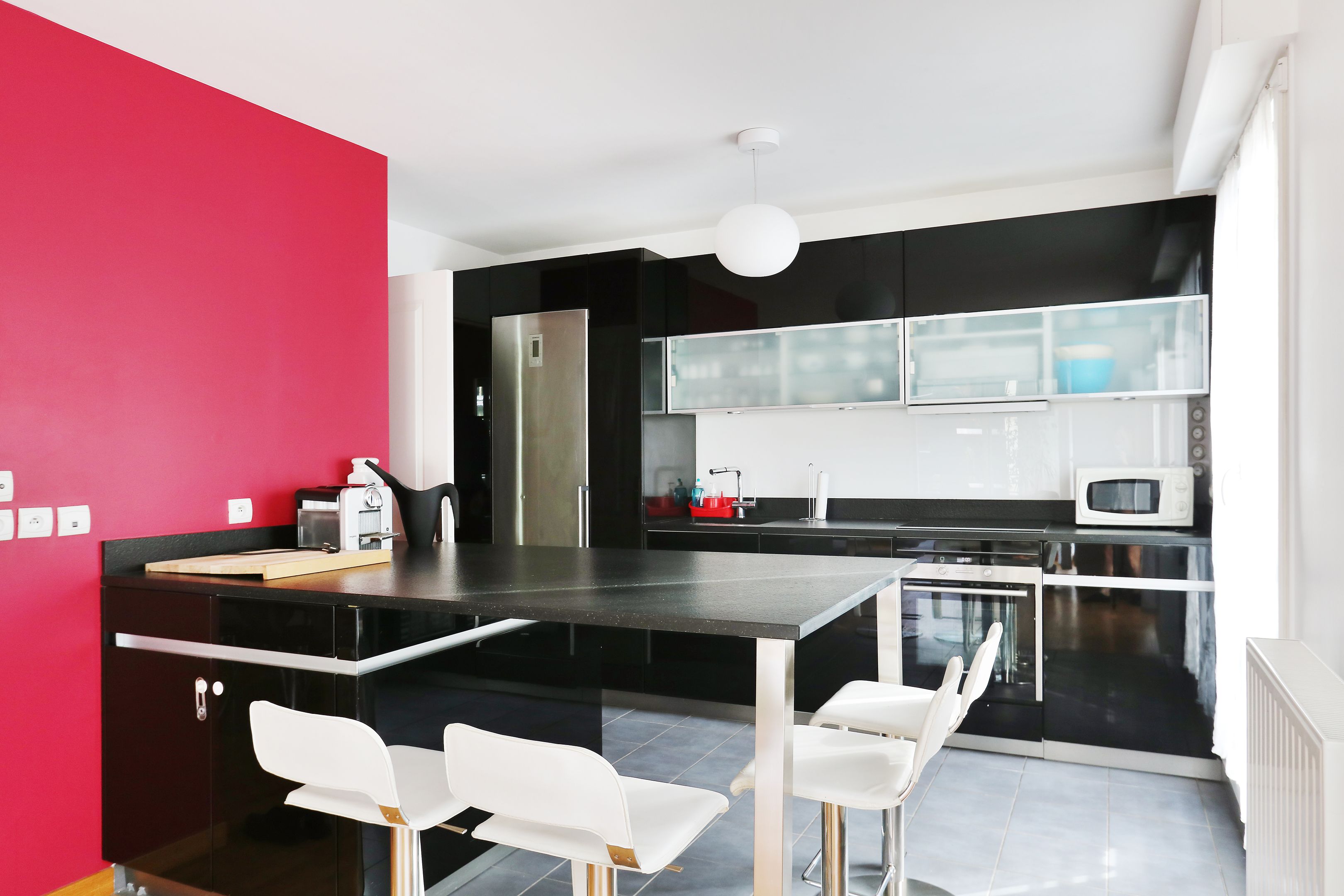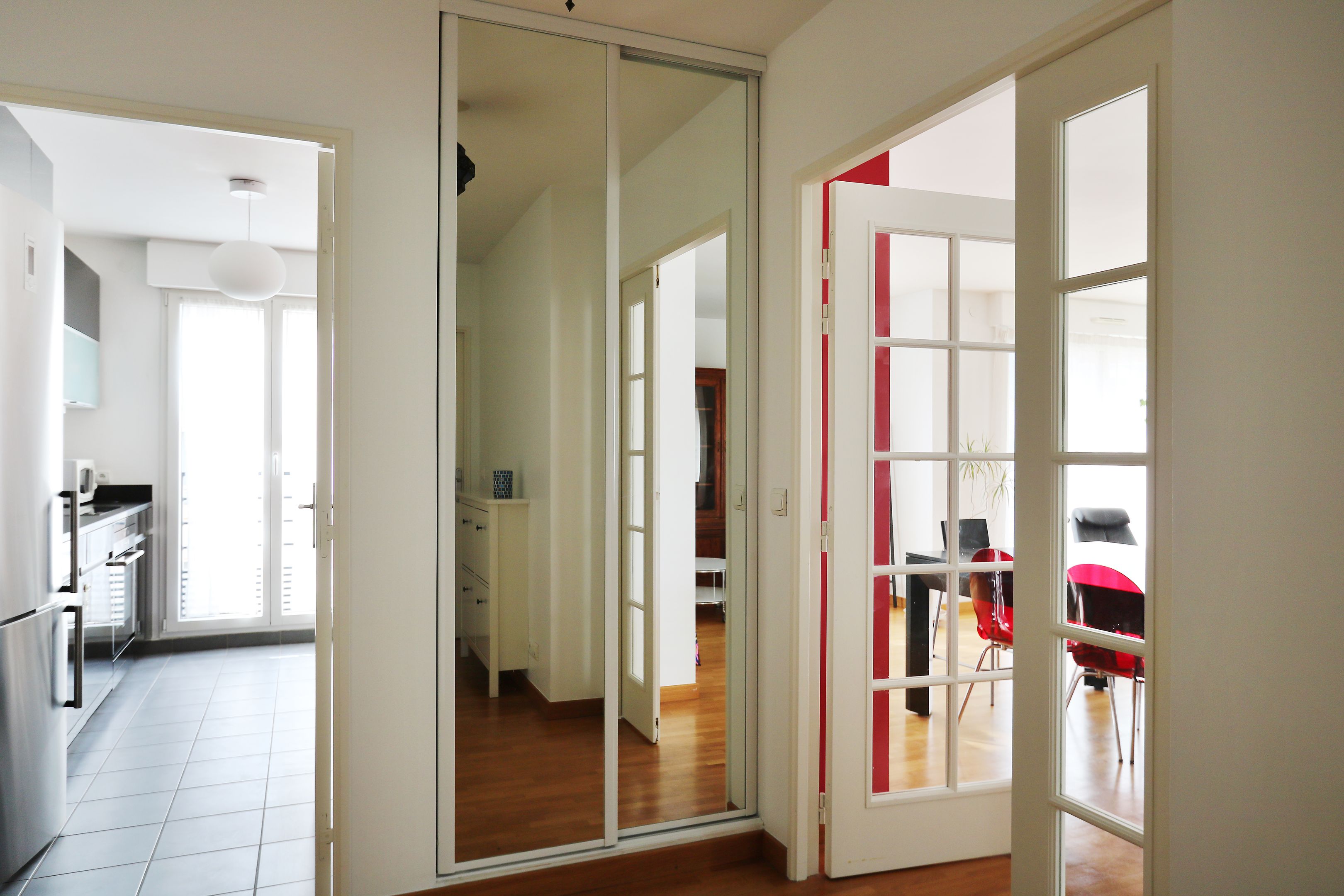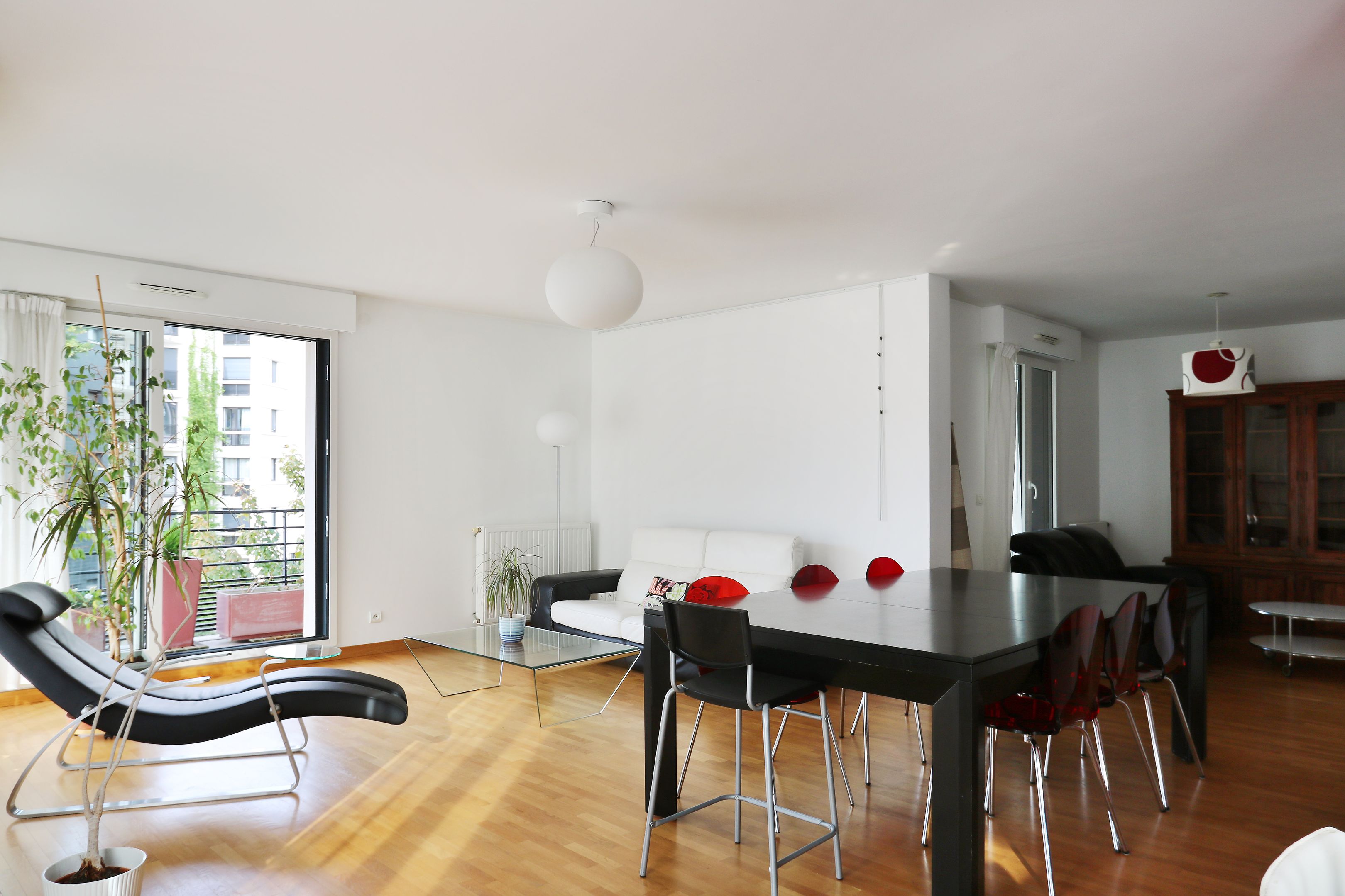 Entrée, double séjour, cuisine ouverte aménagée et équipée, 3 chambres dotées de placards de rangement, salle de douche avec toilettes, salle de bains, toilettes séparées.