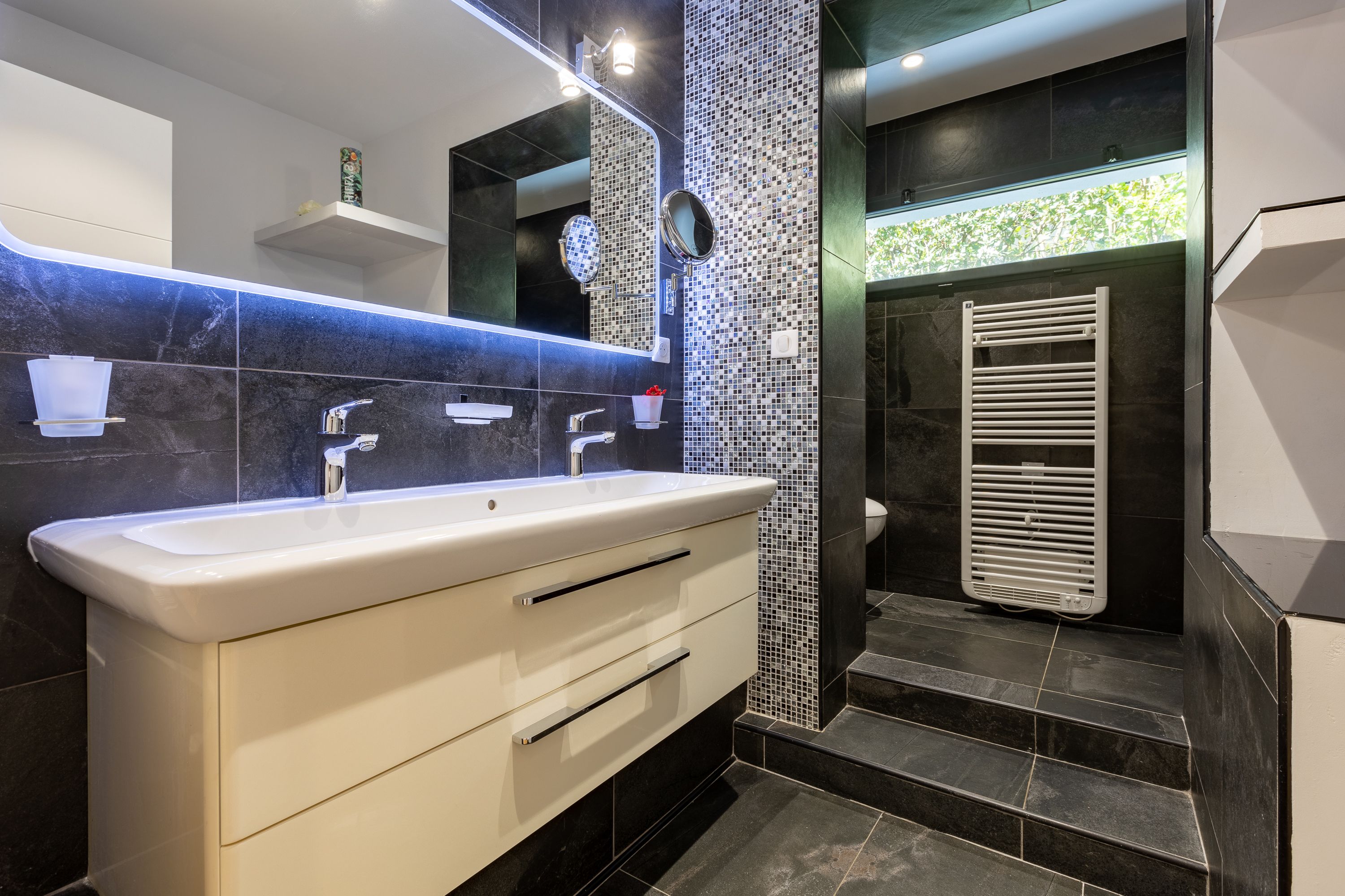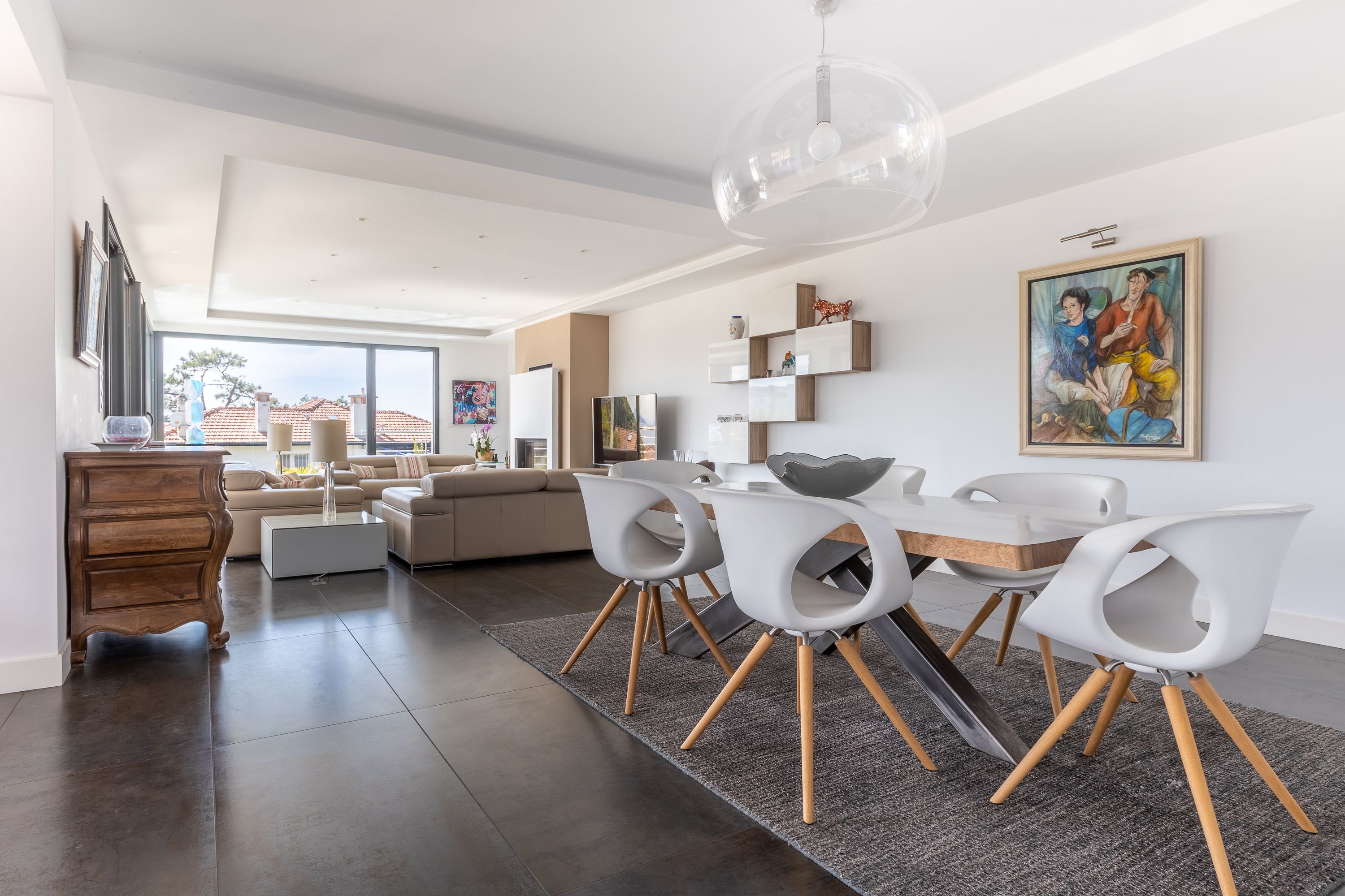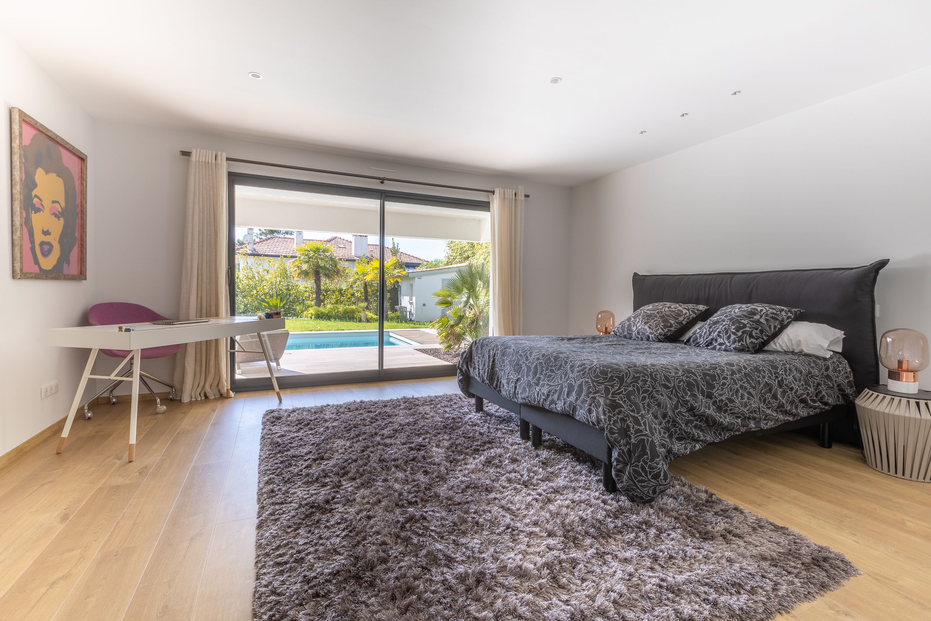 Belle pièce de vie avec cuisine ouverte et grand salon lumineux avec accès terrasse, 4 chambres dont une avec bureau (3 lits queen size et 1 lit simple) et 3 salles de bains. En extérieur : une grande piscine chauffée, et possibilité de stationner plusieurs véhicules (devant la maison ou dans le garage fermé).