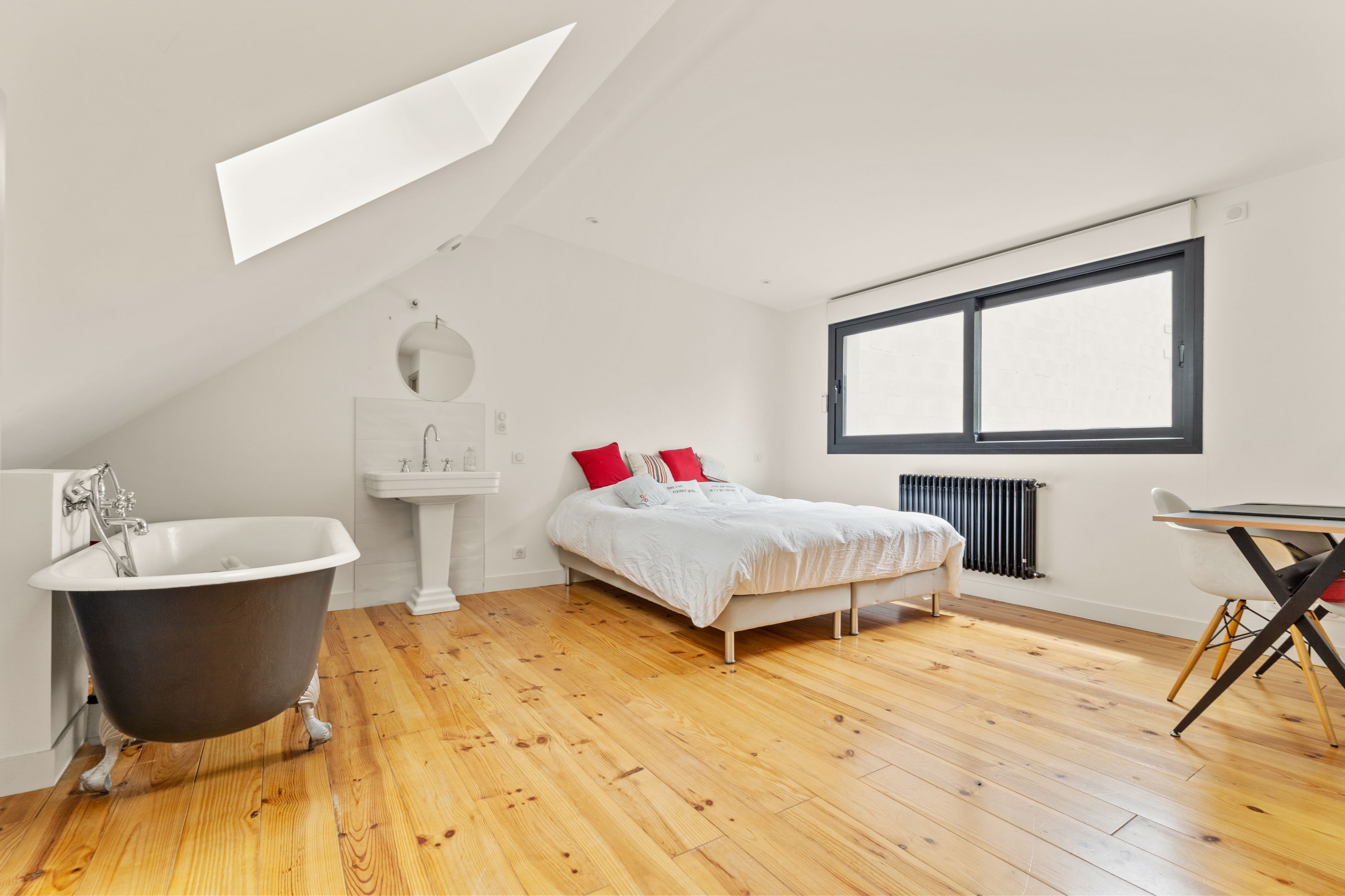 Au 3ème et dernier étage : grande chambre sous les toits dotée d’une baignoire, un lavabo et des toilettes séparées.