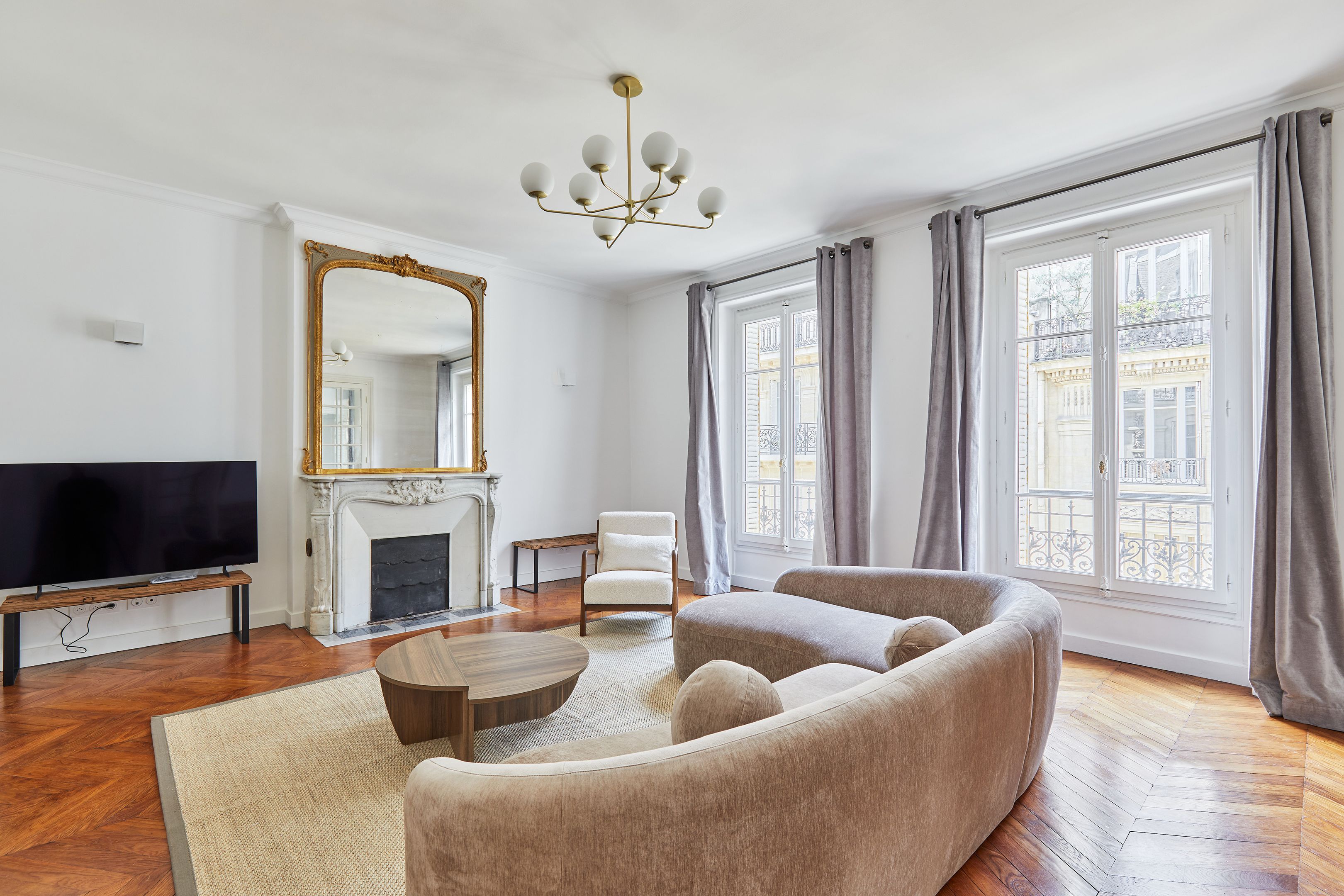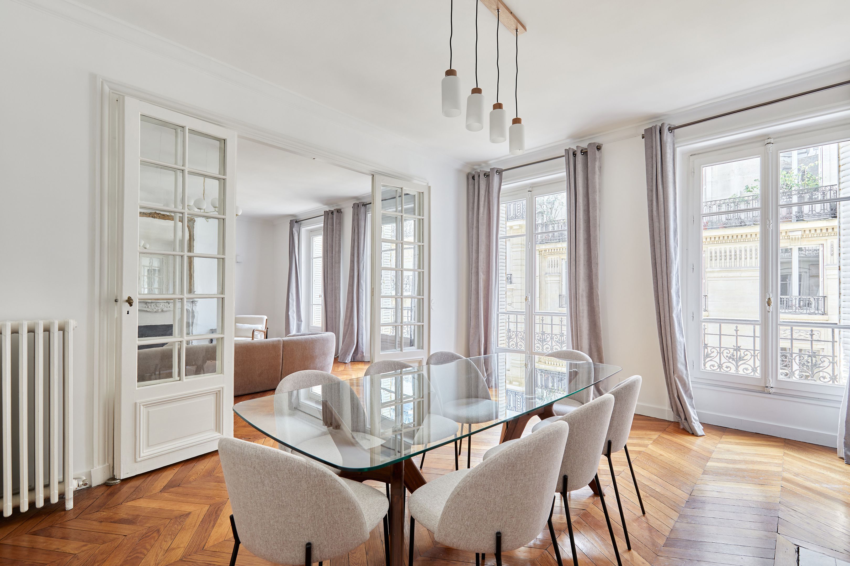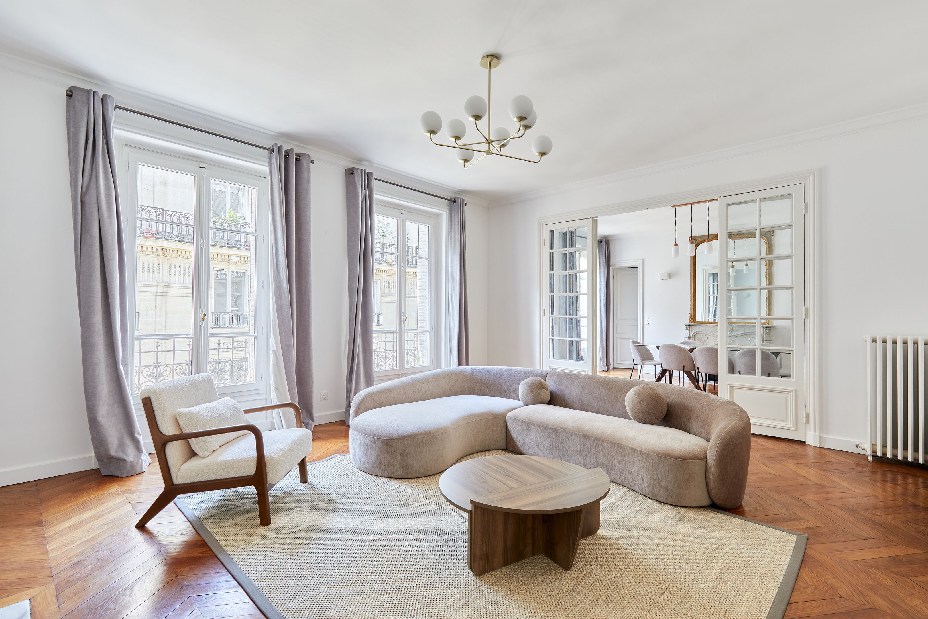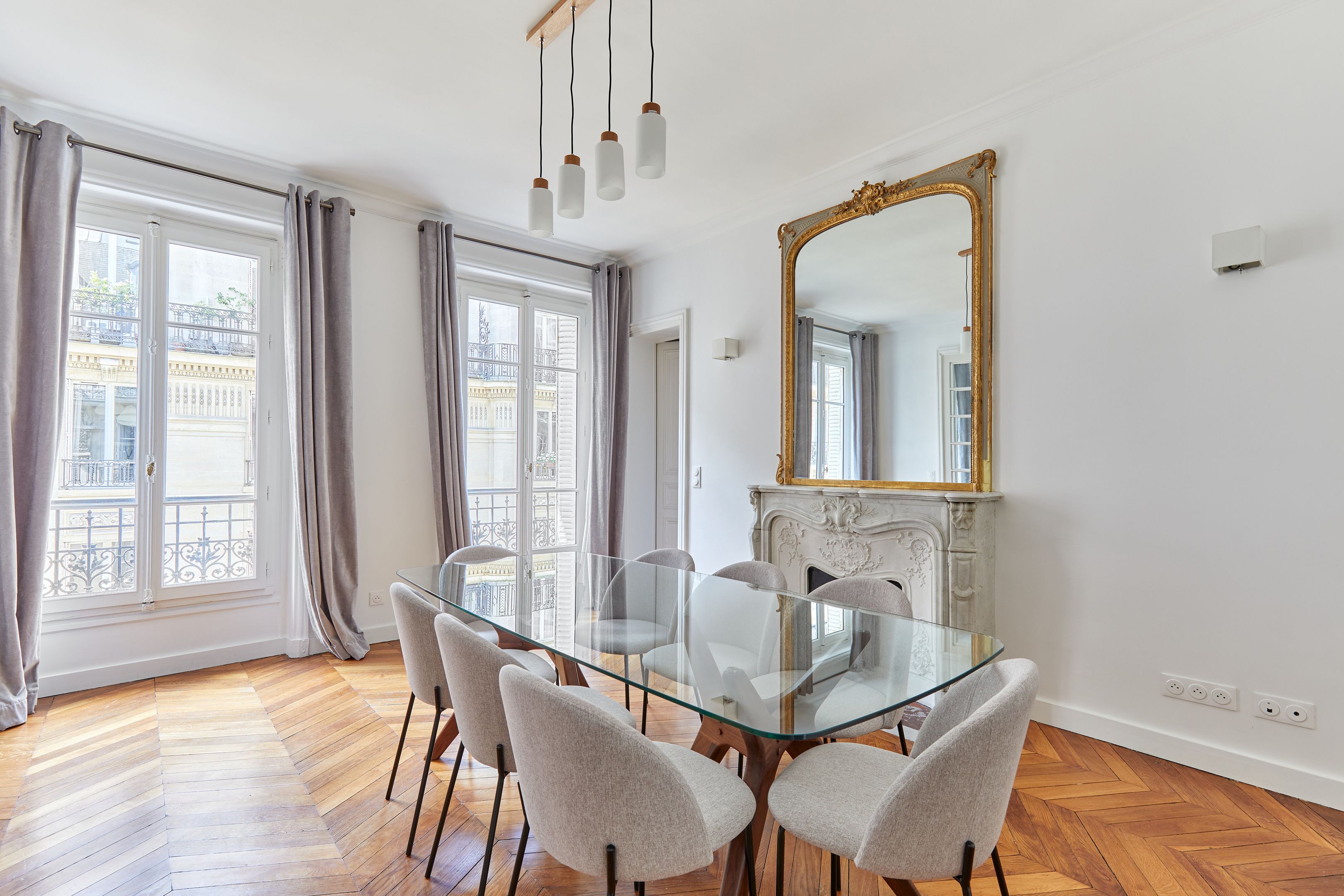 Dans un immeuble ancien parfaitement entretenu, au quatrième étage desservi par ascenseur, appartement meublé de 157,94 m², en très bon état et au mobilier neuf. Entrée, salon et salle à manger sur rue, cuisine dînatoire aménagée et équipée avec espace buanderie séparé, suite parentale (chambre avec placard et salle de bain complète : baignoire, douche, toilettes), deux chambres sur cour avec placards, salle de bains et deux toilettes séparées.