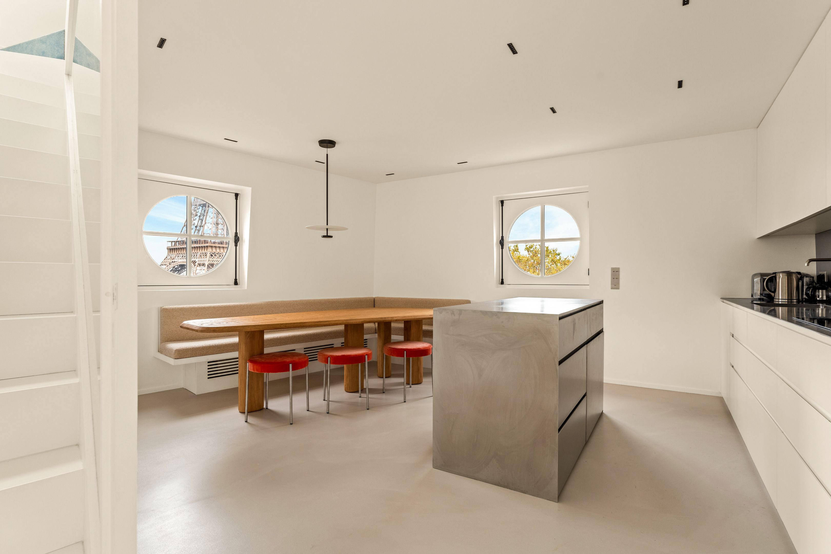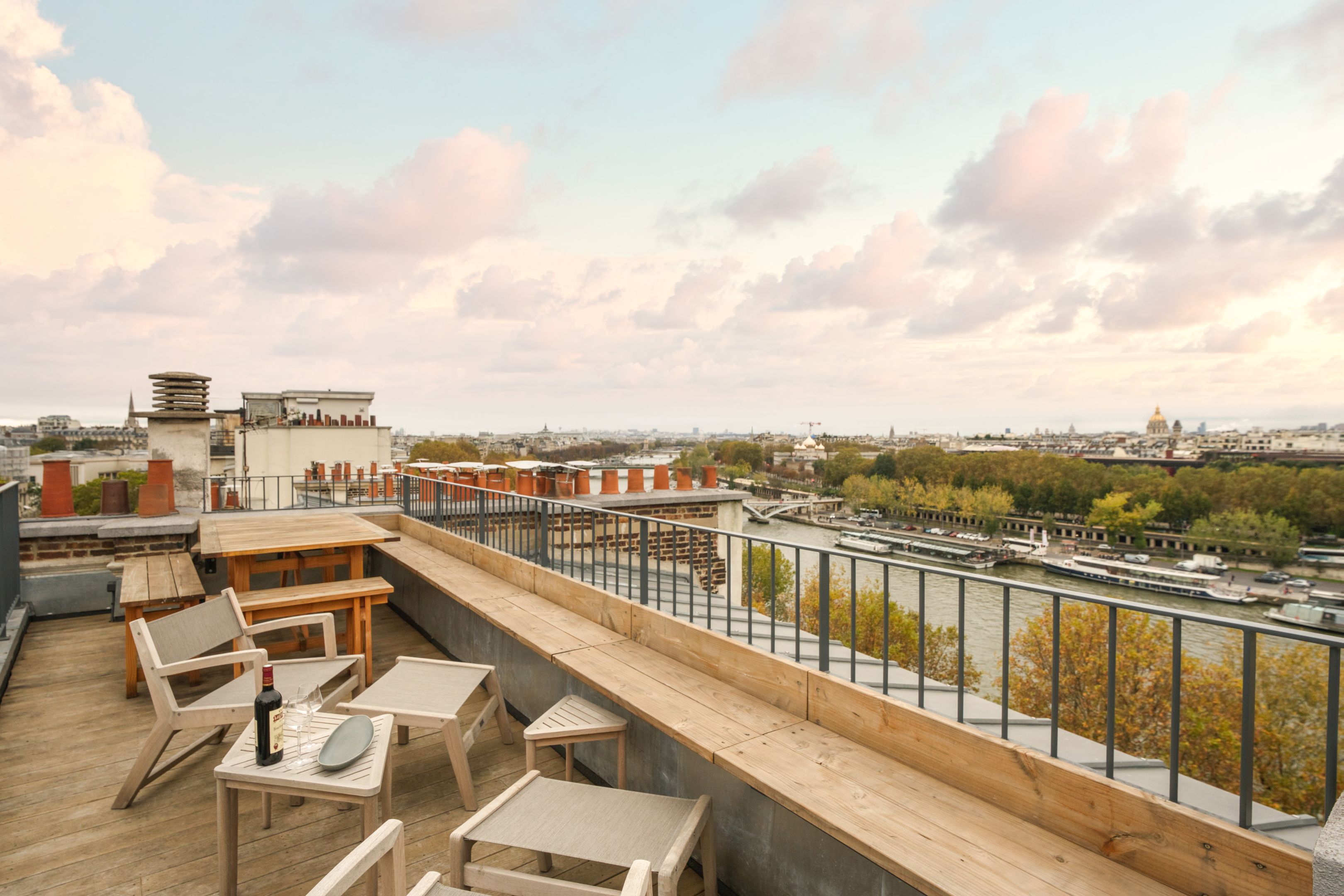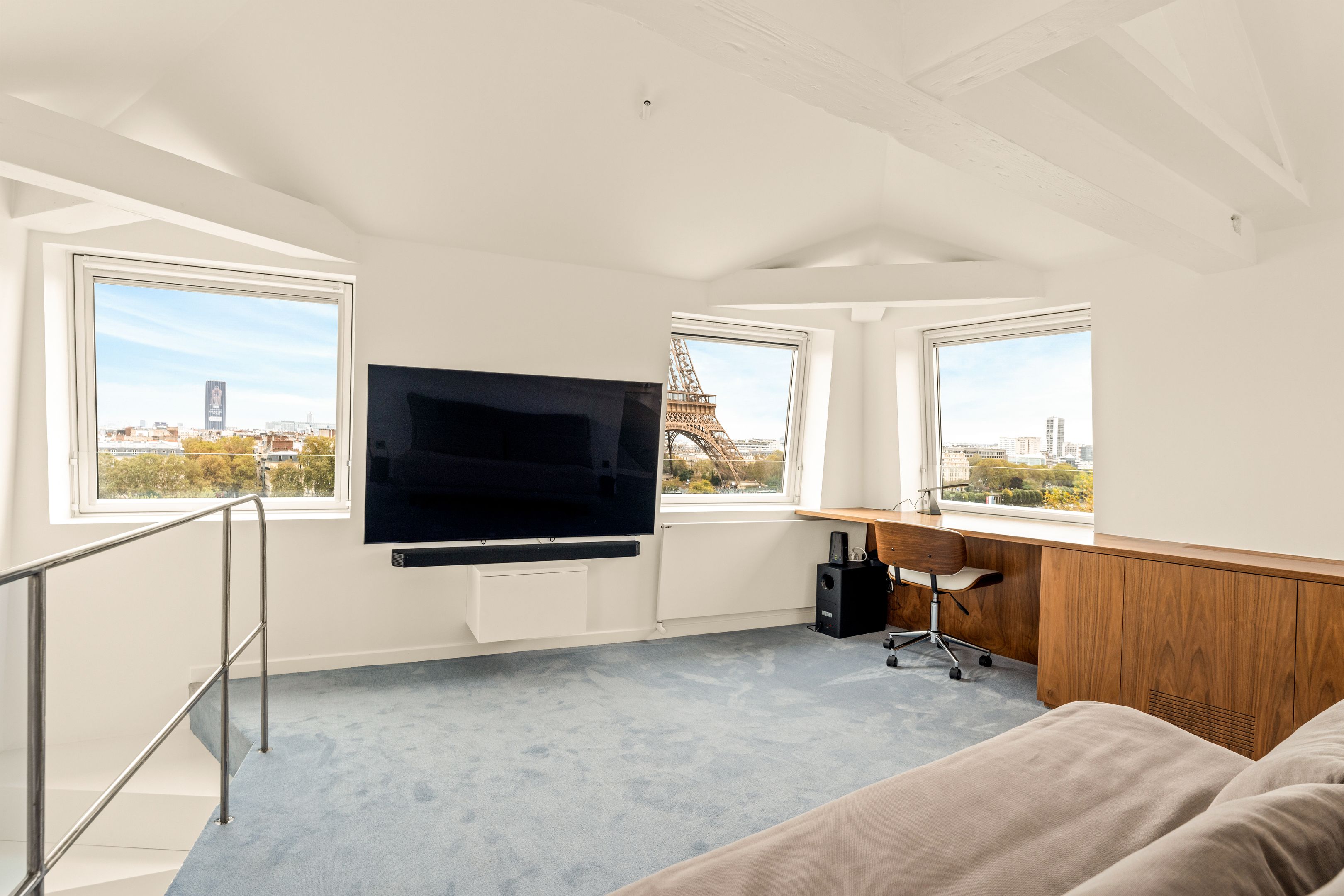 Duplex de standing offrant une vue exceptionnelle sur la Tour Eiffel depuis terrasse et rooftop. Suite parentale, chambres enfants, suite invités avec kitchenette, bureau et espace pour personnel. Climatisation et décoration design pour un confort optimal.