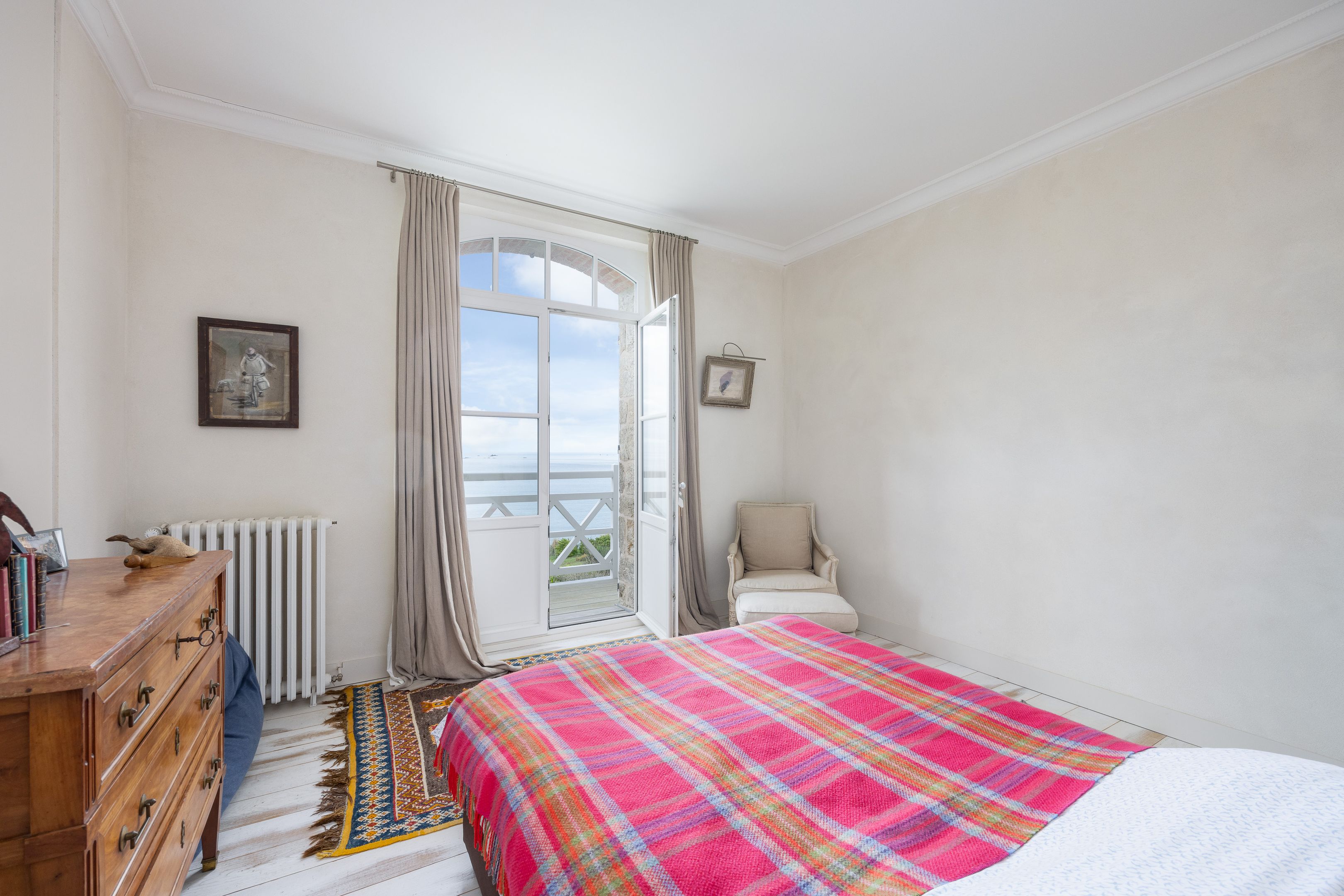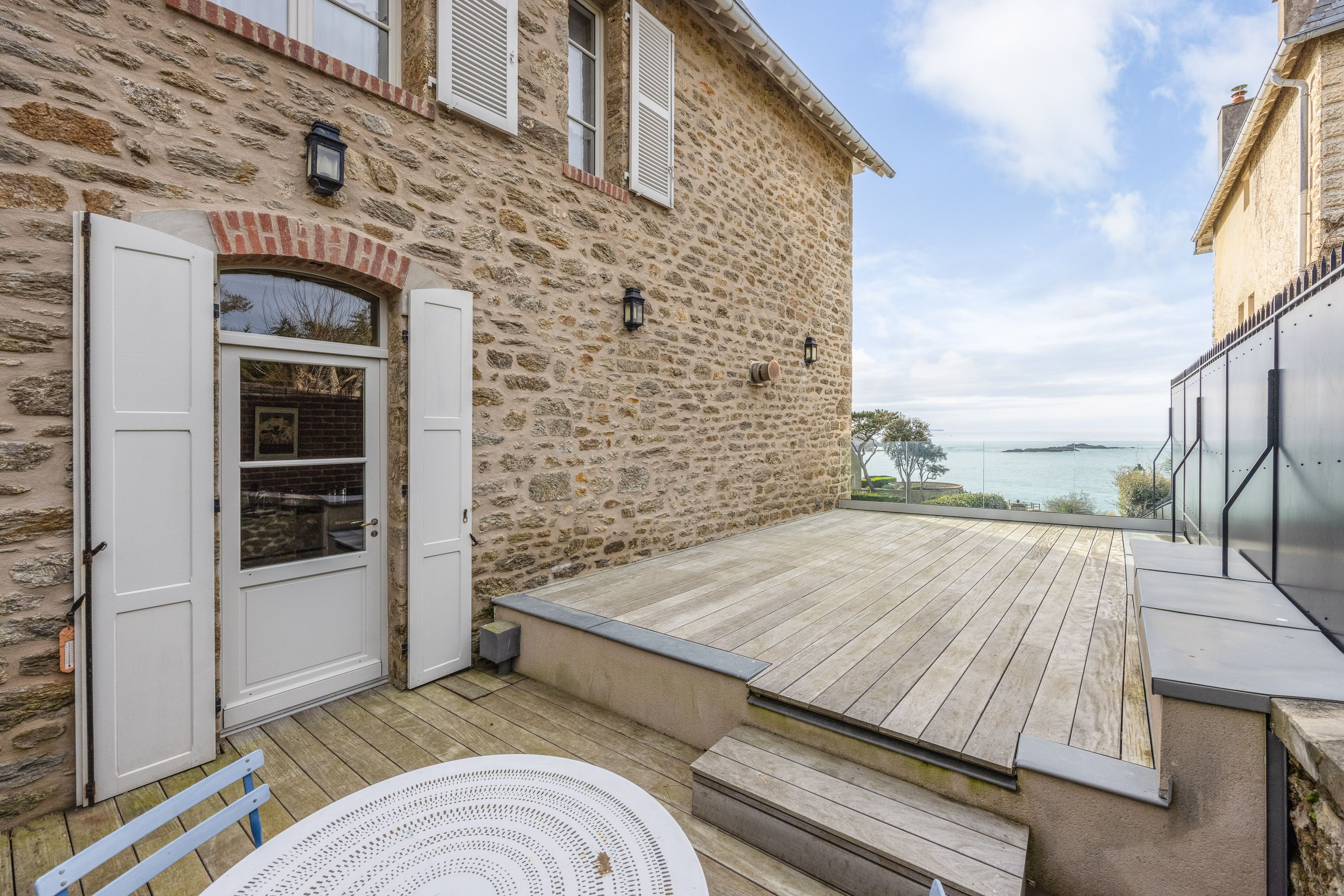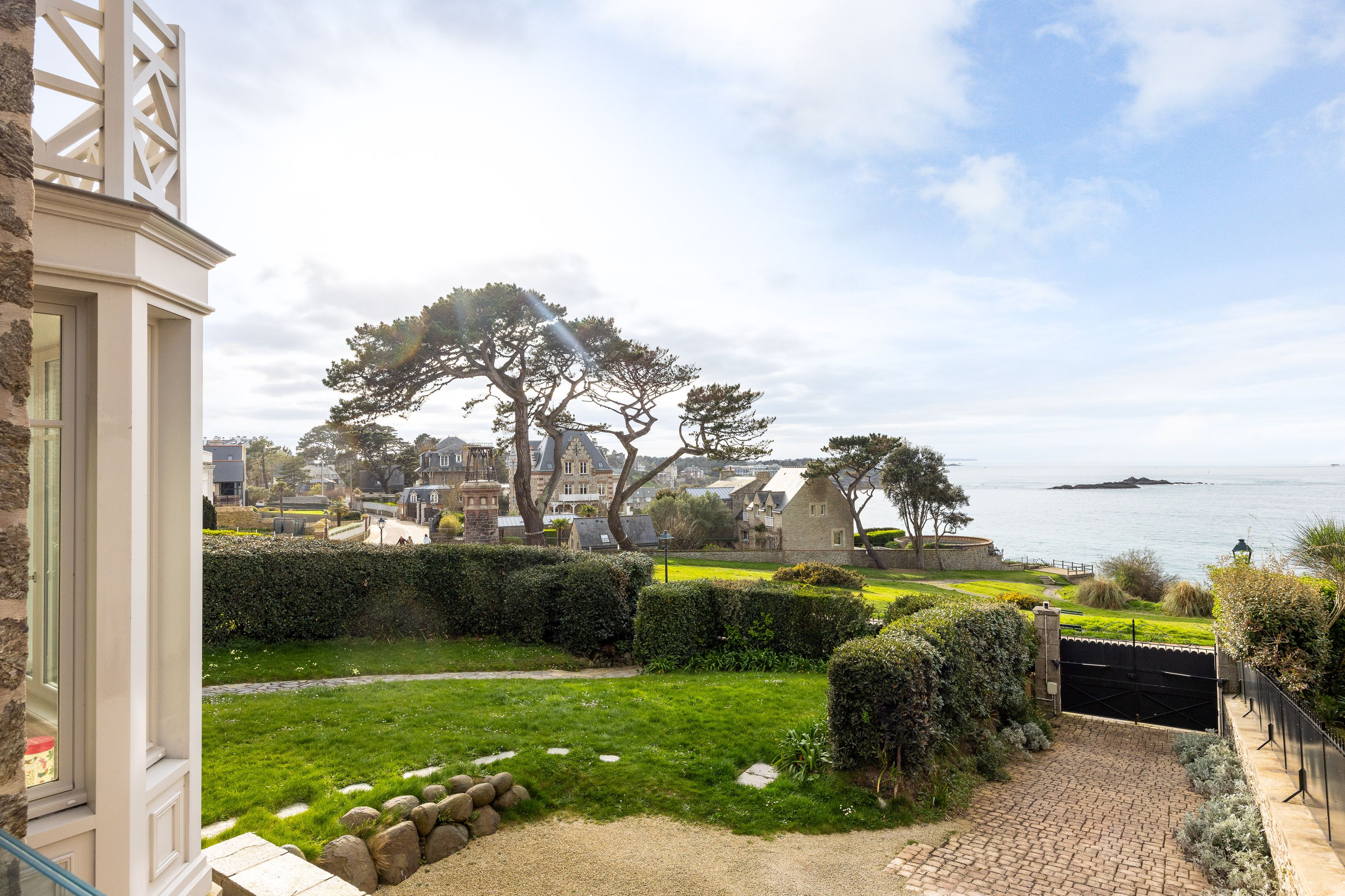 VENDUE PAR BRETEUIL - Exceptionnelle propriété pleine vue mer, bénéficiant d'un emplacement unique dans le très privilégié quartier de la Malouine à Dinard, surplombant le jardin et la baie de Port Riou avec vue panoramique sur la mer. Cette demeure de caractère bénéficie d’une rénovation complète par architecte avec des matériaux et prestations de grande qualité, d’une très bonne distribution avec de beaux volumes et d'une agréable luminosité grâce à son exposition traversante et ses nombreuses ouvertures. Entrée, vaste et très lumineuse pièce de réception avec séjour – salle à manger avec parquet Point de Hongrie, cheminée et bow-window dominant la mer, cuisine ouverte équipée, nombreux rangements et toilettes séparées. Au 1er étage : suite parentale avec chambre et balcon vue mer, salle de bains avec douche et baignoire et grand dressing, seconde chambre avec vue mer et toilettes séparées. Au 2nd étage : 2 chambres de belle taille, salle d’eau et toilettes séparées. En rez-de-jardin : bureau ou chambre d’appoint, buanderie, douche retour de plage et grand garage fermé. Enfin, jardin de 850m² environ, clos et sans vis-à-vis, avec de nombreuses terrasses à l’abri des vents dominants.