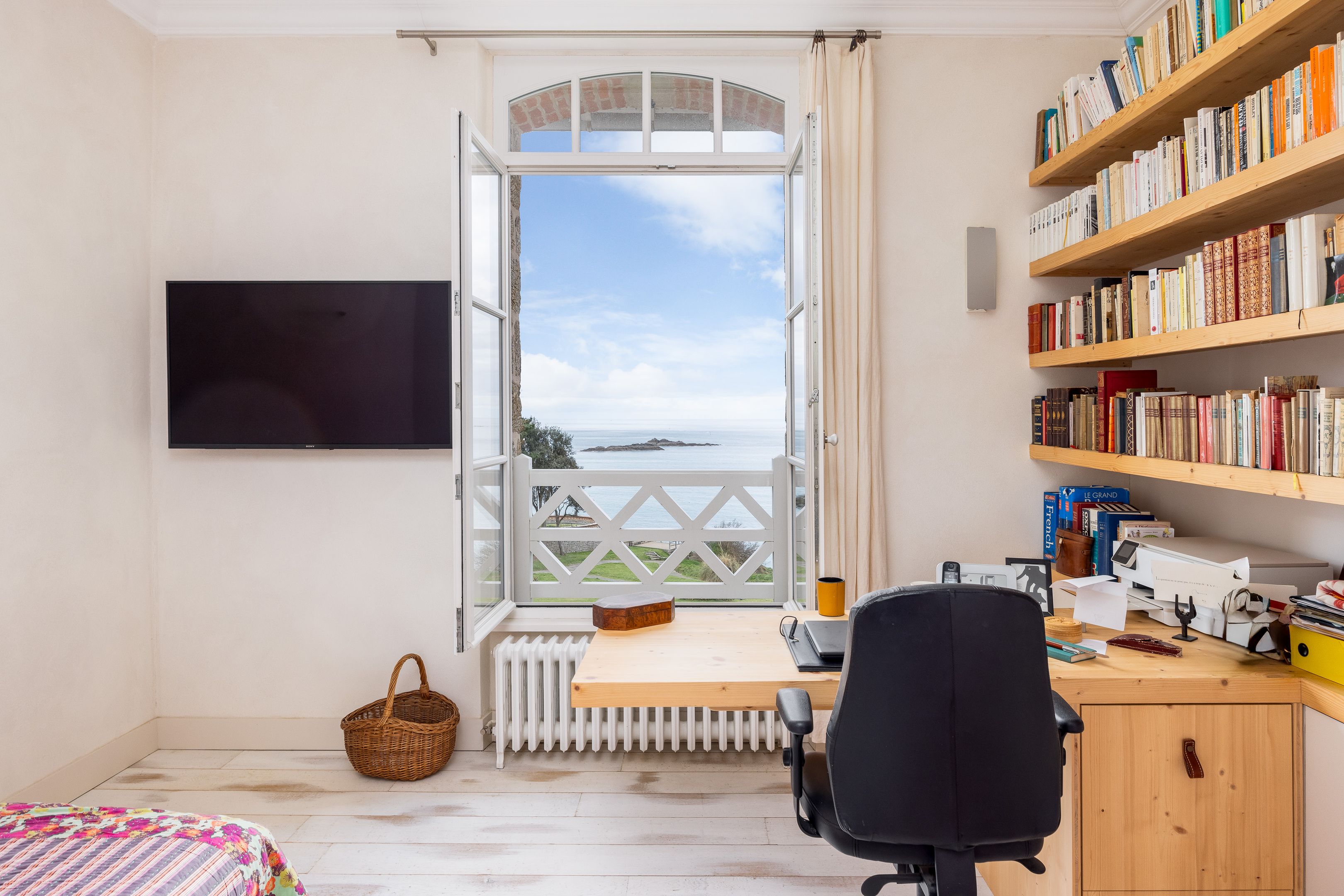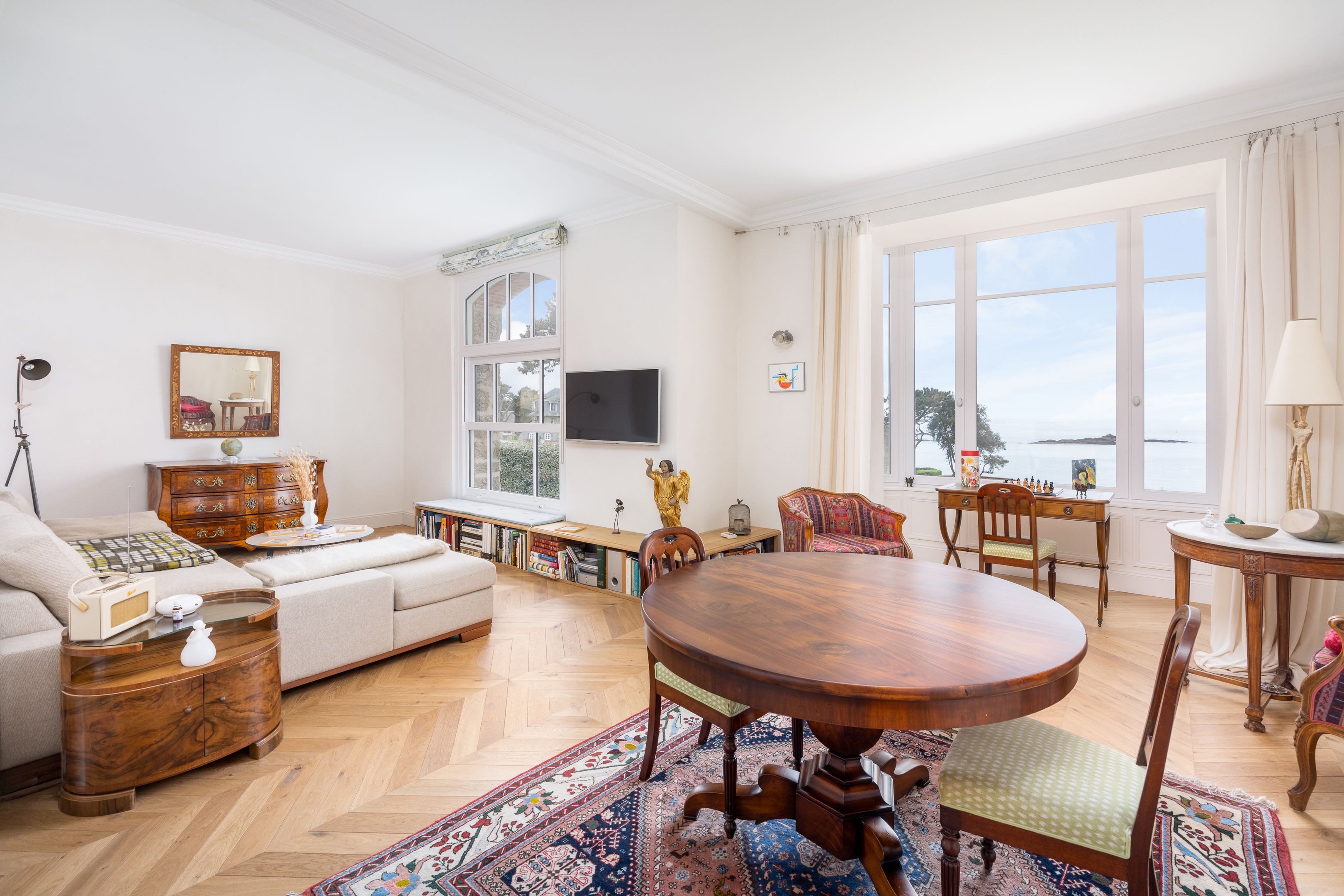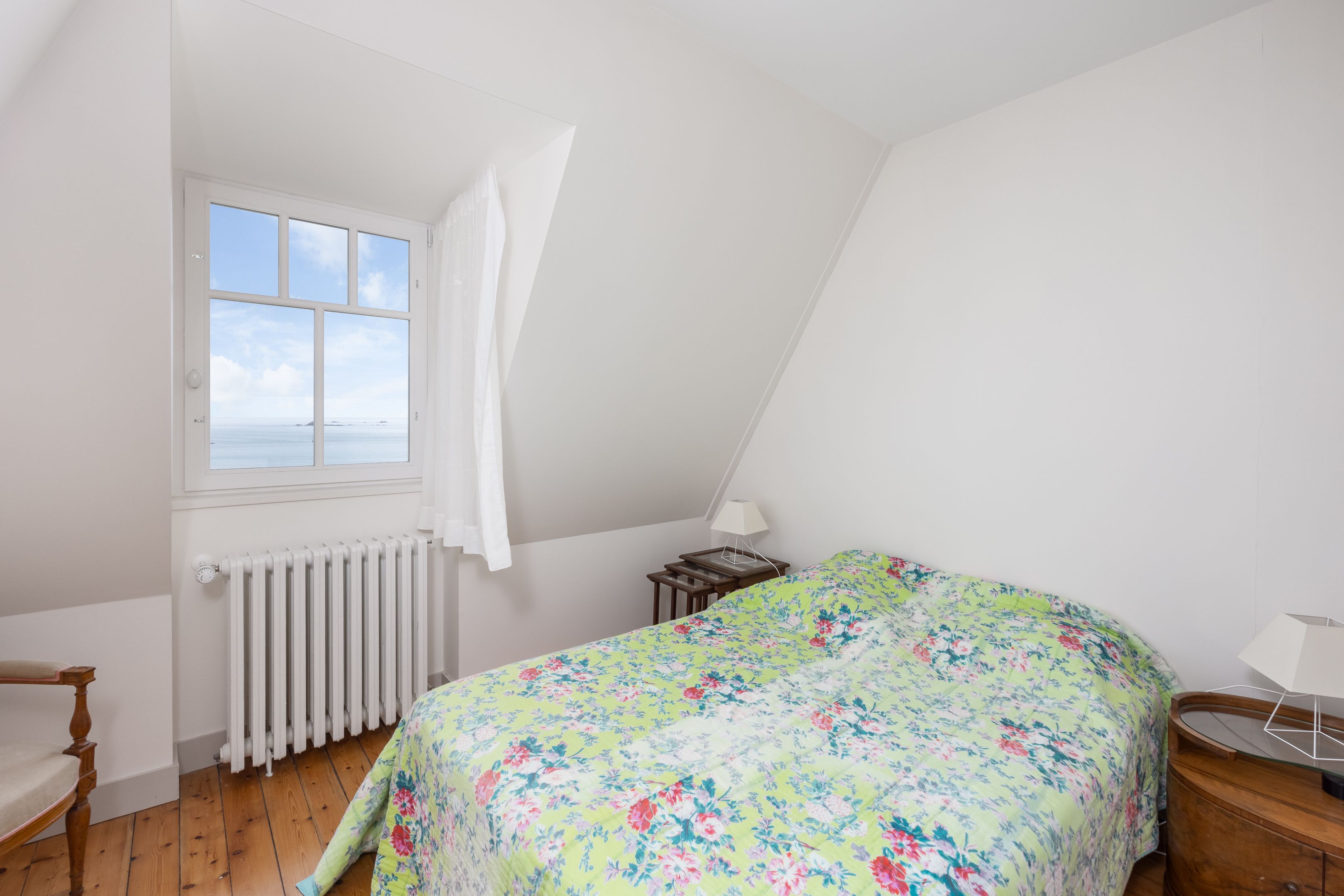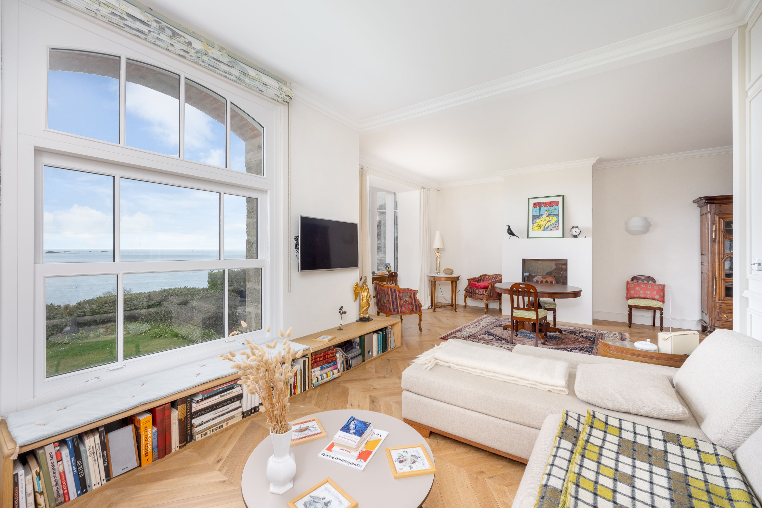 VENDUE PAR BRETEUIL - Exceptionnelle propriété pleine vue mer, bénéficiant d'un emplacement unique dans le très privilégié quartier de la Malouine à Dinard, surplombant le jardin et la baie de Port Riou avec vue panoramique sur la mer. Cette demeure de caractère bénéficie d’une rénovation complète par architecte avec des matériaux et prestations de grande qualité, d’une très bonne distribution avec de beaux volumes et d'une agréable luminosité grâce à son exposition traversante et ses nombreuses ouvertures. Entrée, vaste et très lumineuse pièce de réception avec séjour – salle à manger avec parquet Point de Hongrie, cheminée et bow-window dominant la mer, cuisine ouverte équipée, nombreux rangements et toilettes séparées. Au 1er étage : suite parentale avec chambre et balcon vue mer, salle de bains avec douche et baignoire et grand dressing, seconde chambre avec vue mer et toilettes séparées. Au 2nd étage : 2 chambres de belle taille, salle d’eau et toilettes séparées. En rez-de-jardin : bureau ou chambre d’appoint, buanderie, douche retour de plage et grand garage fermé. Enfin, jardin de 850m² environ, clos et sans vis-à-vis, avec de nombreuses terrasses à l’abri des vents dominants.