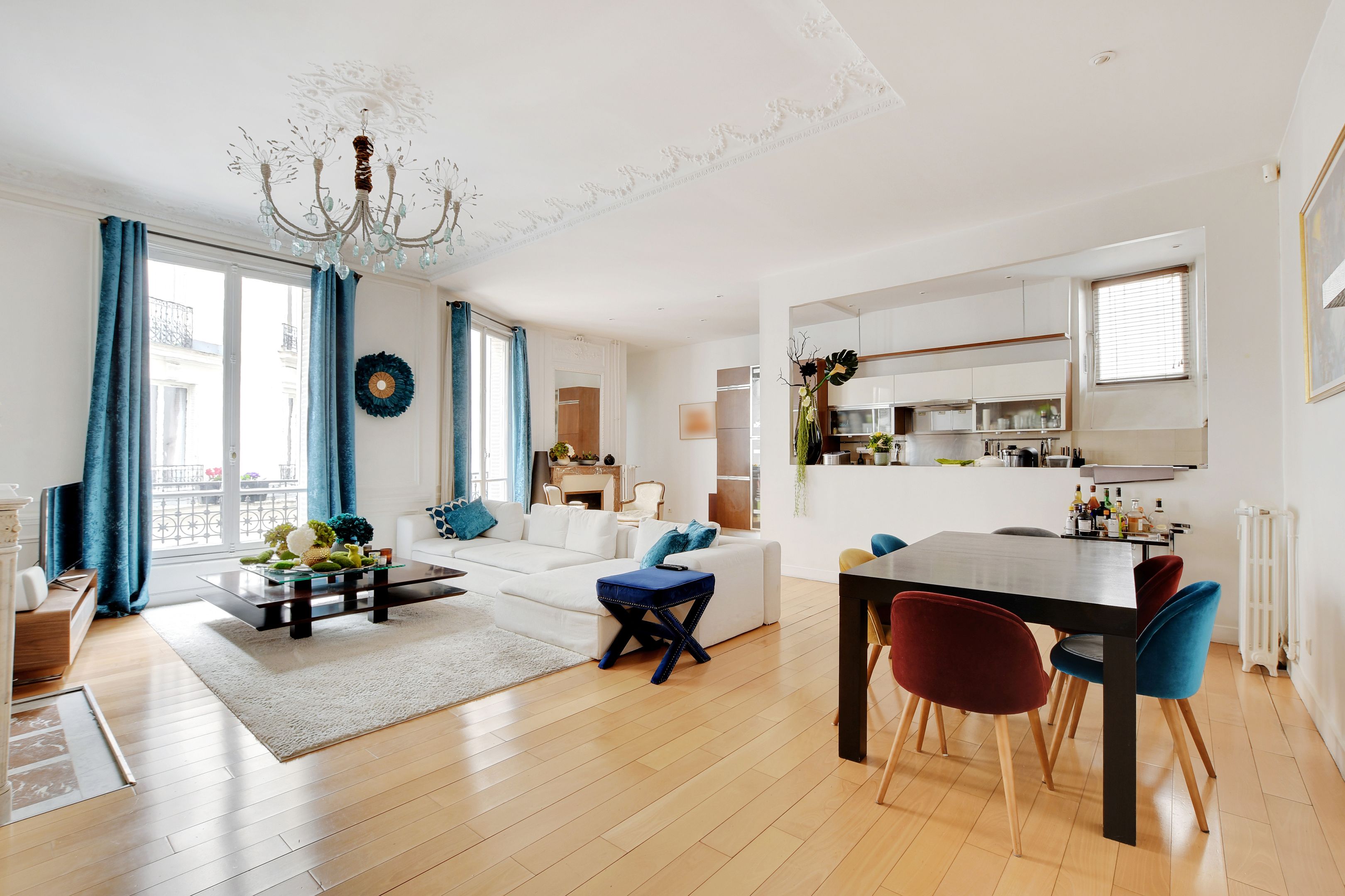 Immeuble haussmannien de très grand standing avec gardien à demeure, aux parties communes soigneusement entretenues et idéalement situé avenue Niel à proximité des commerces et des transports, appartement sur cour en bon état, au 3eme étage, seul sur le palier, desservi par ascenseur, bénéficiant d’agréables volumes et d’un plan cohérent. Galerie d'entrée, grand salon et salle à manger de type « parquet, moulures et cheminées », cuisine ouverte attenante, 4 chambres de belle taille, salle d'eau, salle de bains et toilettes séparées. Double cave.