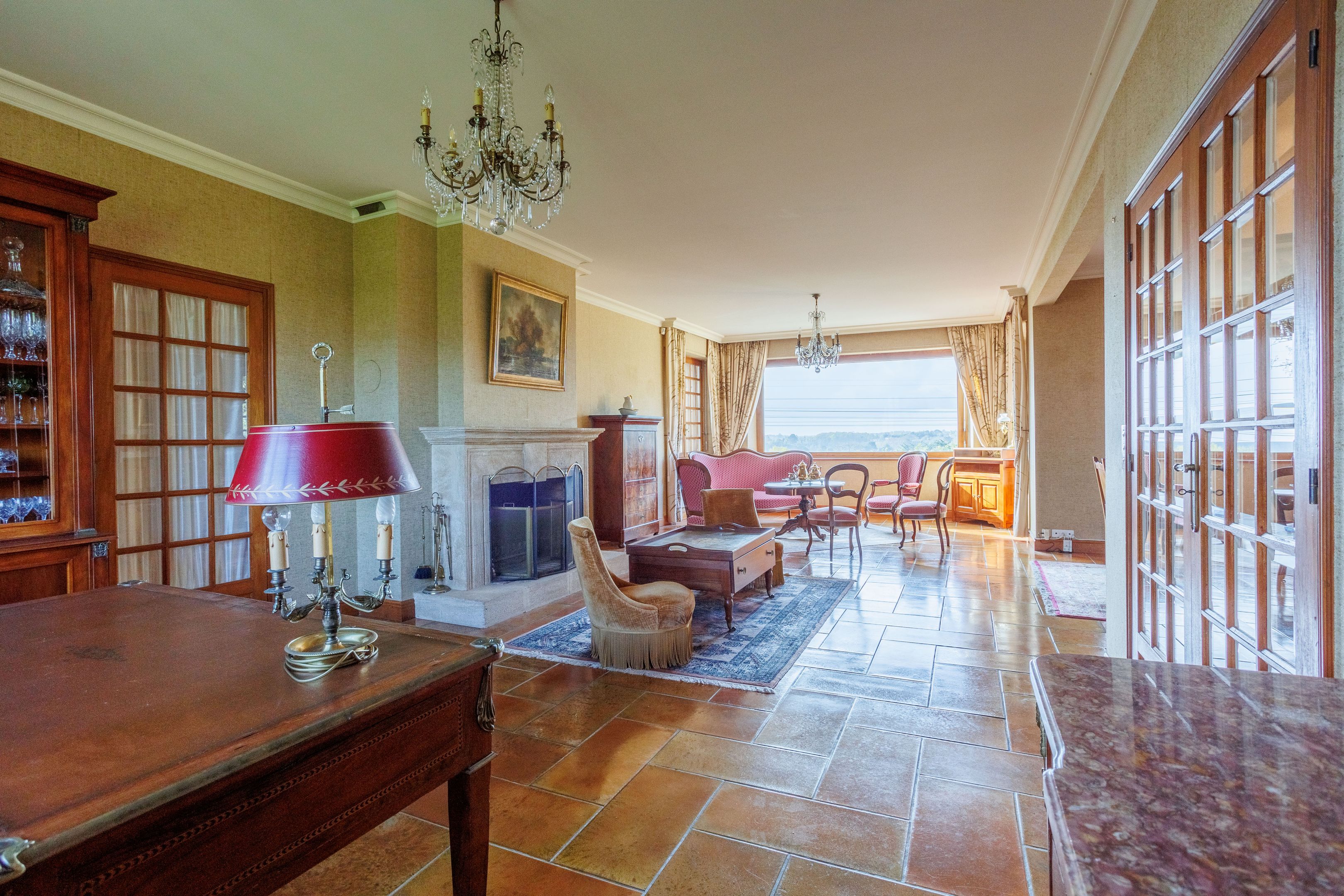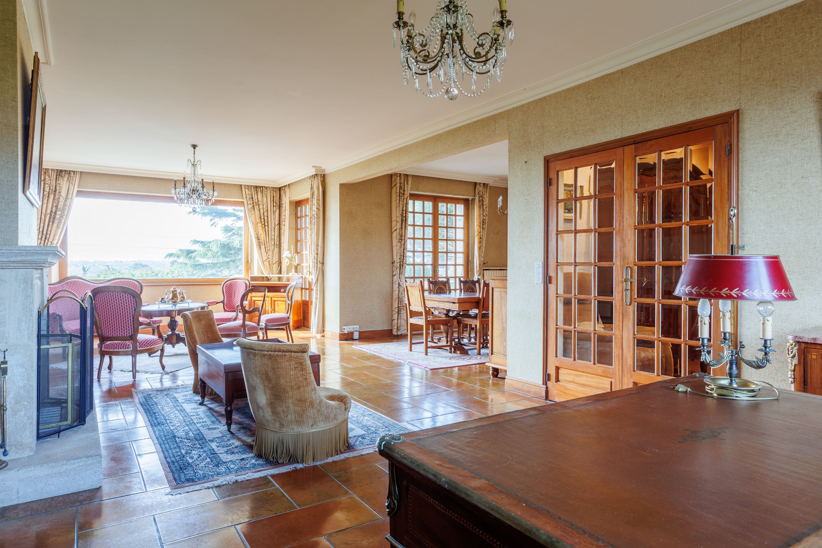 Entrée, vaste pièce de réception avec salon - salle à manger avec cheminée, cuisine séparée et équipée ouvrant sur une terrasse exposée sud, avec vue sur Rance, lingerie, suite parentale avec chambre et salle de bains attenante.