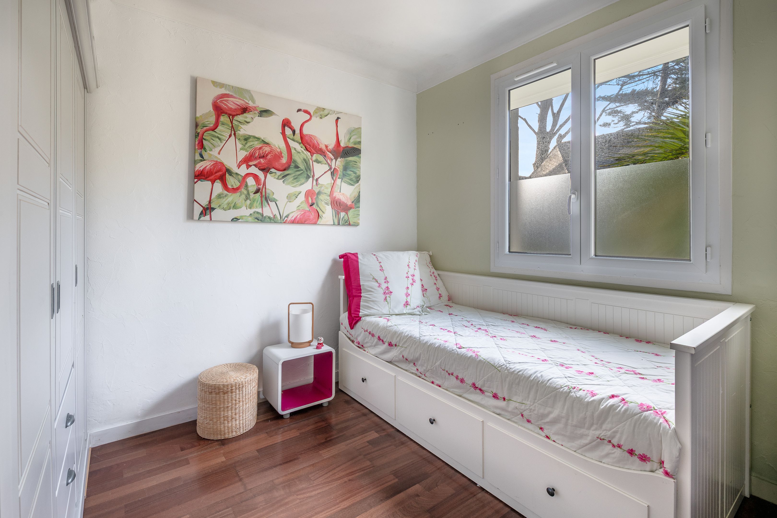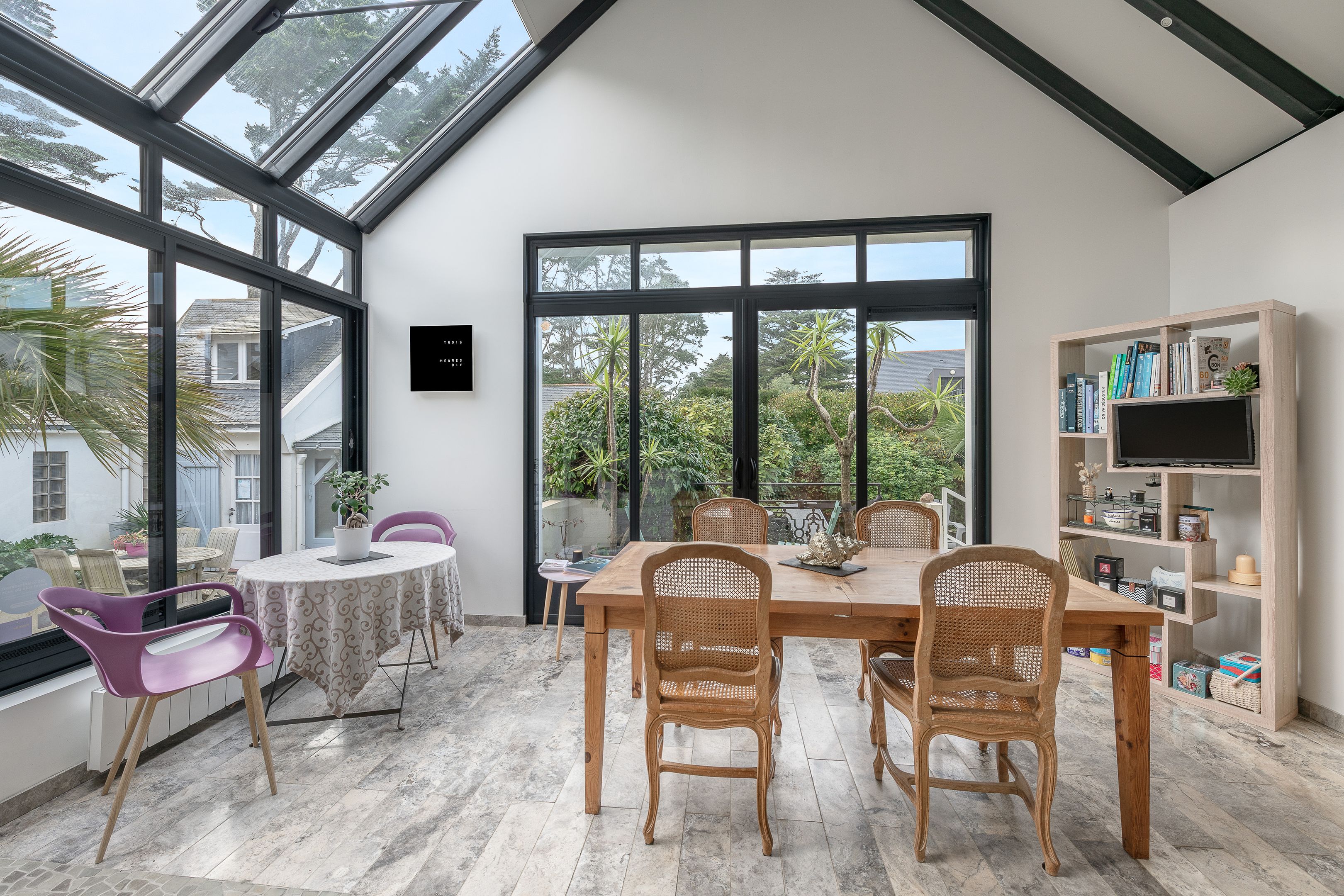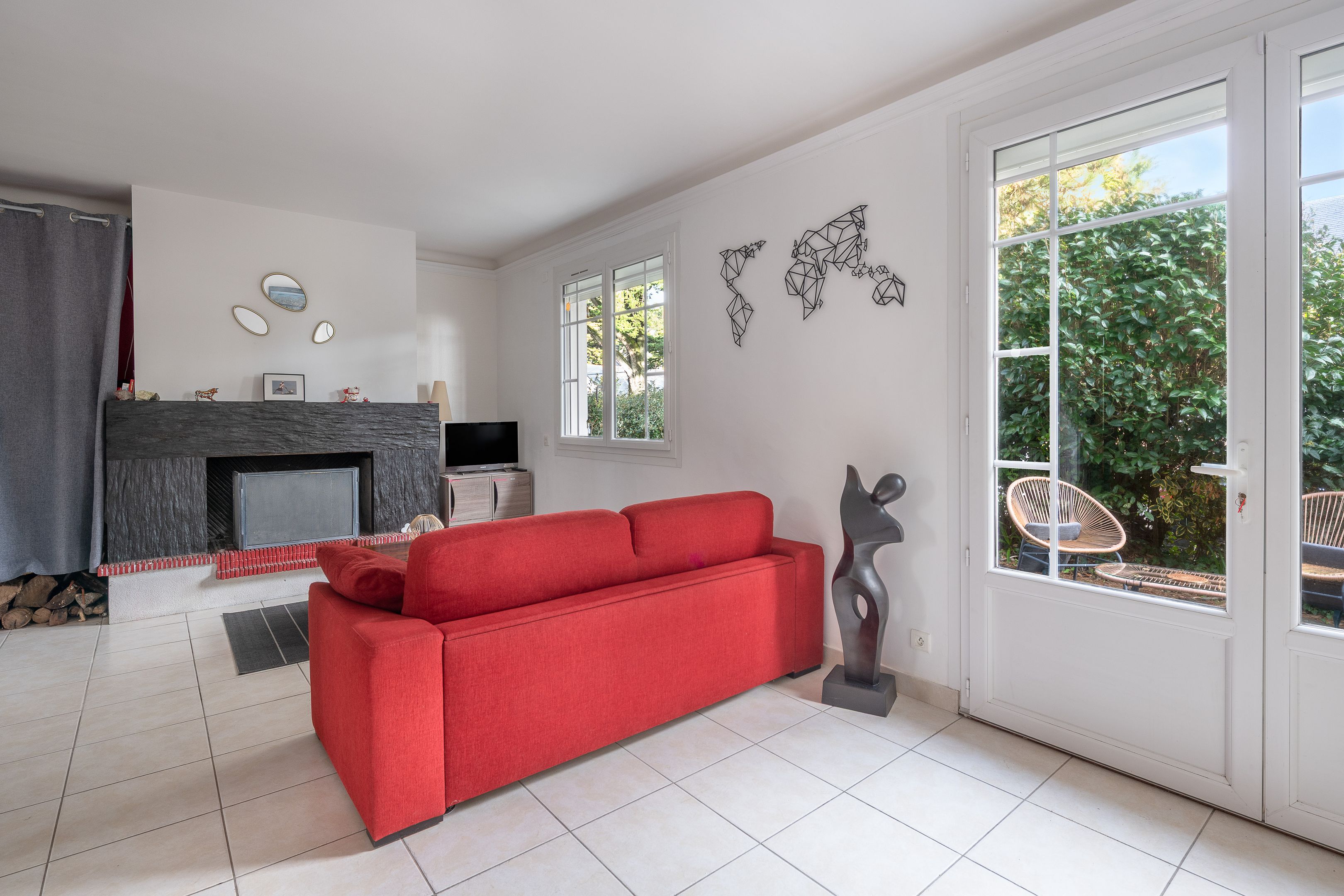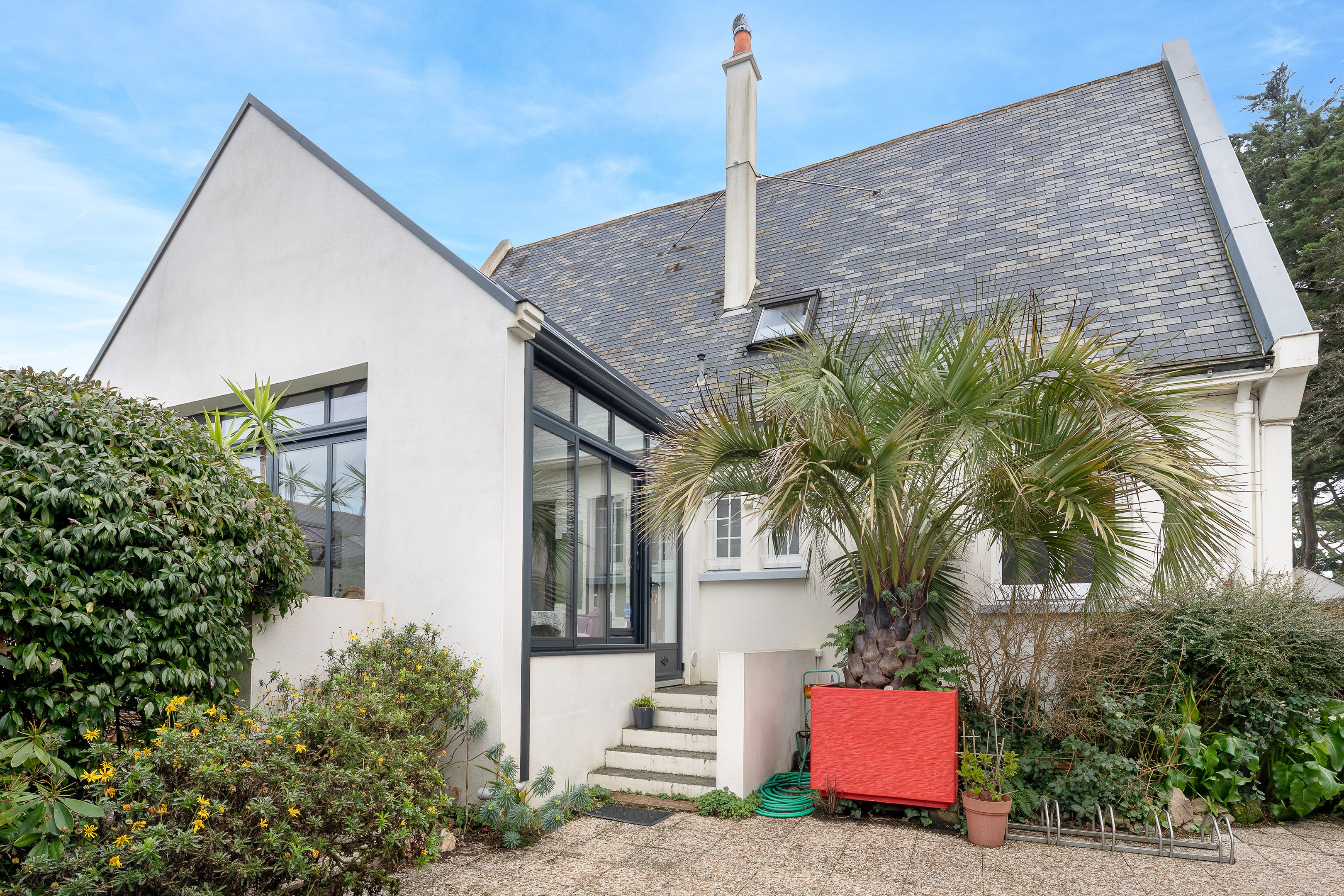 Un garage complète cette maison à quelques pas de l’océan, dans un environnement calme.