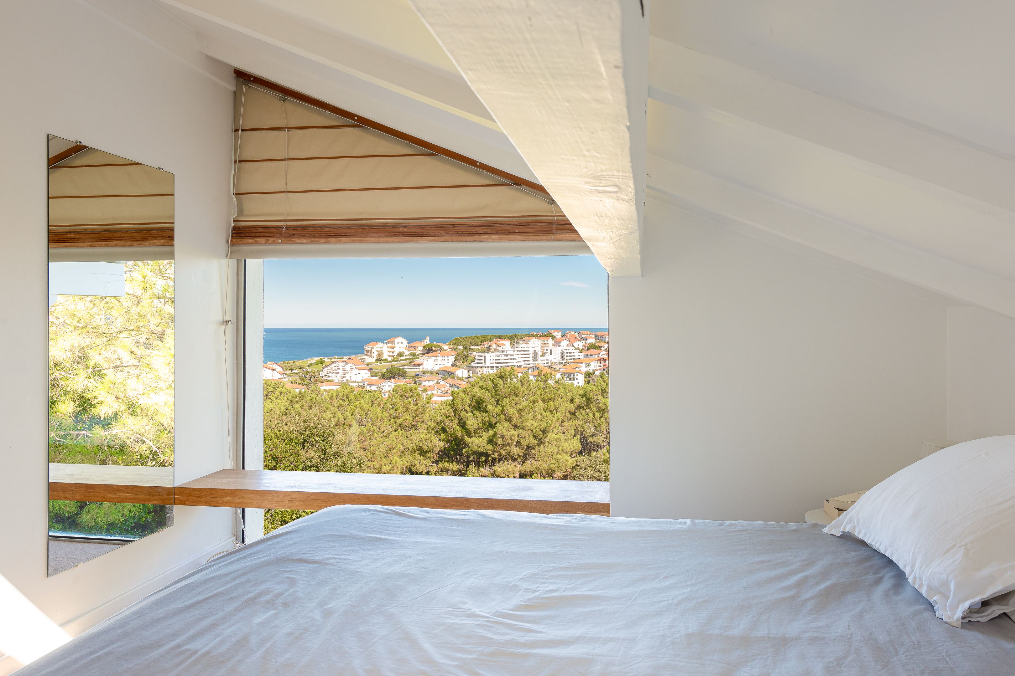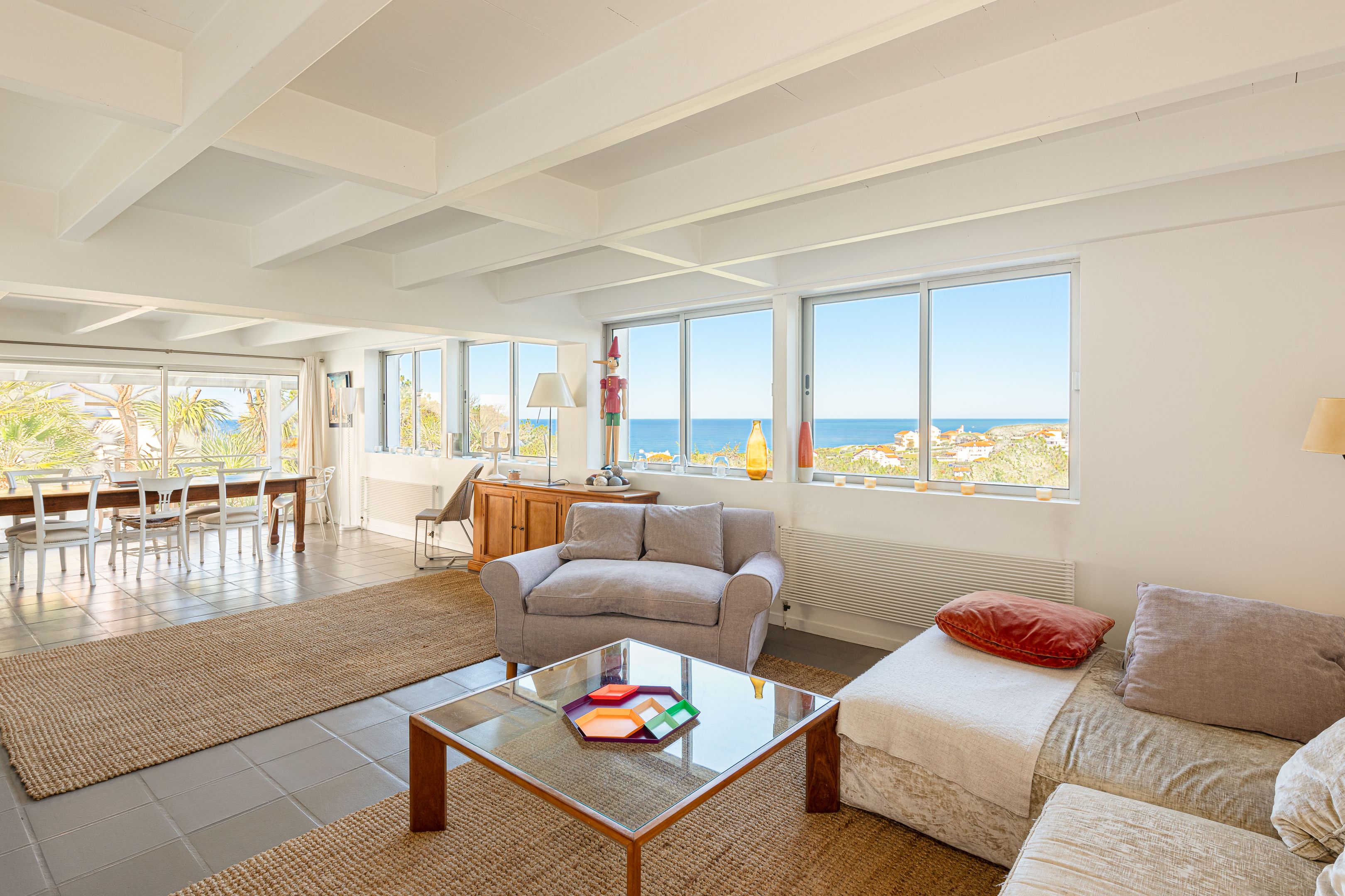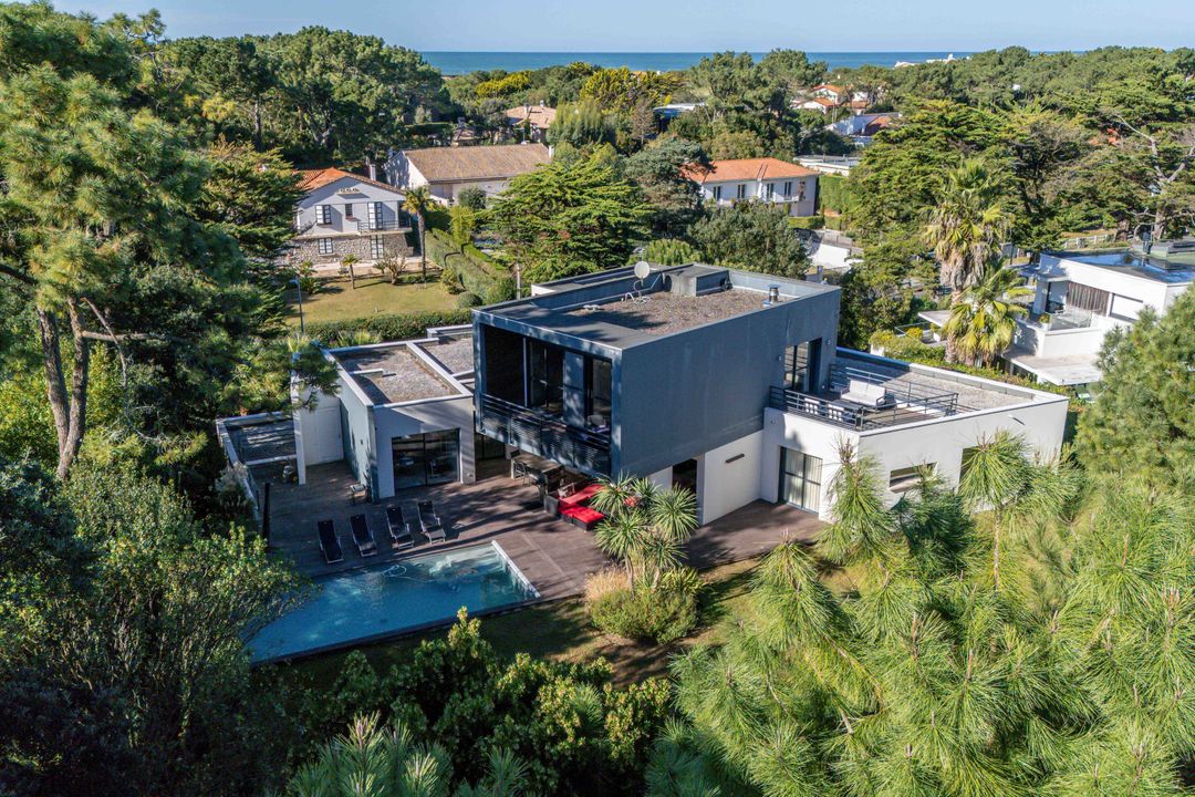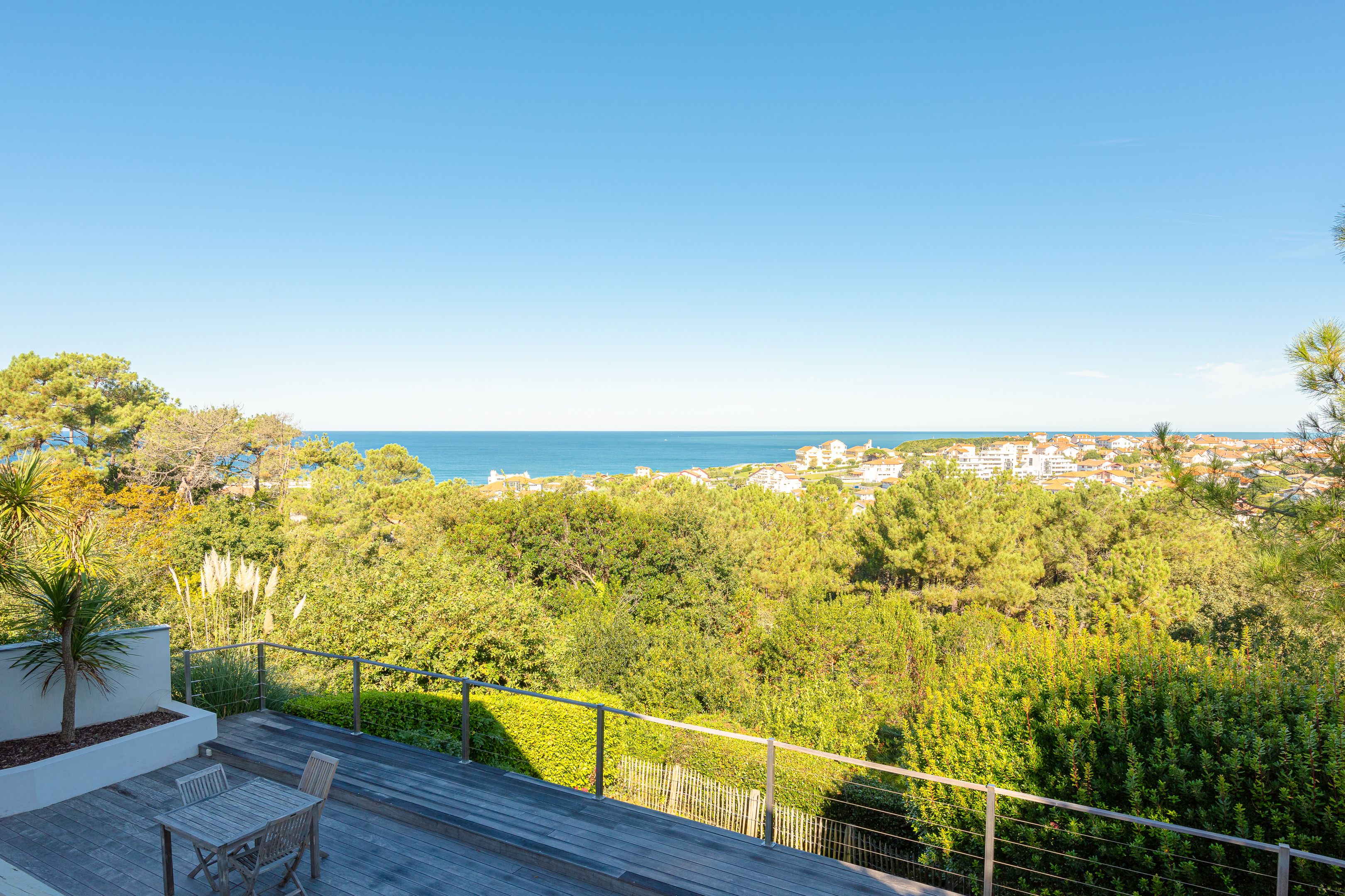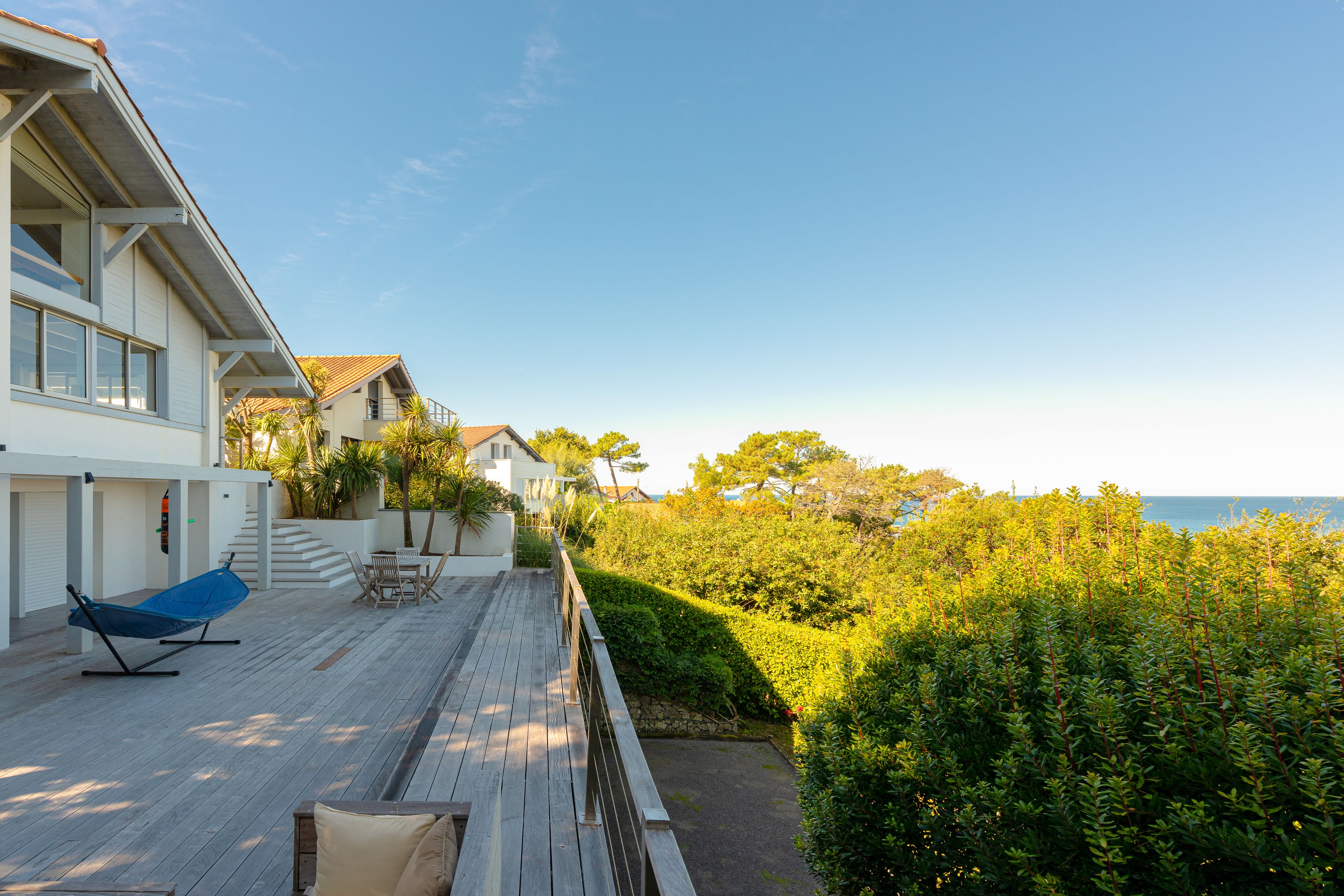 À quelques minutes à pied de la plage de la Milady et du golf d'Ilbaritz, magnifique villa californienne de 200 m² en position dominante offrant une vue mer exceptionnelle depuis chaque pièce. Édifiée sur trois niveaux, le rez-de-chaussée dispose d'un salon/séjour avec une grande cheminée, d'une cuisine aménagée, équipée et semi-ouverte, et d'une chambre avec salle d'eau. À l'étage, une suite parentale très lumineuse avec vue sur l'océan. Le niveau inférieur propose deux chambres avec accès à la terrasse et entrée indépendante, une salle d'eau et un bureau. En extérieur, une piscine chauffée avec nage à contre-courant, une terrasse de 100 m², un double garage, un jardin arboré et un boulodrome. Parking extérieur pour 4 véhicules.
