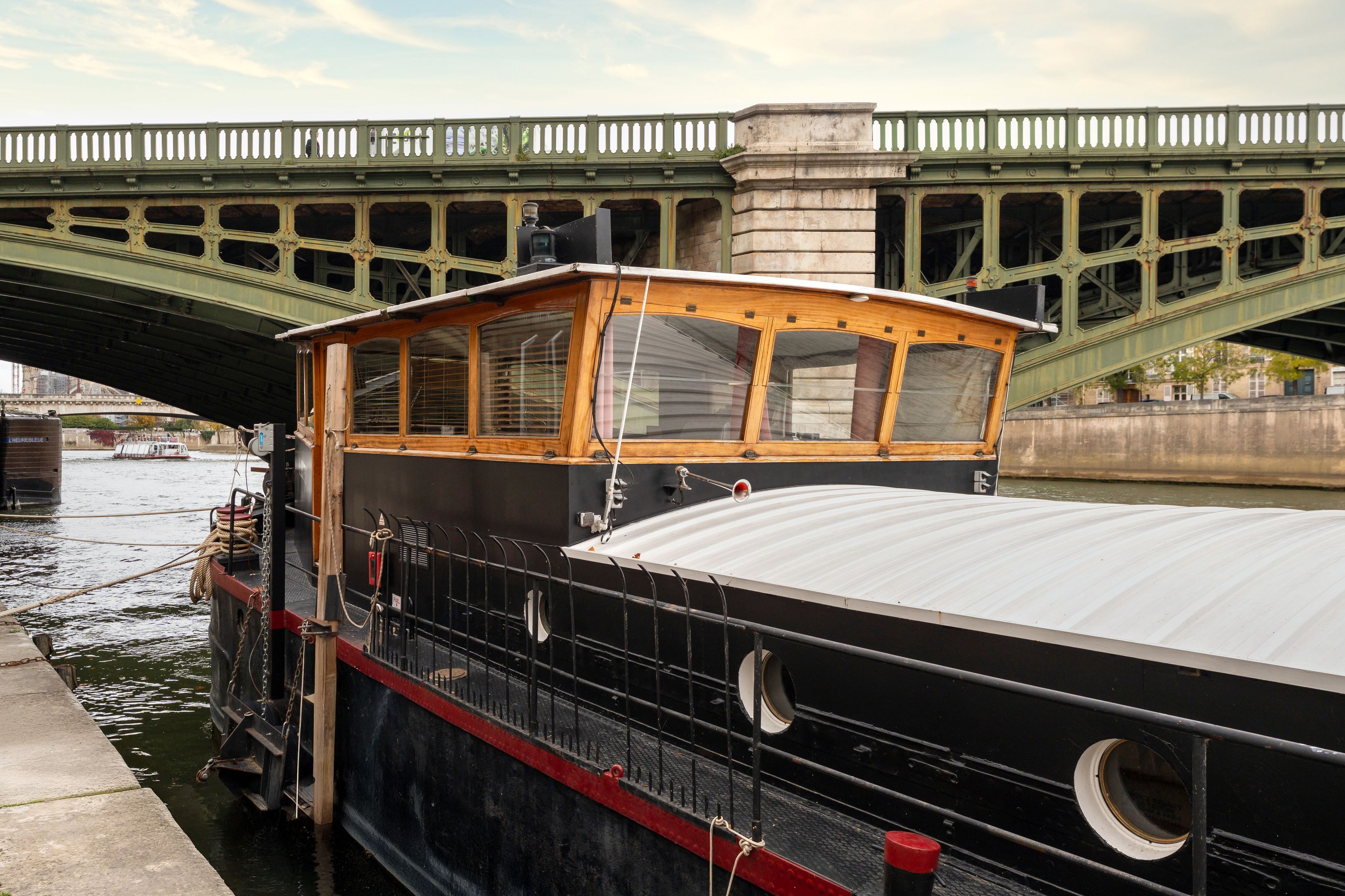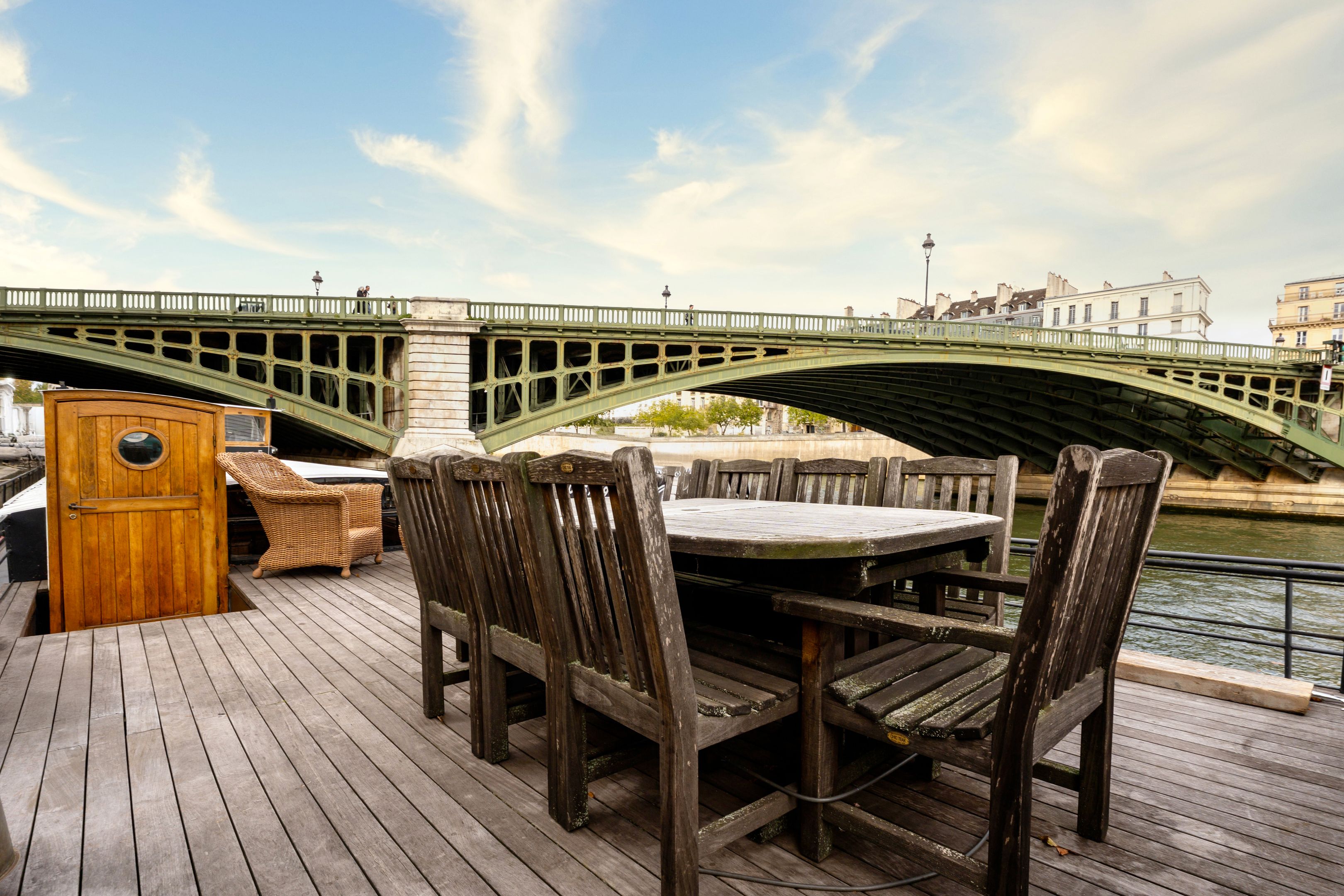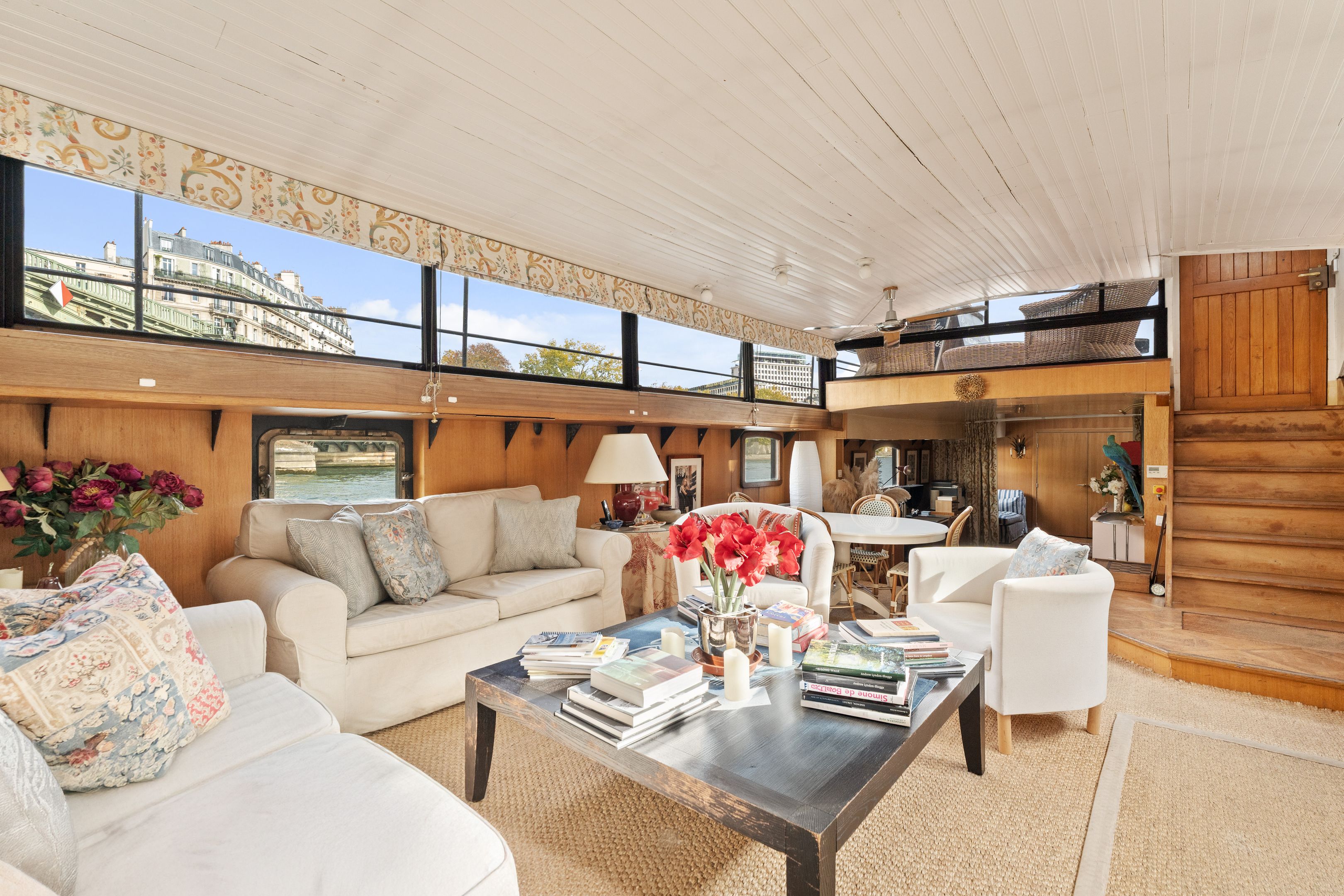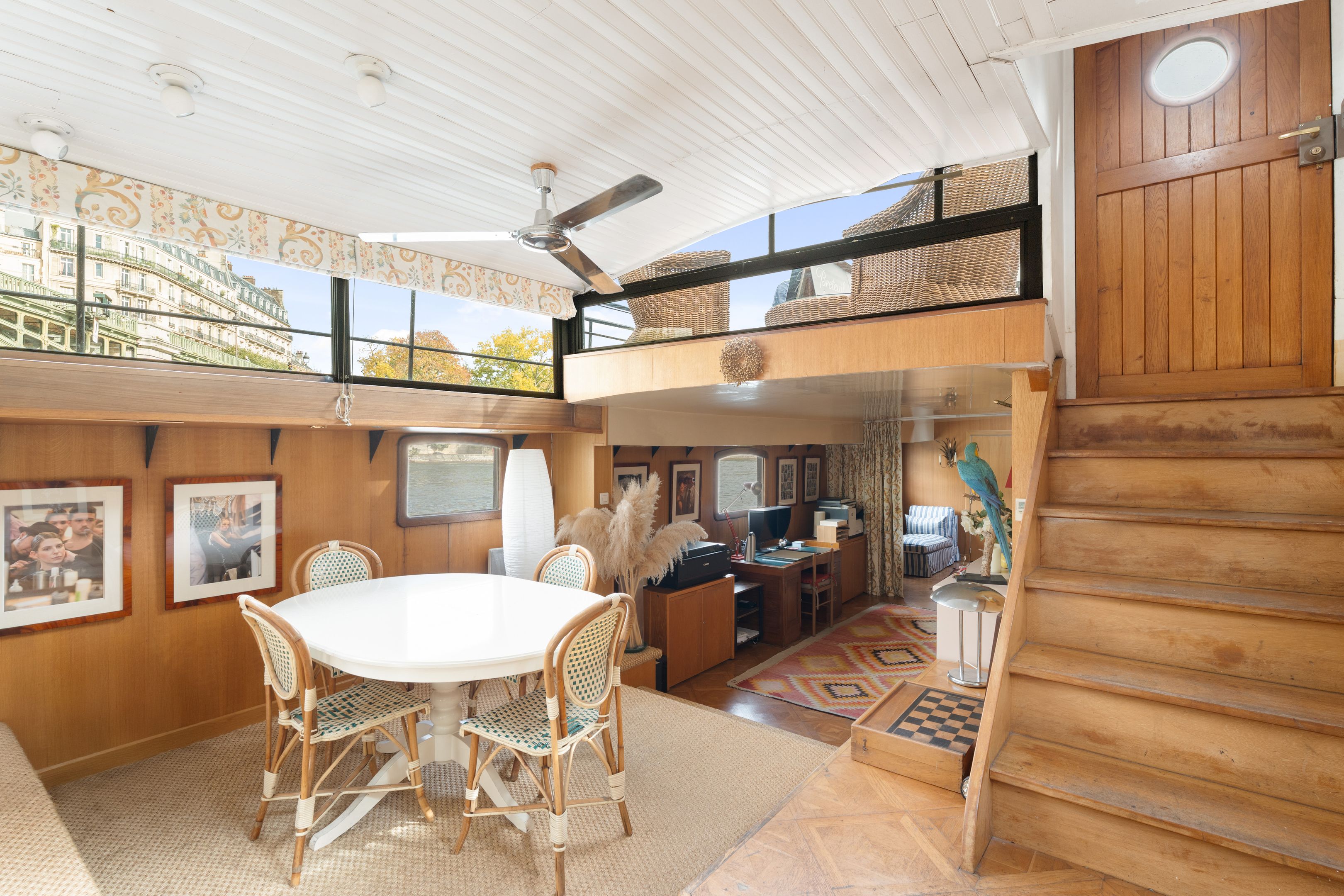 Magnifique péniche (Freycinet) d'une surface de 210m2, une terrasse de 40m2, ouverte sur la seine avec des vues sur l'île de la Cité et l'île Saint Louis : grande pièce de vie spacieuse, traversante, avec un coin salon, salle à manger, espace bureau, cuisine toute aménagée, suite parentale avec salle de bains et dressing, 2 chambres avec chacune sa salle de bains et toilettes, sauna, une 4ème chambre, cabine de pilotage pouvant être aménagé en studio totalement indépendant (sur 2 niveaux).