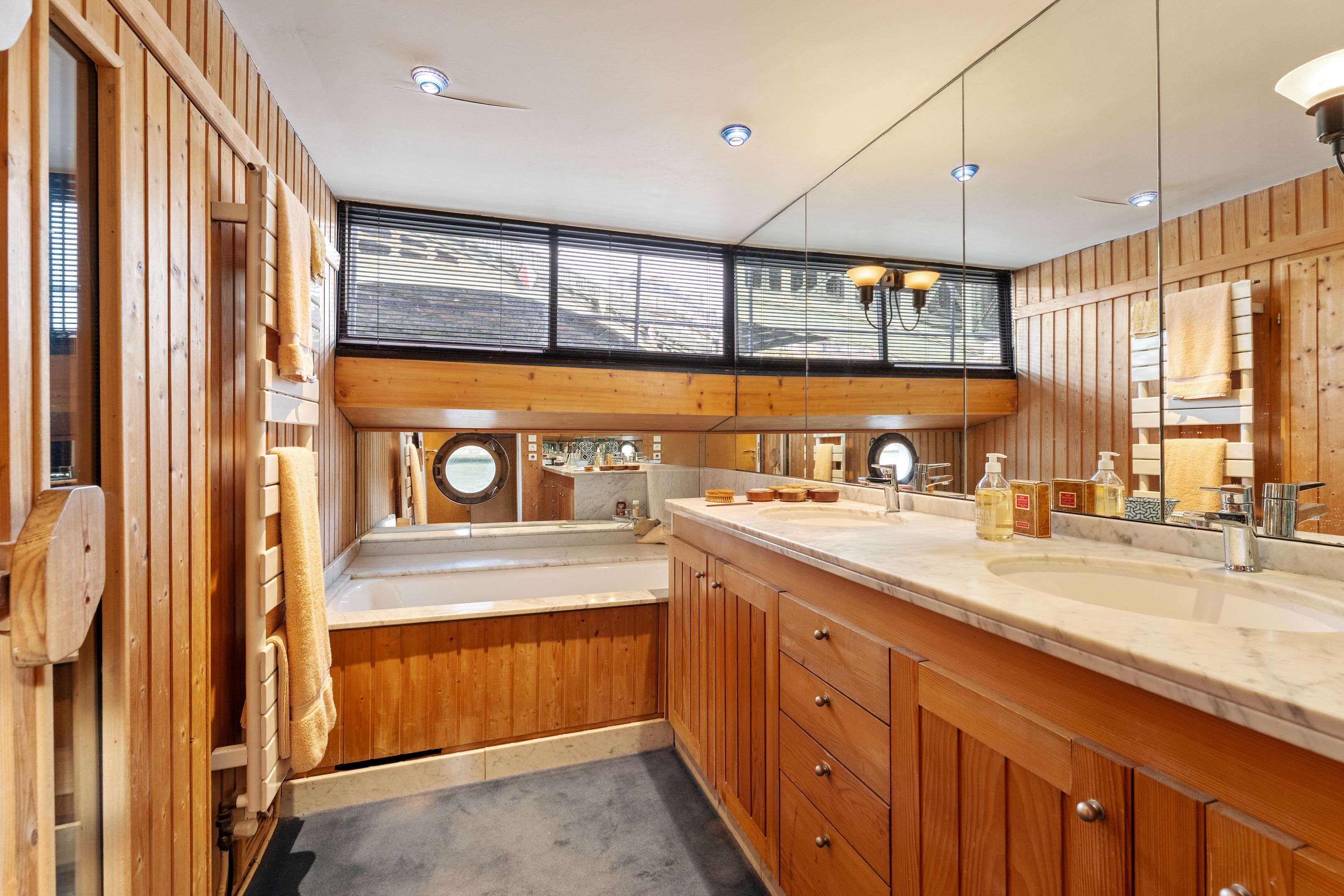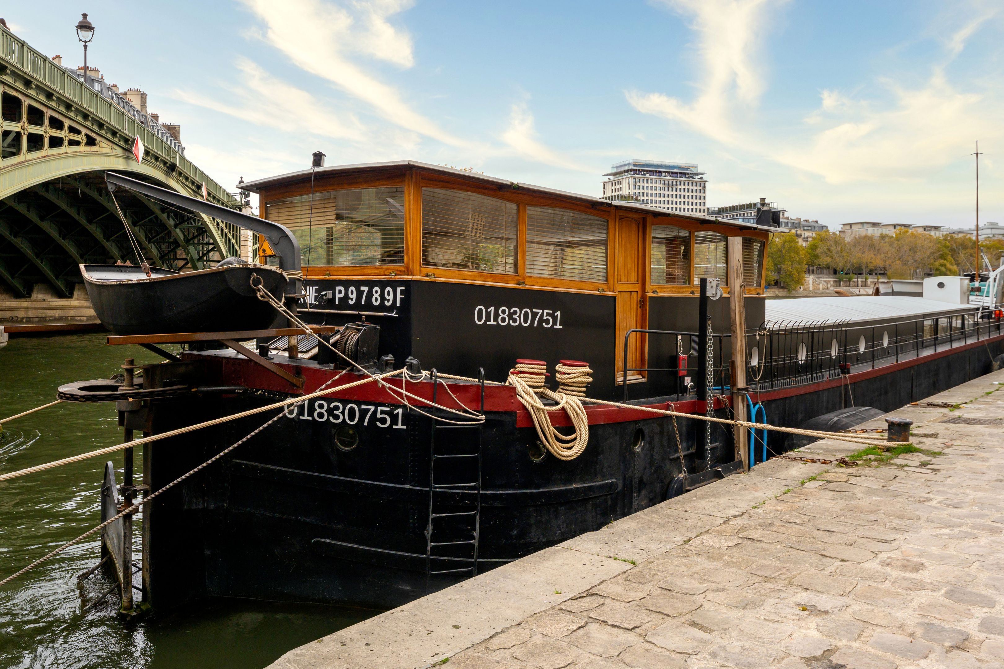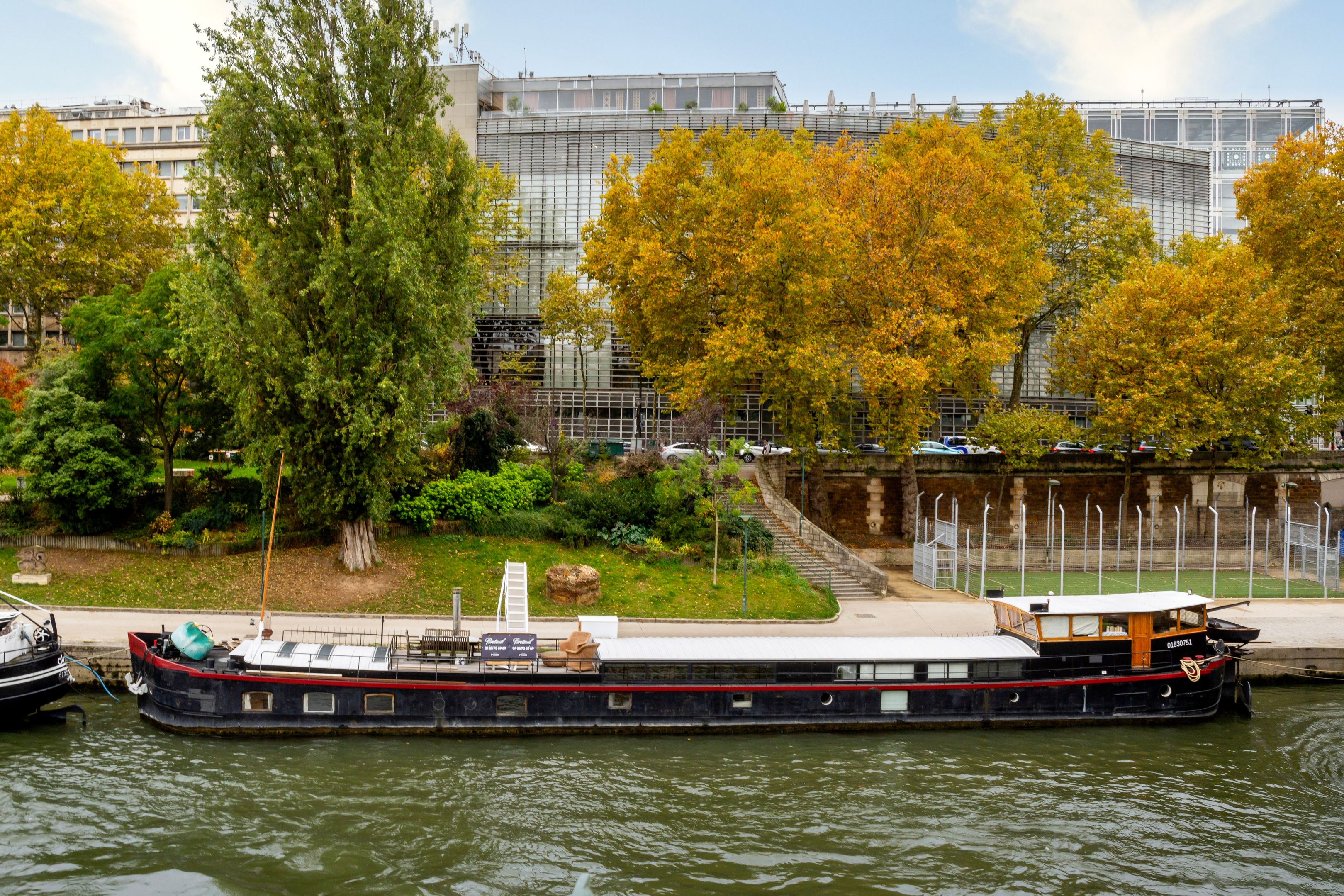 Magnifique péniche (Freycinet) d'une surface de 210m2, une terrasse de 40m2, ouverte sur la seine avec des vues sur l'île de la Cité et l'île Saint Louis : grande pièce de vie spacieuse, traversante, avec un coin salon, salle à manger, espace bureau, cuisine toute aménagée, suite parentale avec salle de bains et dressing, 2 chambres avec chacune sa salle de bains et toilettes, sauna, une 4ème chambre, cabine de pilotage pouvant être aménagé en studio totalement indépendant (sur 2 niveaux).