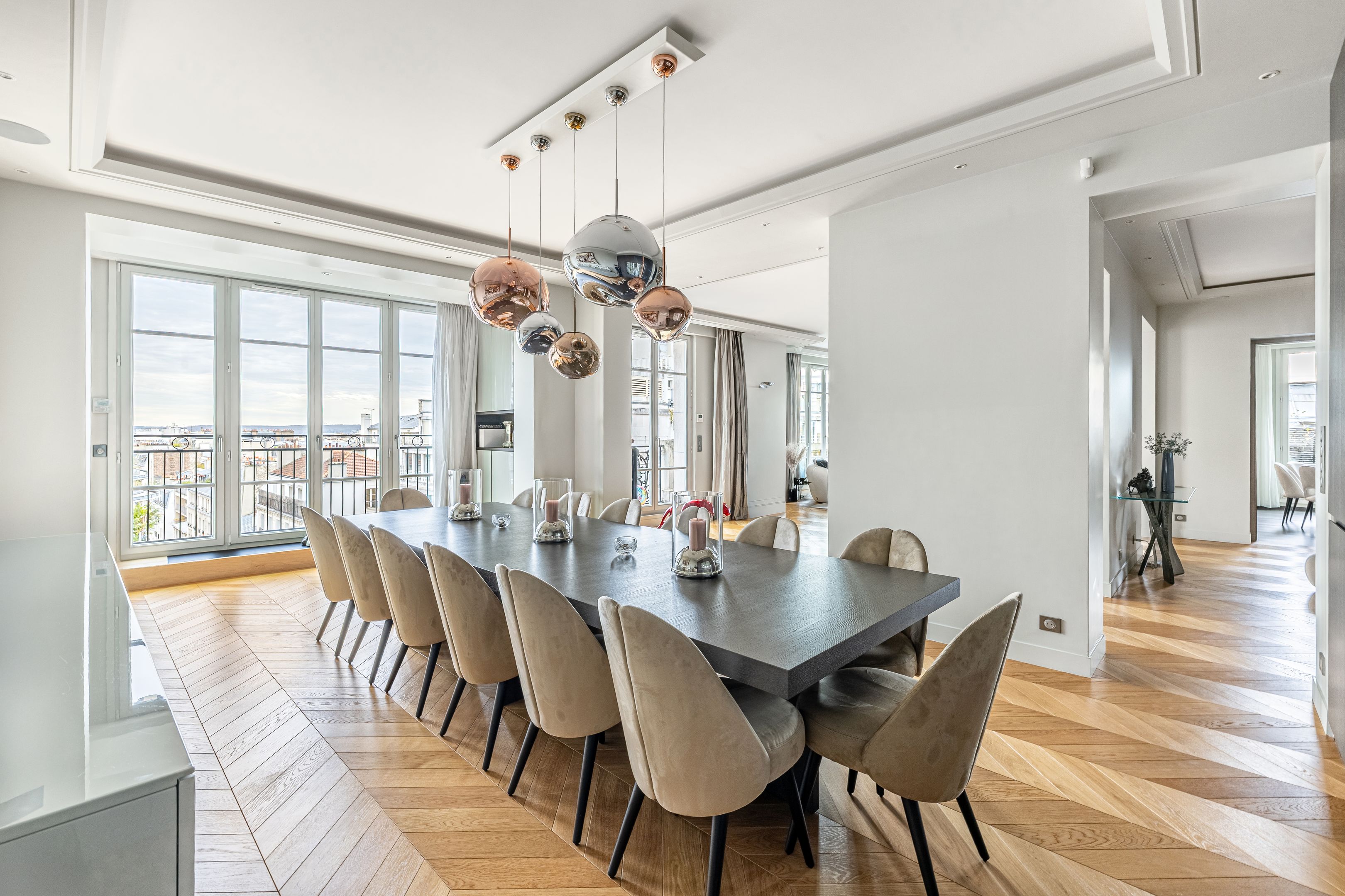À proximité immédiate de l'avenue Georges Mandel, des commerces de la rue de la Pompe et des écoles de renom, immeuble haussmannien de grand standing, superbe appartement familial et de réception en duplex de 332 m², au 6ème et dernier étage, doté de très beaux volumes, d'une vue exceptionnelle et d'un bel ensoleillement grâce à son orientation sud-ouest. Élégante galerie d'entrée desservant une triple réception, vaste cuisine ouverte, une chambre avec sa salle de douches et ses toilettes, une lingerie, un dressing et des toilettes invités. À l'étage, une suite parentale avec dressing, salle de bains, toilettes, 2 chambres, bureau bénéficiant d'une terrasse ou 5ème chambre, salle de bains avec toilettes, salle de douches avec toilettes, espace bien-être avec sauna. Cave.