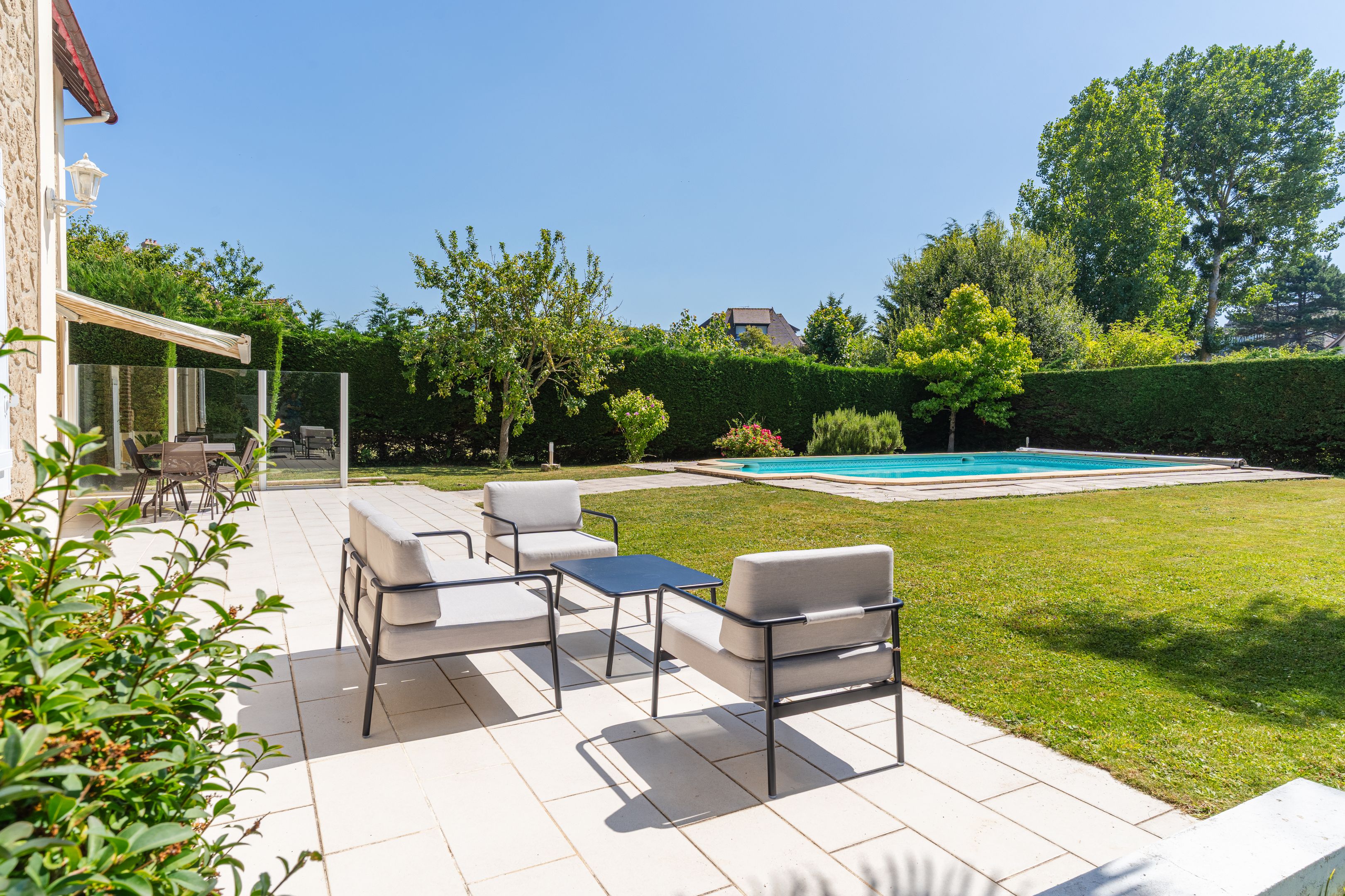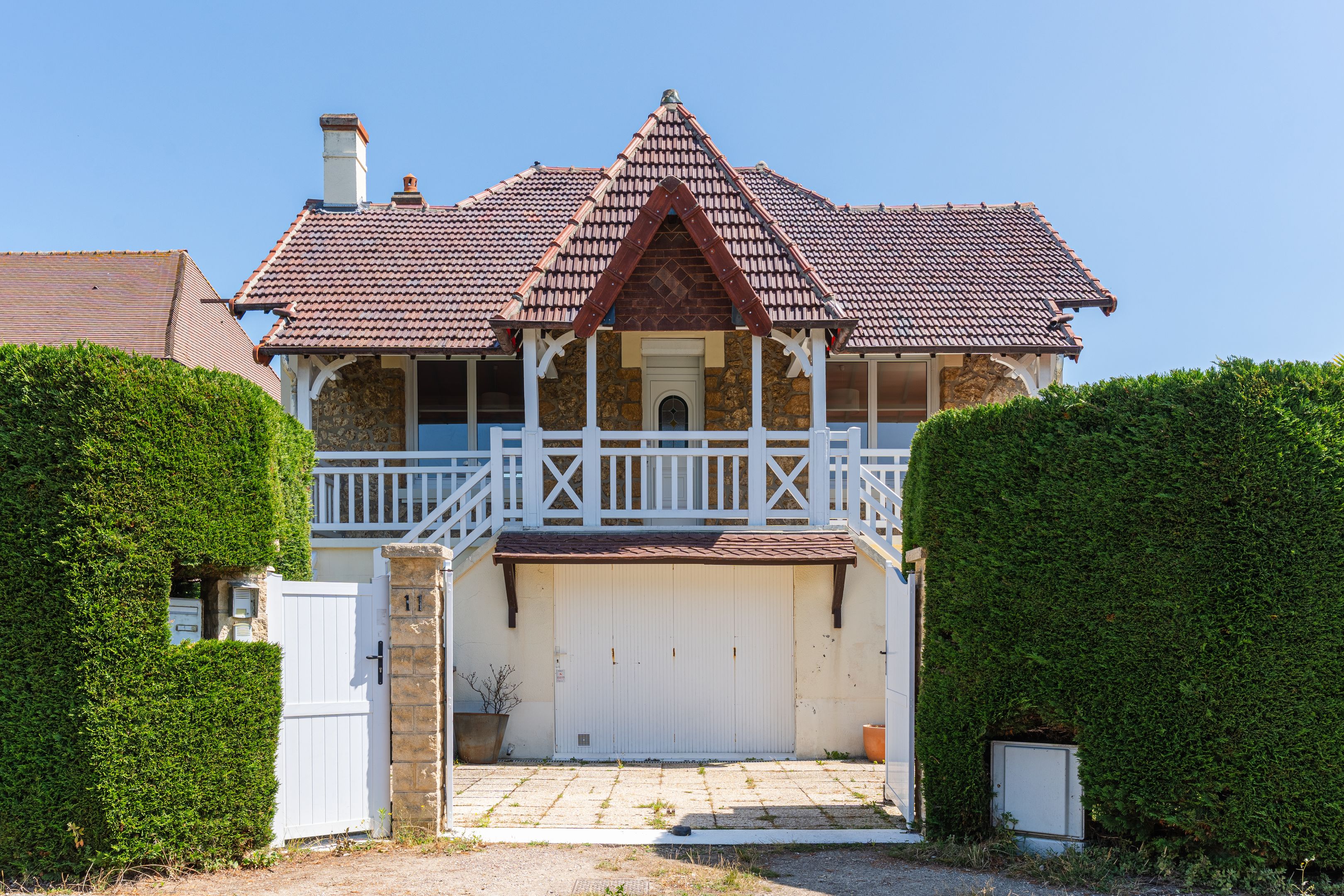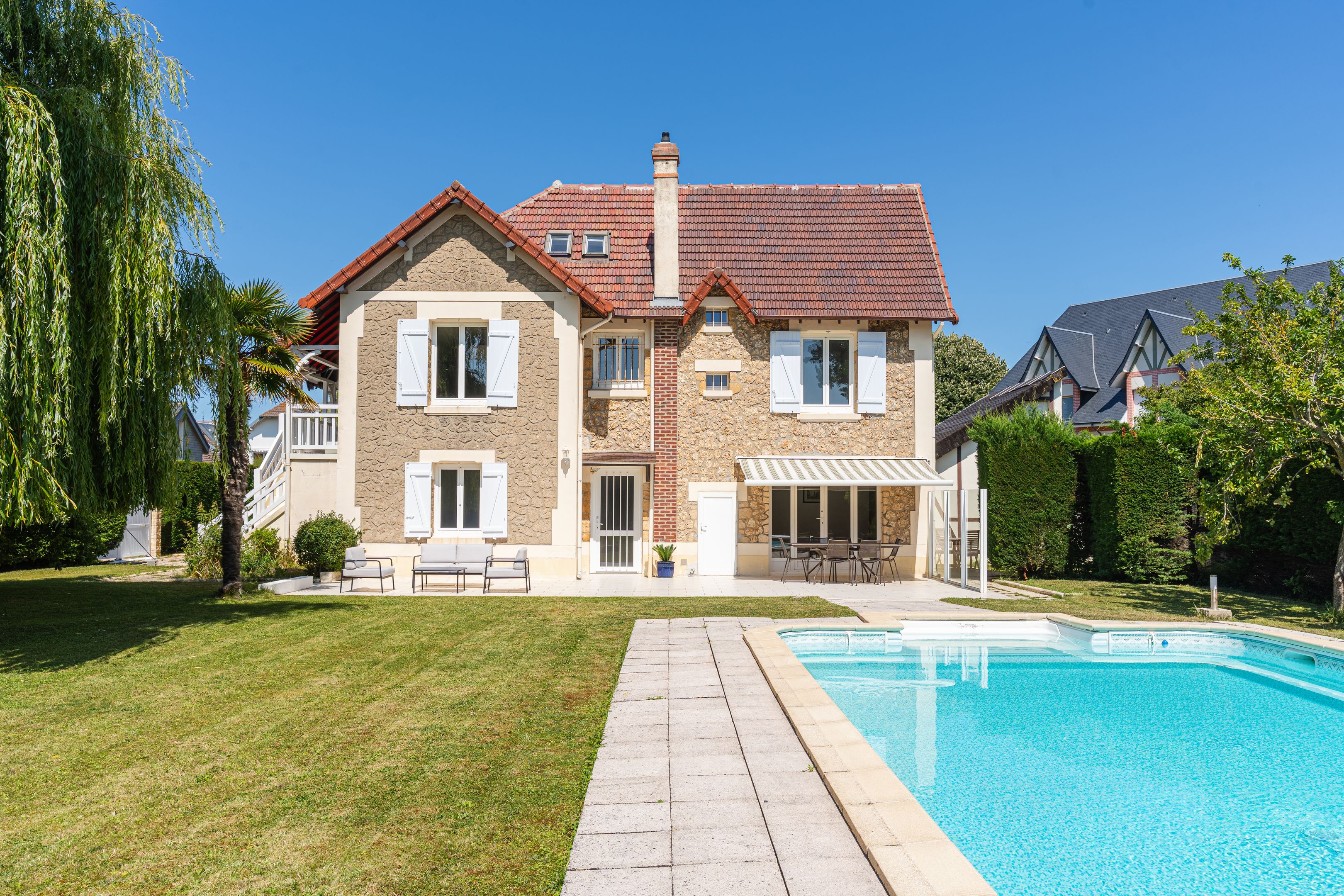 À 100m de la plage, au calme dans une impasse privée, charmante maison en meulière de 162m2 édifiée sur un terrain clos et plat de 1116m2. Au rez-de-chaussée donnant sur la terrasse : entrée, garage, cuisine équipée, salle-à-manger, buanderie, salle d'eau, deux chambres, toilettes indépendants. En demi-étage : toilettes invités. Au 1er étage, accessible par escalier intérieur et extérieur : spacieuse pièce à vivre avec cheminée bénéficiant de belles ouvertures offrant une triple exposition et accès terrasse, chambre avec placards, salle de bains. Au 2ème étage : deux chambres avec placards dont une avec salle de bains, toilettes indépendants. En dépendance, petite maisonnette aménagée type T2 d'environ 30m2 : pièce à vivre, cuisine indépendante, espace nuit. 2 abris de jardin, piscine enterrée de 10x5m.