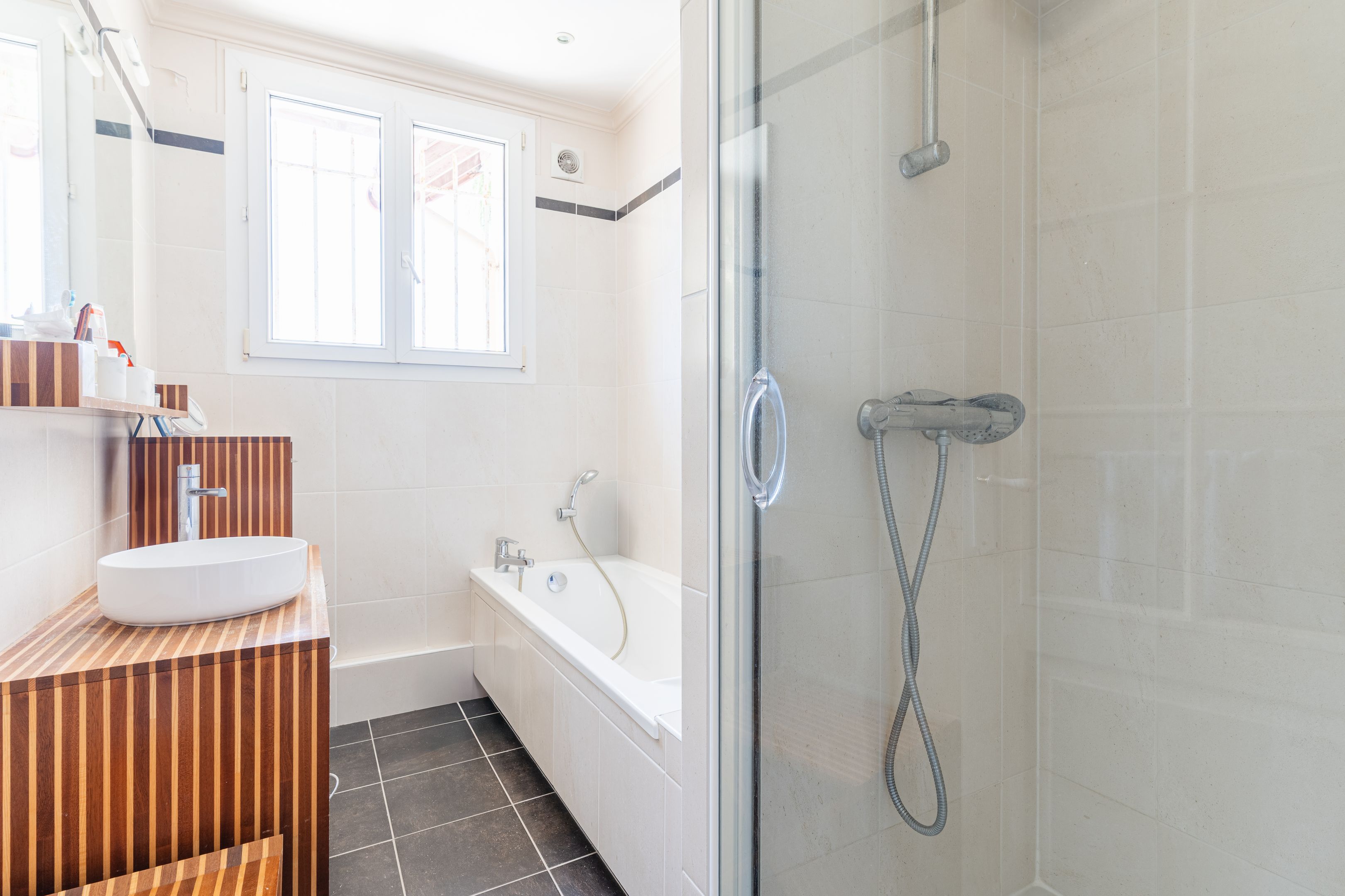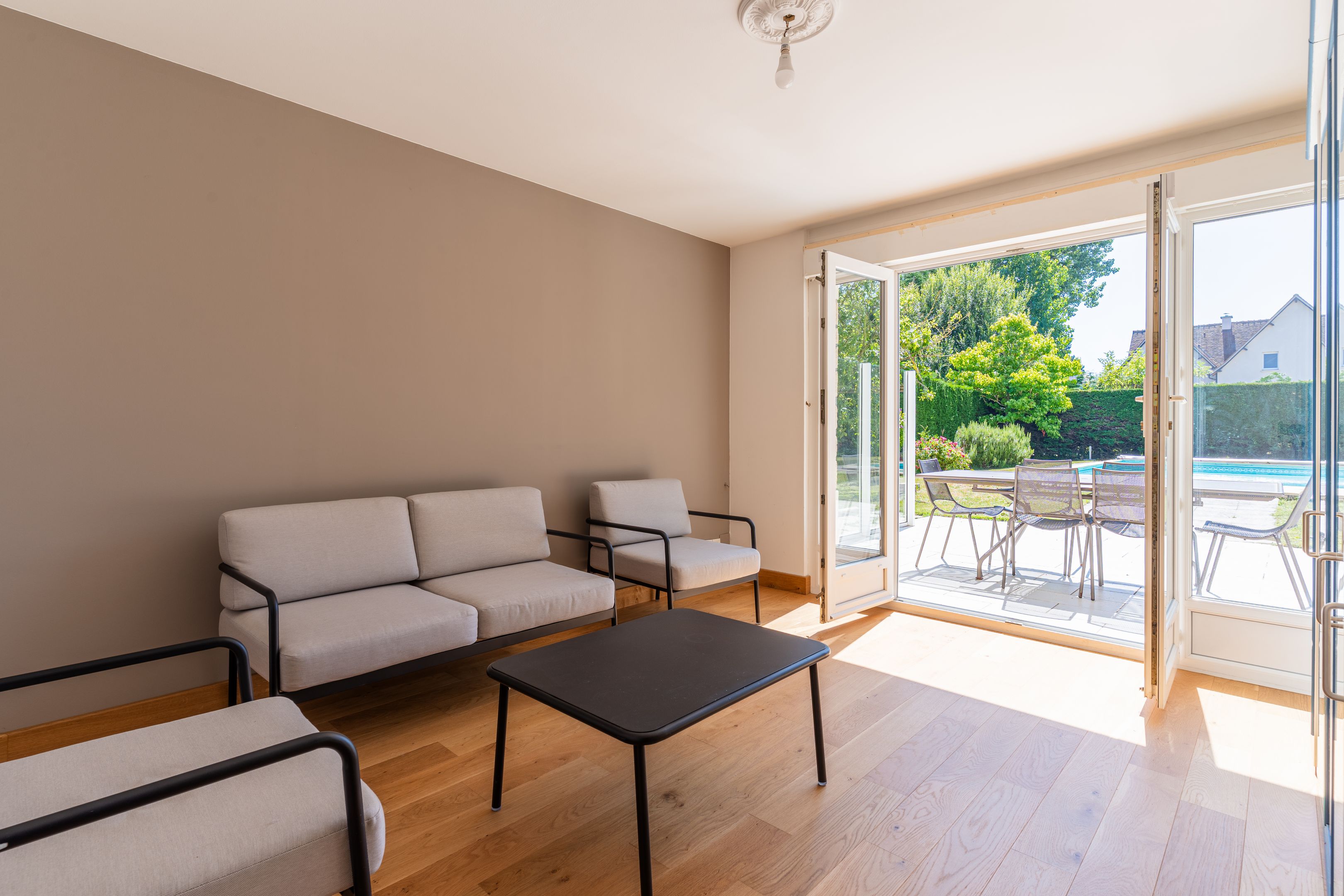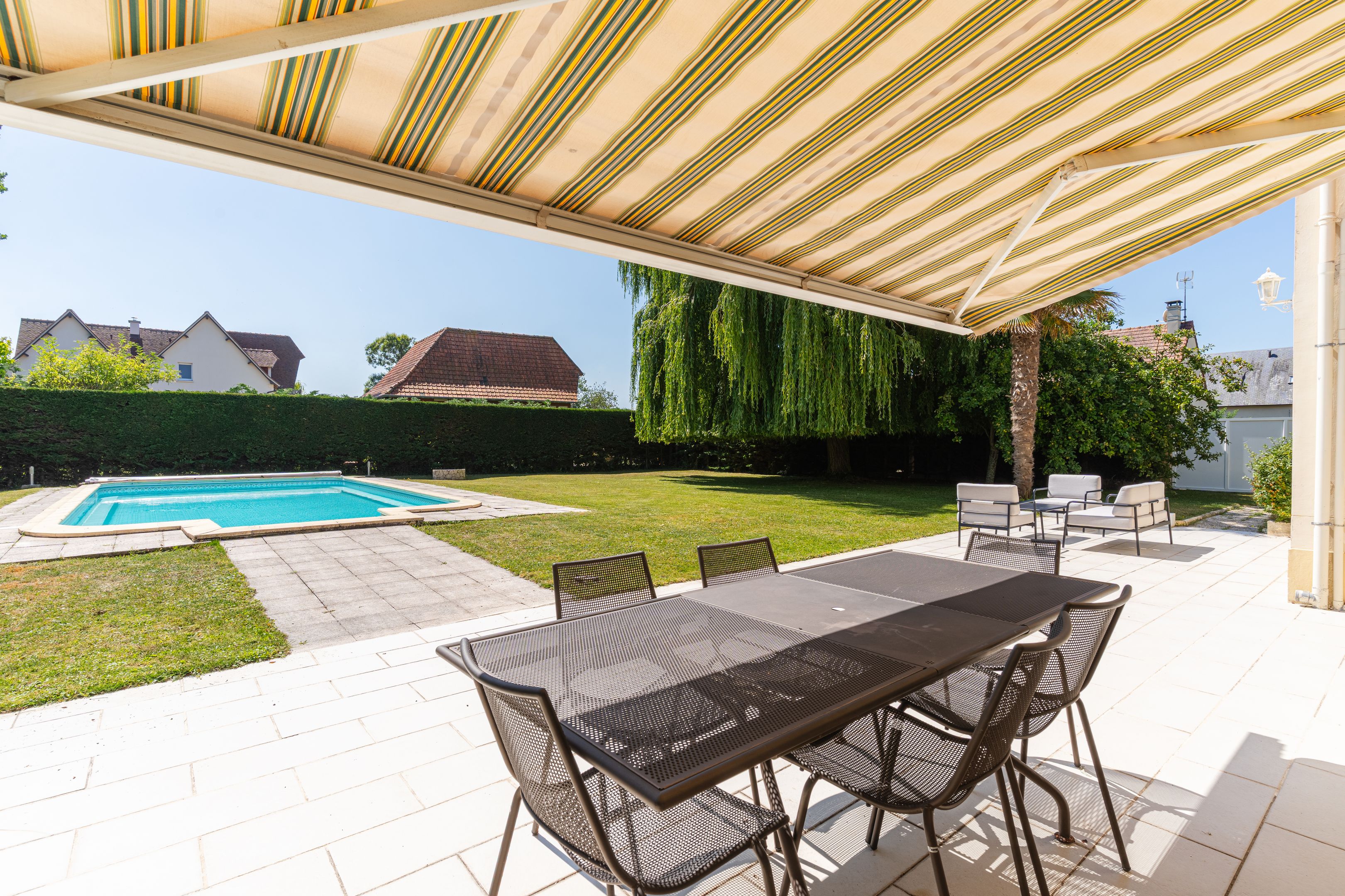 À 100m de la plage, au calme dans une impasse privée, charmante maison en meulière de 162m2 édifiée sur un terrain clos et plat de 1116m2. Au rez-de-chaussée donnant sur la terrasse : entrée, garage, cuisine équipée, salle-à-manger, buanderie, salle d'eau, deux chambres, toilettes indépendants. En demi-étage : toilettes invités. Au 1er étage, accessible par escalier intérieur et extérieur : spacieuse pièce à vivre avec cheminée bénéficiant de belles ouvertures offrant une triple exposition et accès terrasse, chambre avec placards, salle de bains. Au 2ème étage : deux chambres avec placards dont une avec salle de bains, toilettes indépendants. En dépendance, petite maisonnette aménagée type T2 d'environ 30m2 : pièce à vivre, cuisine indépendante, espace nuit. 2 abris de jardin, piscine enterrée de 10x5m.