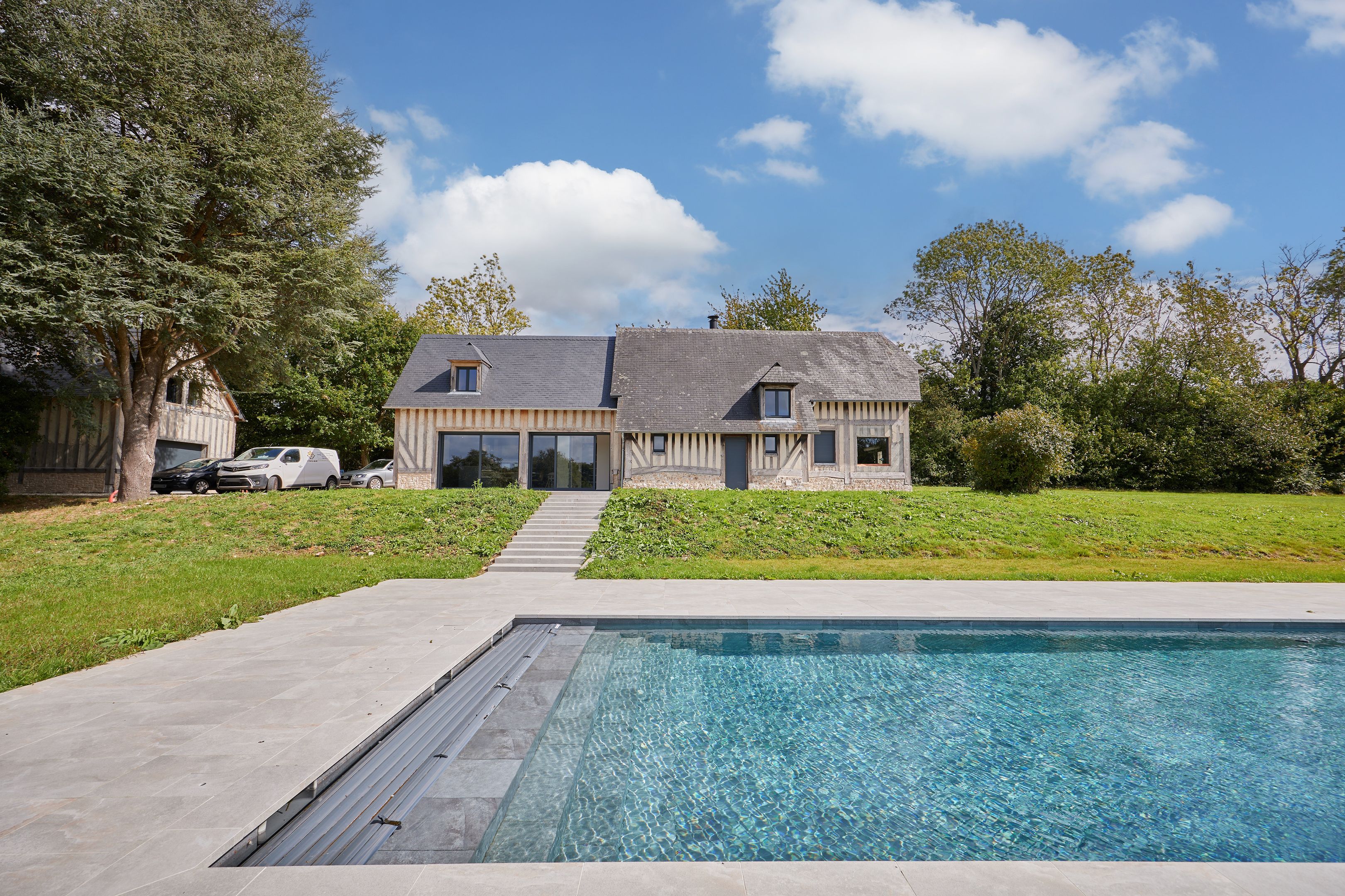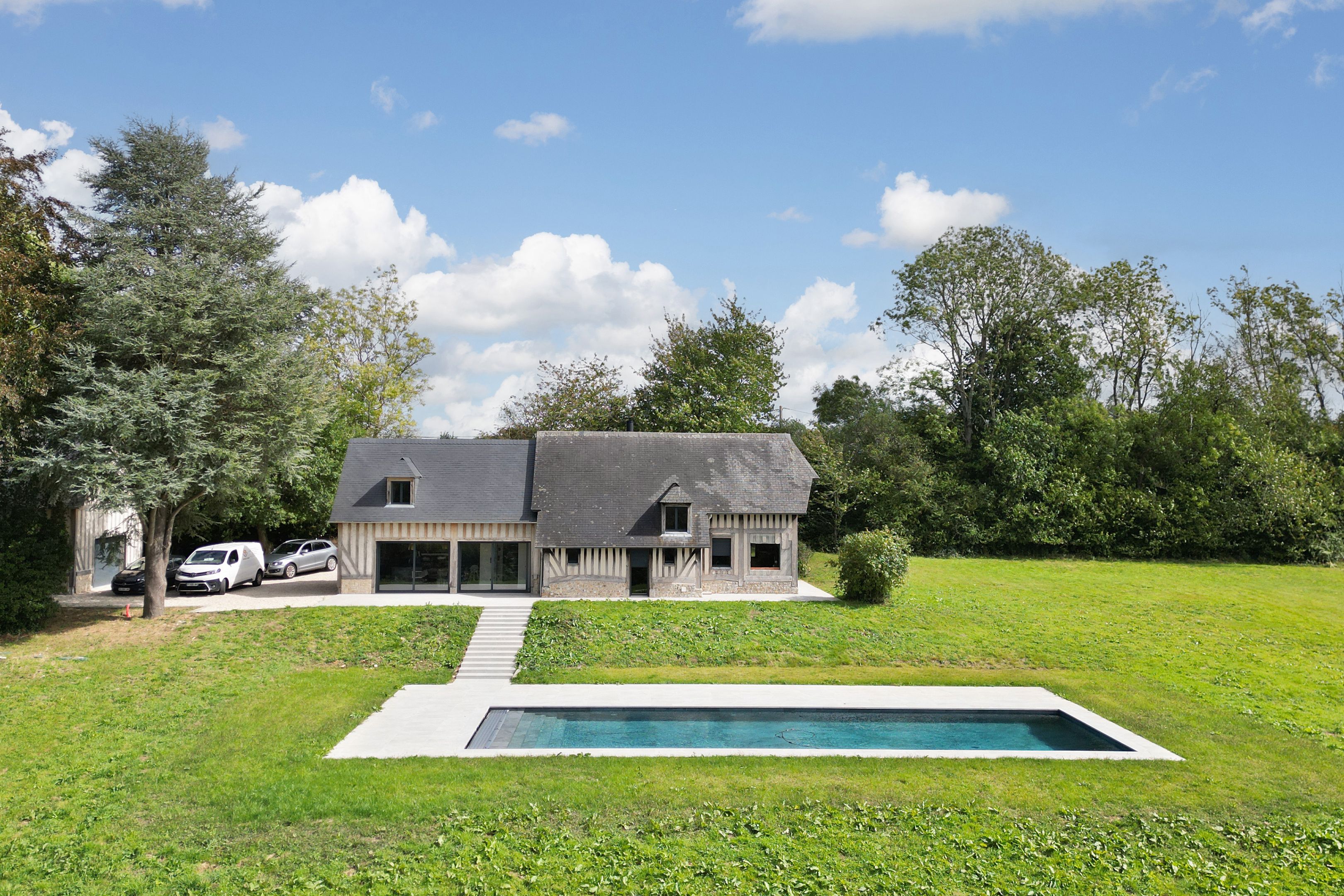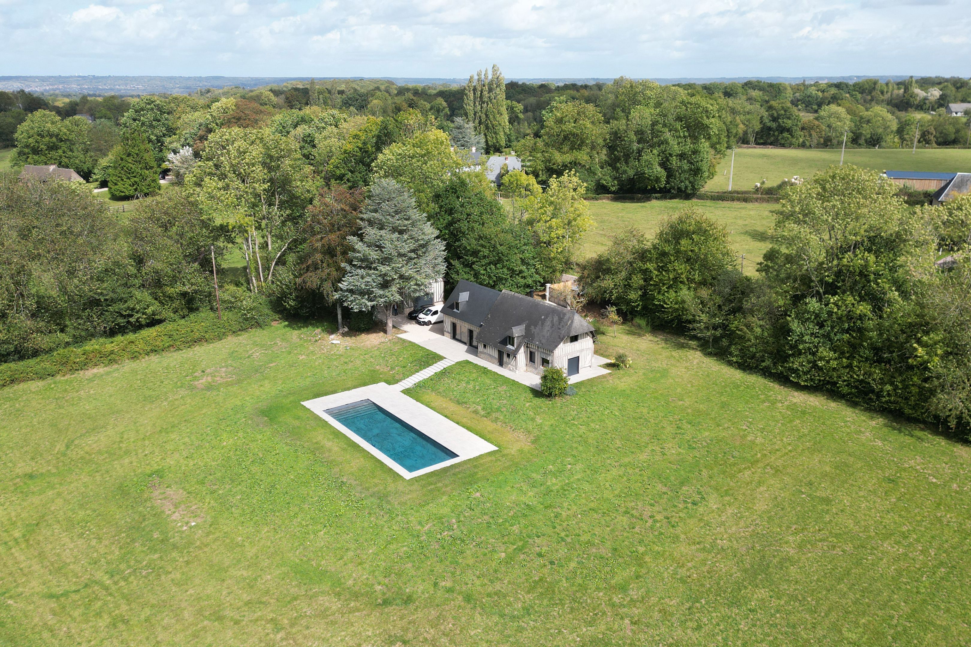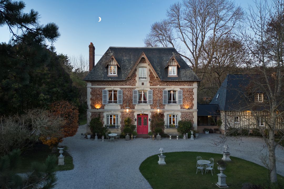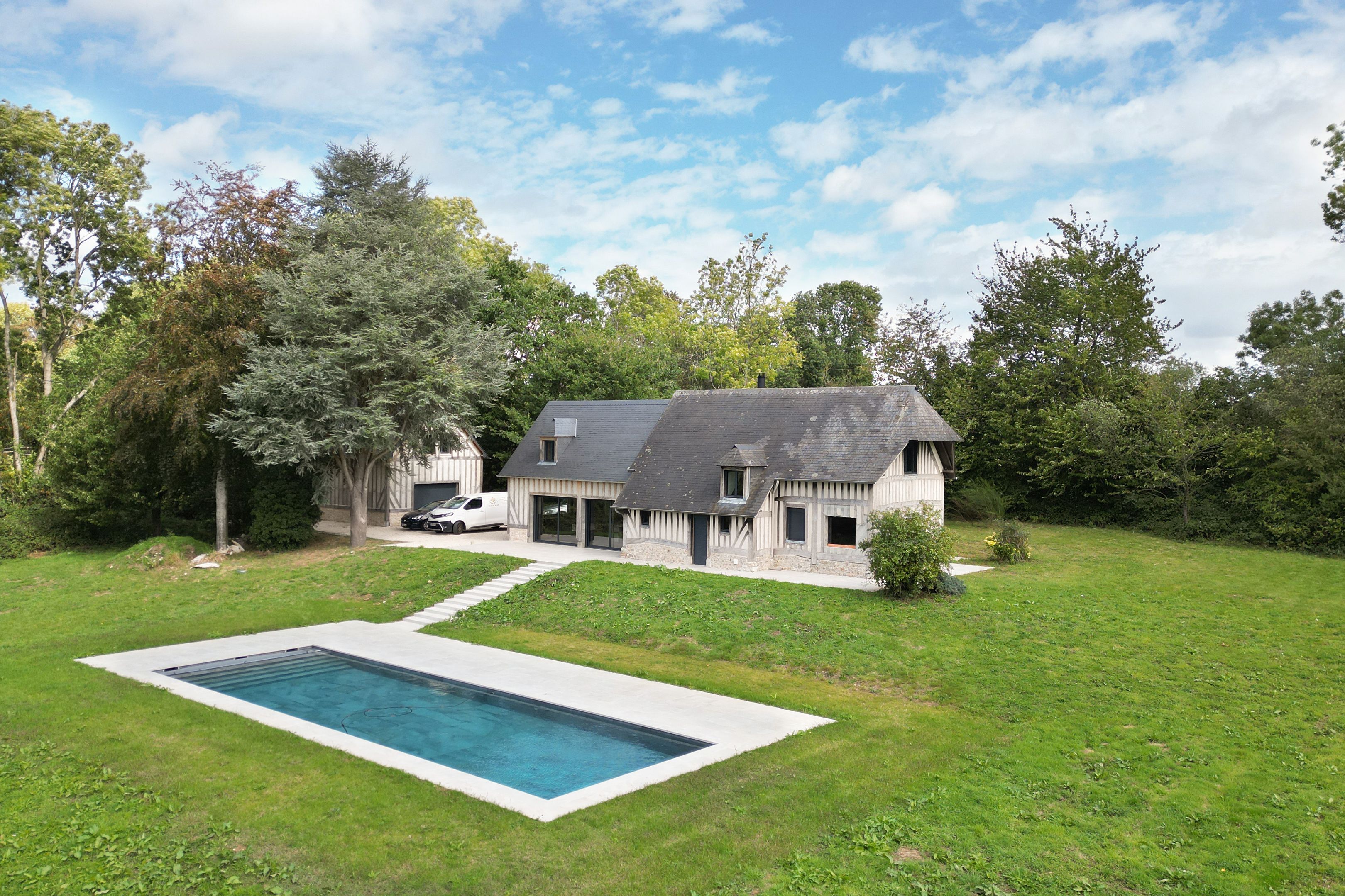 À 15min de Deauville, belle longère entièrement rénovée édifiée sur un terrain d'un hectare. Au rez-de-chaussée : entrée, pièce à vivre avec insert ouverte sur la terrasse exposée plein ouest, cuisine équipée, chambre avec salle d'eau, toilettes invités. À l'étage : trois chambres dont une avec sa salle d'eau, toilettes indépendants, salle d'eau. En sous-sol : cave avec buanderie. En dépendance : grand garage, deux chambres, salle d'eau et toilettes indépendants. Piscine chauffée de 15x5m.