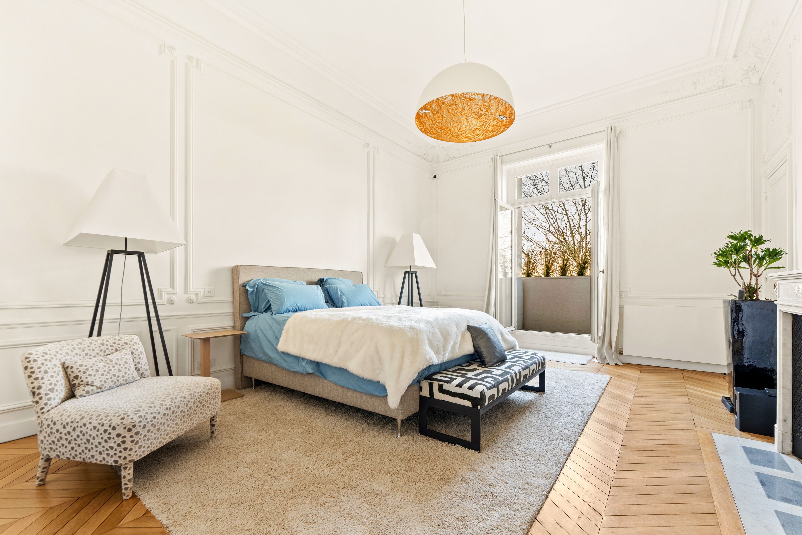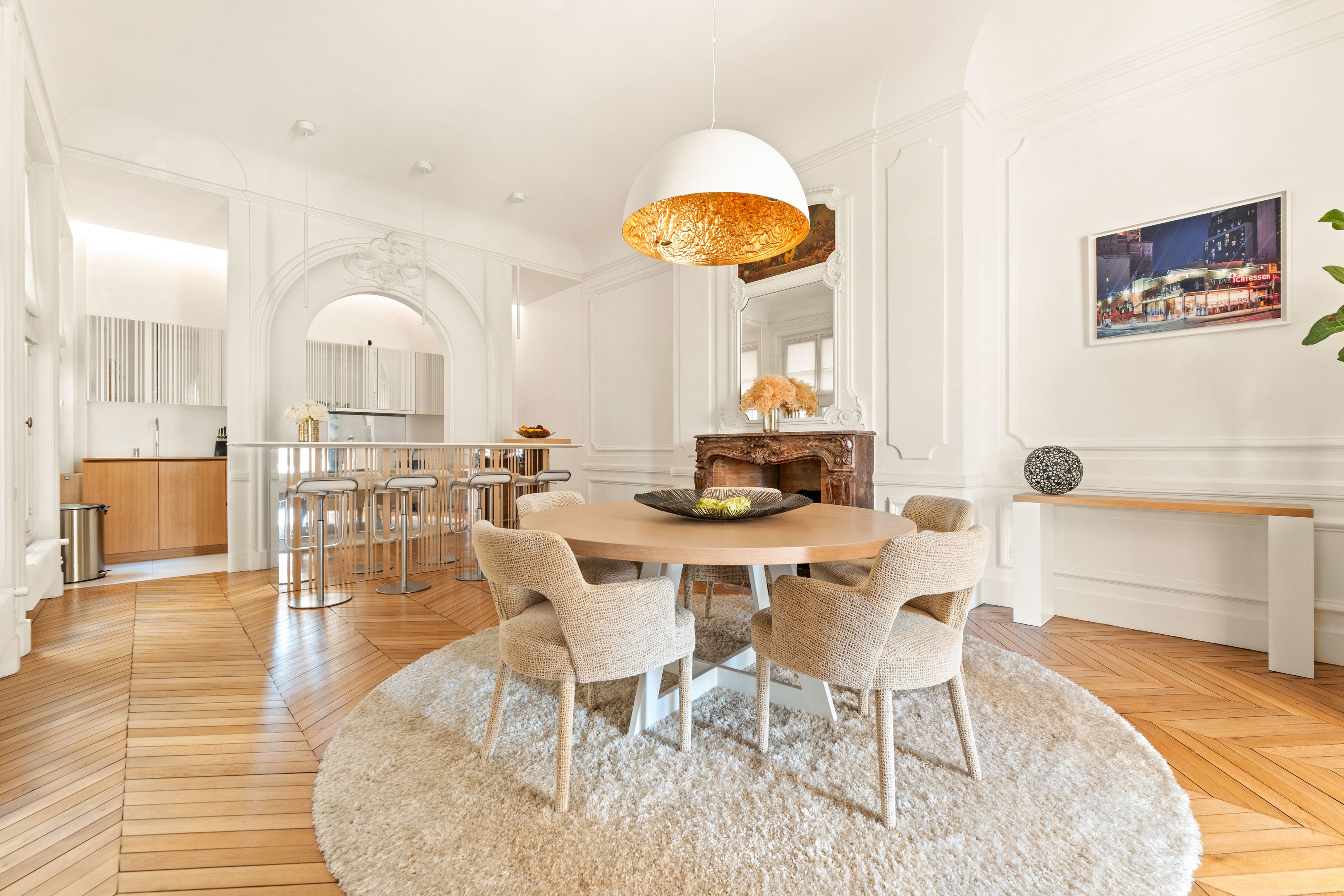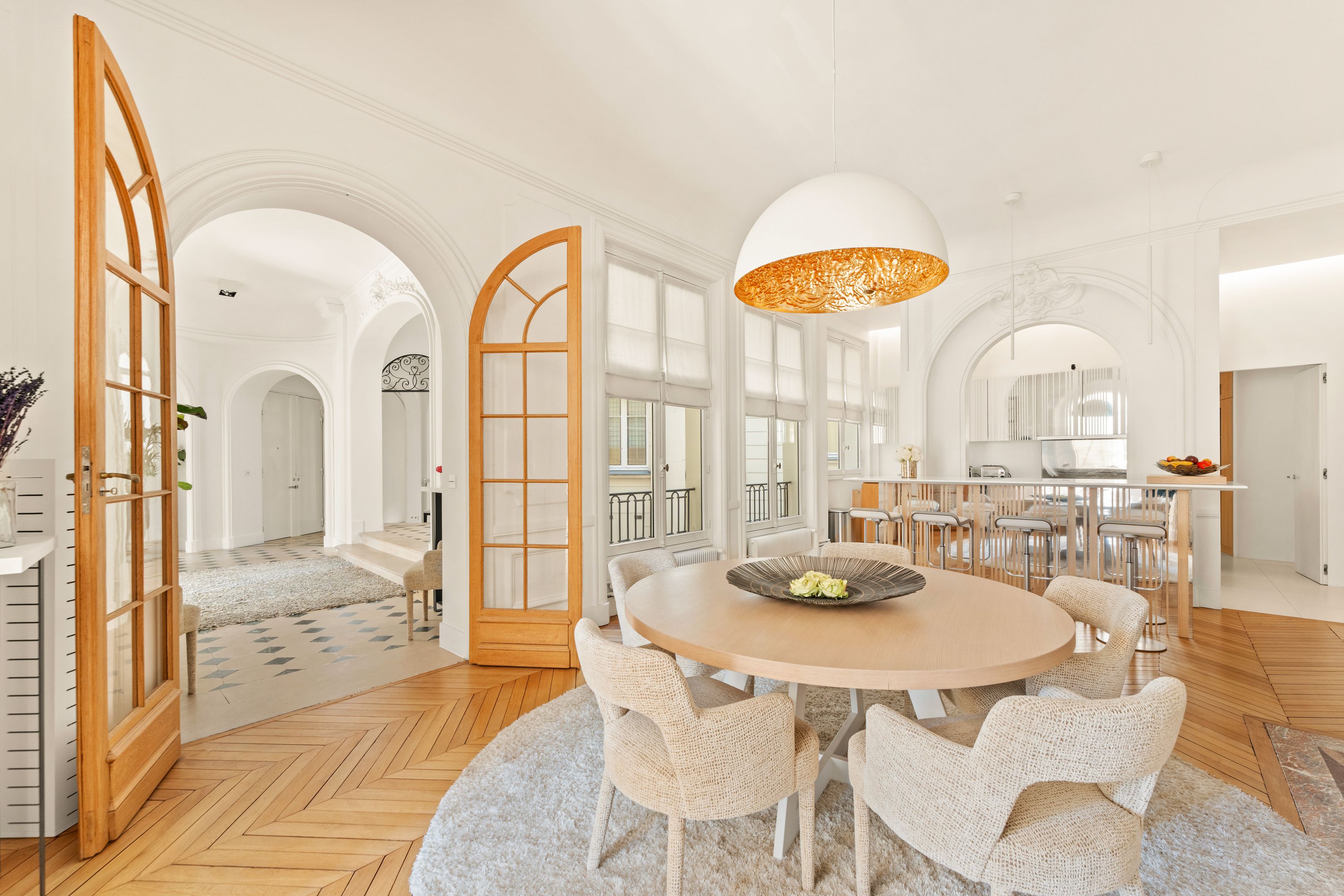 Au sein d'une superbe copropriété aux très élégantes parties communes, appartement familial et de réception de 305m² seul à l'étage, traversant, sans vis-à-vis et baigné de lumière, rénové par une architecte de renom ayant gardé tous les éléments d'origine (parquets, moulures et cheminées), très beaux volumes (hauteur sous plafond de 3,60m). À l'étage noble desservi par ascenseur, bénéficiant d'un excellent plan : galerie d'entrée, vaste salon avec balcon en pierre offrant une vue dégagée, salle à manger disposant d'une cuisine ouverte, seconde cuisine, chambre parentale avec dressing, salle d'eau dotée d'un sauna, 3 autres chambres, bureau, salle d'eau, toilettes d'invités.Cave. Chambre de service rénovée.