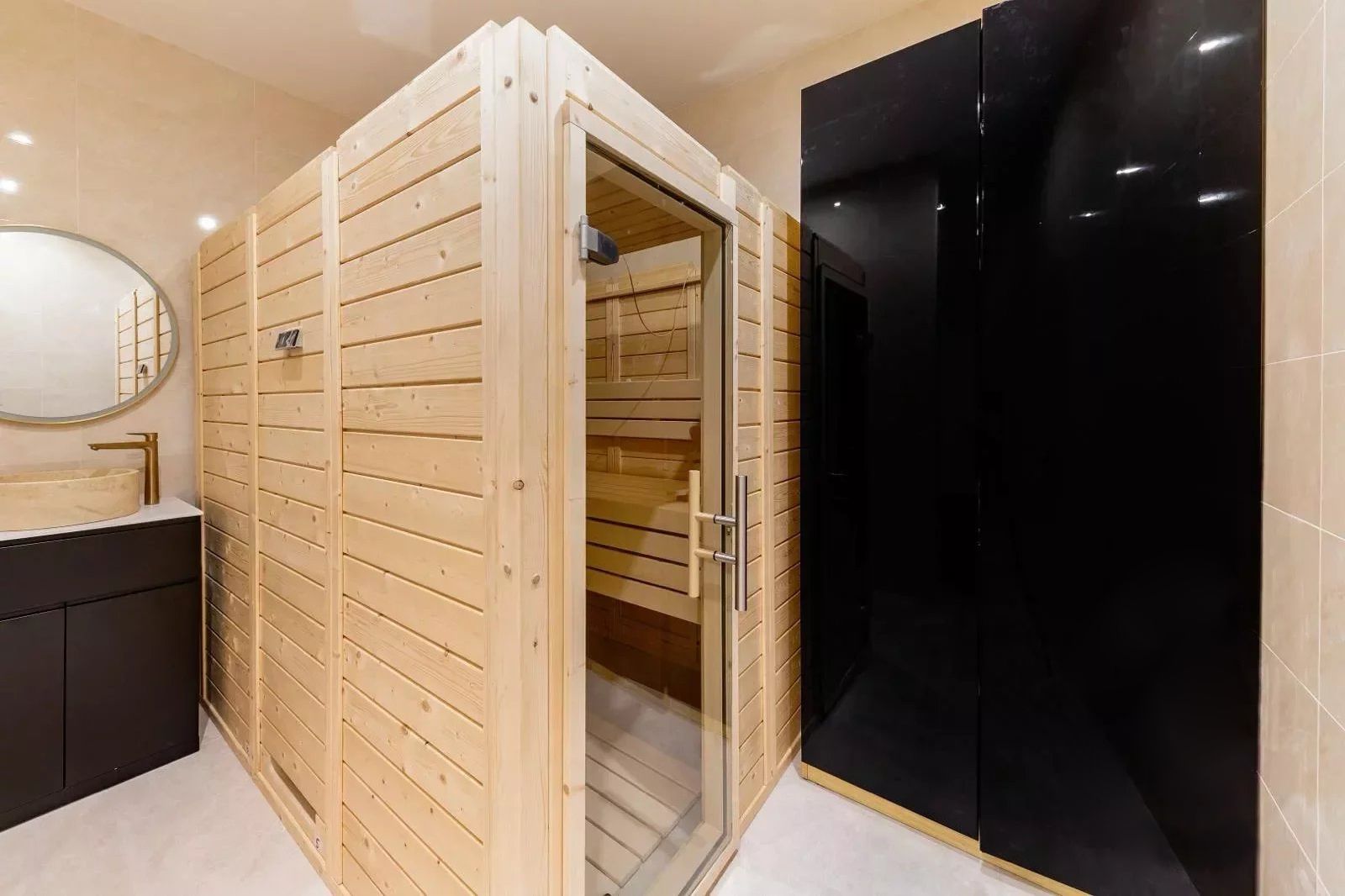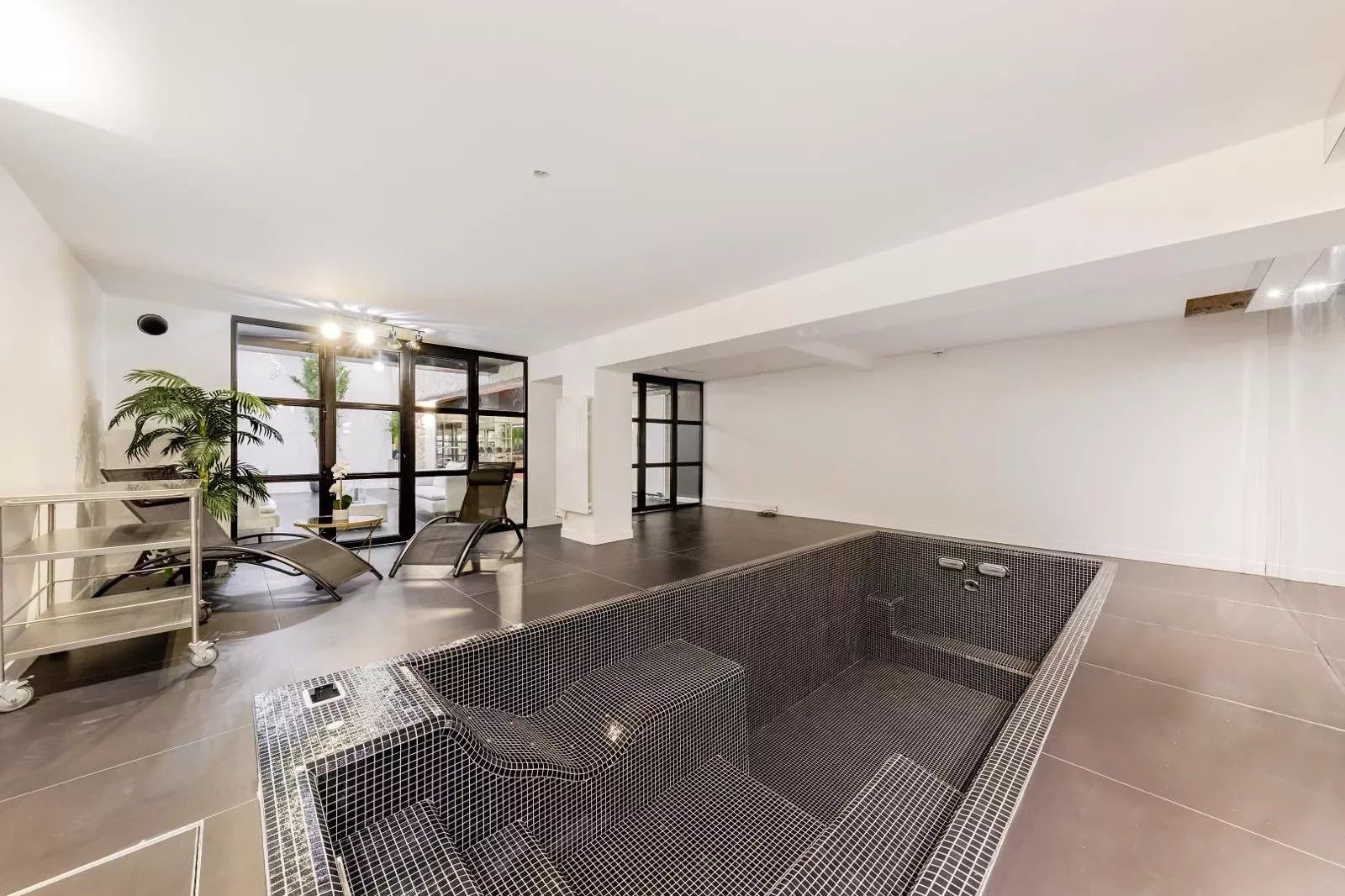 En souplex, un espace wellness - balnéothérapie avec piscine chauffée et nage à contre-courant, une salle de sport, un sauna en pierre de Bourgogne, un grand atelier de 40 m² aménageable en studio indépendant et une bibliothèque-home cinéma.