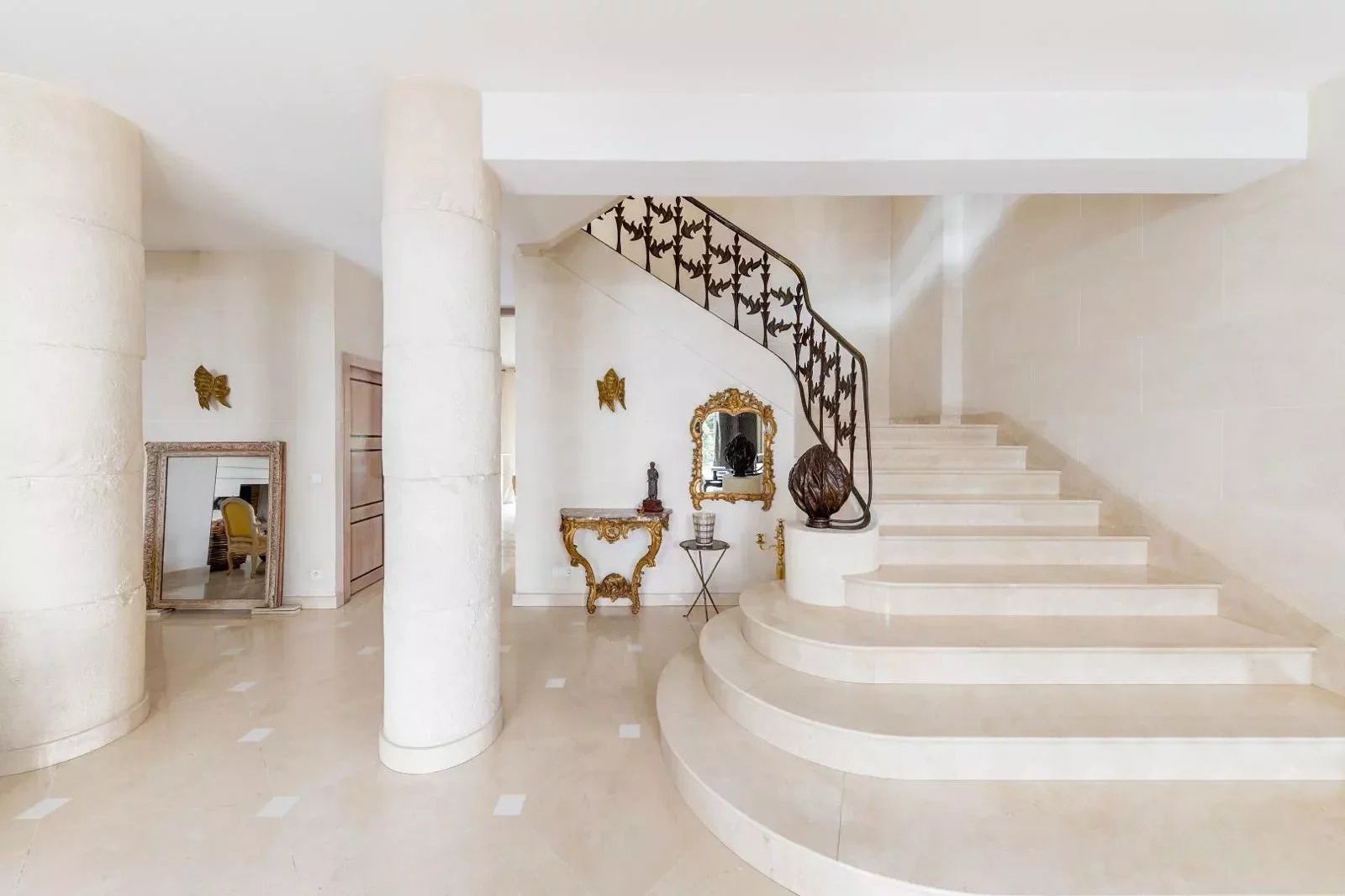 Au premier étage, par un superbe escalier en bronze de Franck Evennou, grande réception avec balcon et balustrade, salle à manger de maître, bénéficiant d'une très belle hauteur sous plafond et d'une vue sur le jardin, office reliant la cuisine.